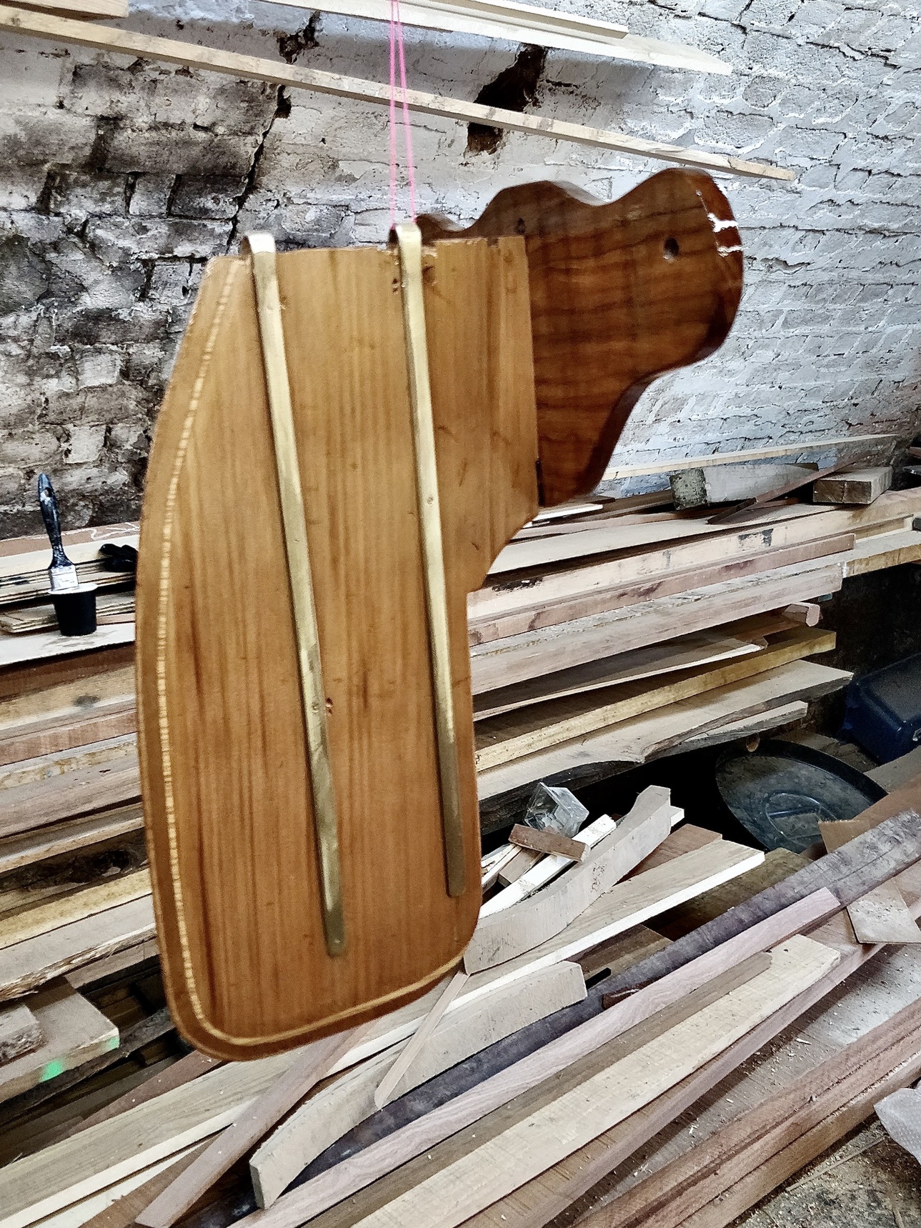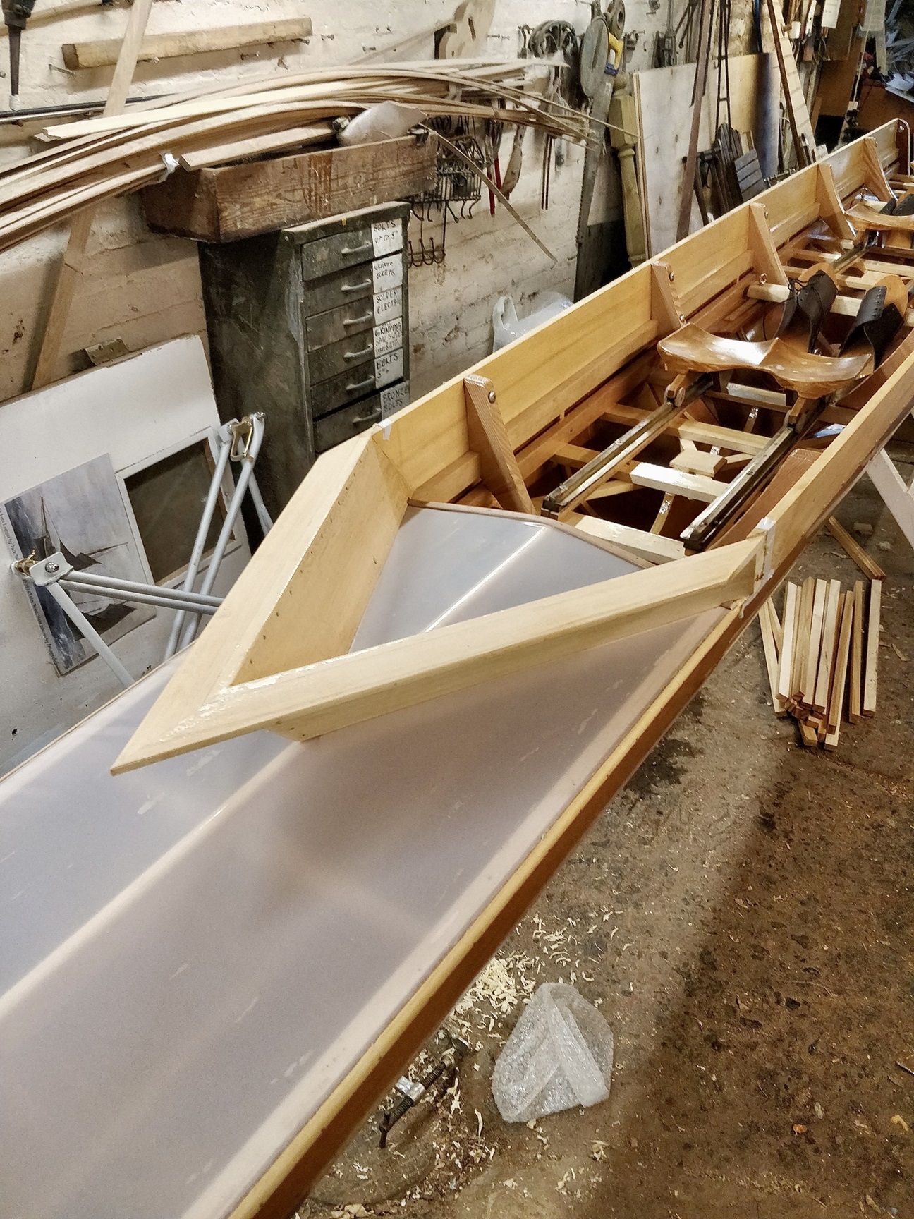 The boat was being built as a complete replica of the Pocock built Husky Clipper which was used by the winning 1936 crew featured in the Daniel James Brown’s book. The original boat still exists and hangs in the ceiling of the University of Washington boathouse. To make matters easier, the WinTech company had scanned another Pocock eight from 1937 that had survived at a US school and a detailed set of hull lines were available for Bill’s team to follow. All the details of the framing and fittings were worked out from many photographs of the original boat.