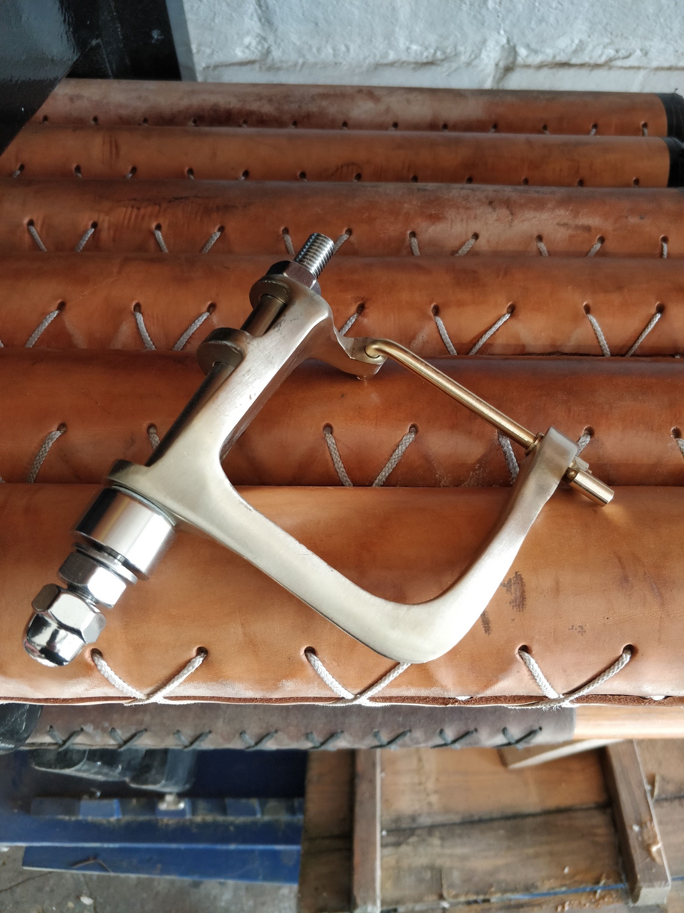 Although not actively involved in the final fitting out and finishing of the boats, I paid regular visits to check on progress. All the brass and leather fittings for the foot stretchers were fabricated, as were the period correct seats, wheels, and slide rails. It was a lot of fun to watch it come together. The two tone effect of the Western Red Cedar of the hull (custom made ply instead of the solid timber of the originals) and the pale Alaskan Yellow Cedar used for the saxboards all began to shine just like the original boat (as described in Chapter 8 of Brown’s book)