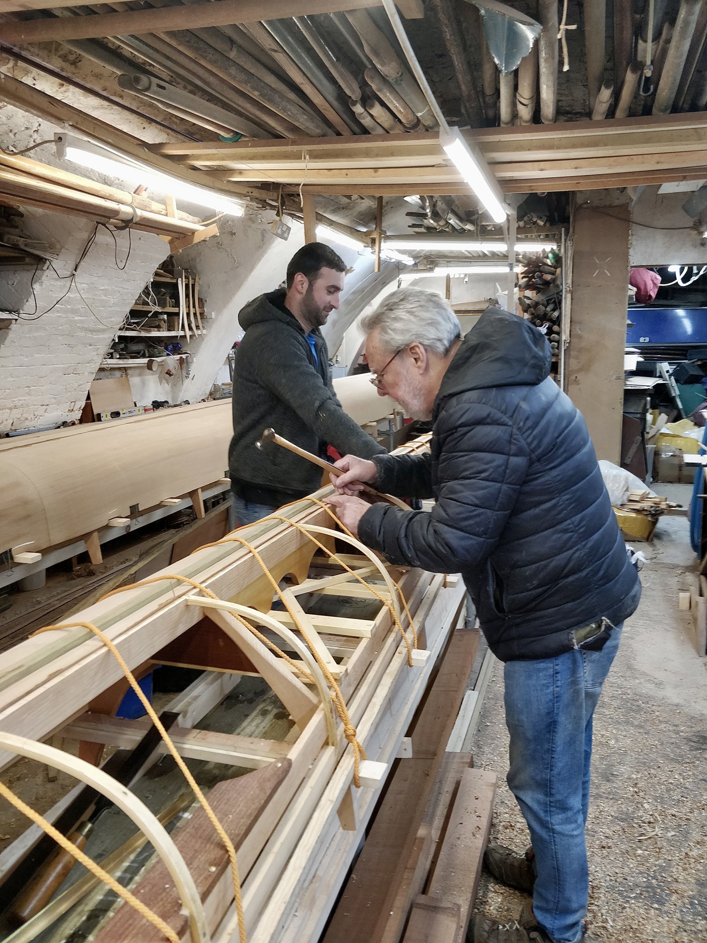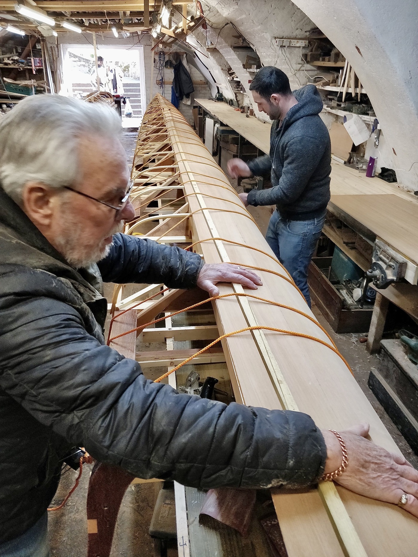 The day arrived for the first skin to be fitted and a small team joined Bill and leading boat builder Luan Qeloposhi in the vault. It takes many hands to handle such a long piece of timber ply without damaging it, so the process was carefully explained so that everyone would be able to act together. The long skin had already been cut to an approximate shape using paper templates, so it was quite easy to move it across to the frame and locate the top edge of the skin (the bottom edge in the photos as the boat is hull up while being built) in a loose slot along the outside of the frame. Then carefully pushing and bending the skin down over the curves of the hull, the edge of the skin met up with the keelson. Long timber battens held down with a rope zig-zagging along the frames helped to gently hold things in place.