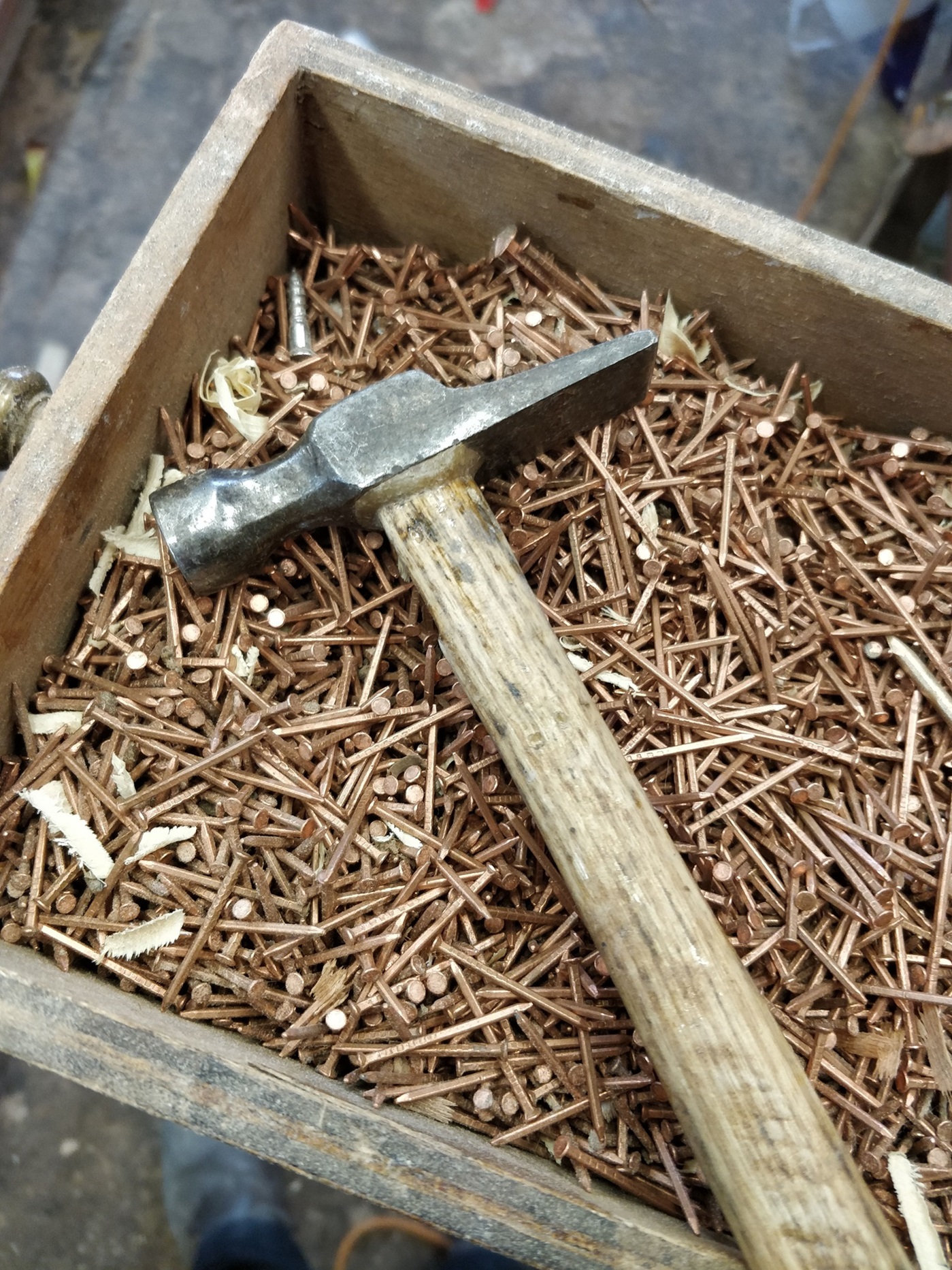 Once he was happy with the alignment the first few copper nails were hammered in by Bill, then the team went to work. The slow curing polyurethane glue was already in place, so it was just a matter of fixing the skin with copper nails at regular intervals. Working in pairs to ensure the skin was held smooth and still while the second man swung the hammer, the nails went in at a fairly steady pace. There were a few problems along the way as copper is very soft and the occasional nail would bend – a problem exacerbated by the fact that the only available nails we had to work with were too long. Extra care also had to be taken in areas such as the footwell where the keelson had no framing to support it against bouncing with each strike of the hammer. However, with some care and the occasional use of a heavy brass buck (along with the occasional use of some fruity language) the entire length of the hull section was soon done.