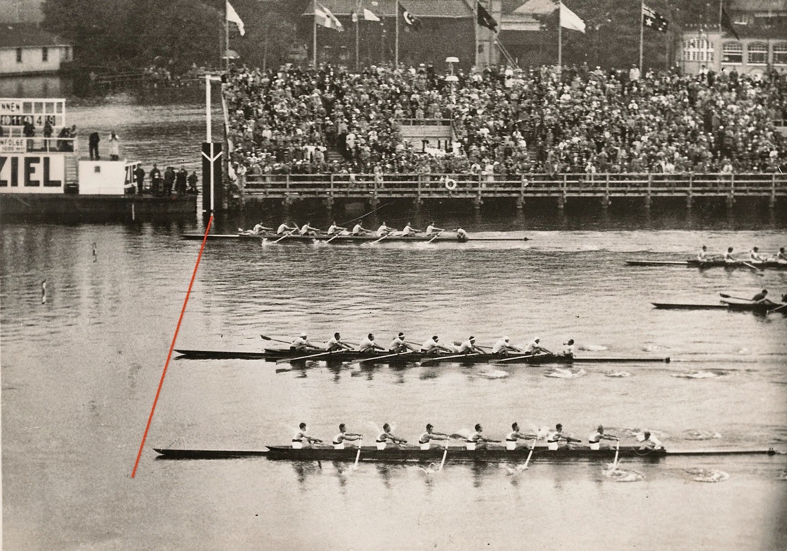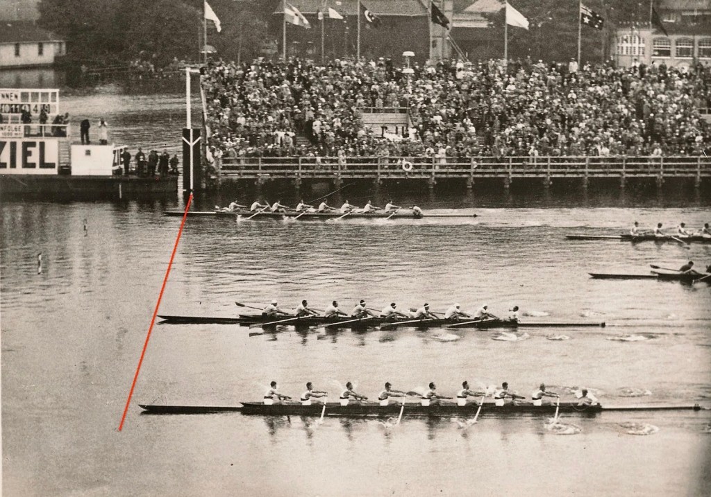 Raced over 1500m, the Eton crew was stuck in the middle of the field until, about 350m from the finish, the stroke of German crew, which had looked strong in the heats, but was now hanging onto a diminishing lead, crabbed calamitously and Eton swept through to win by a length.