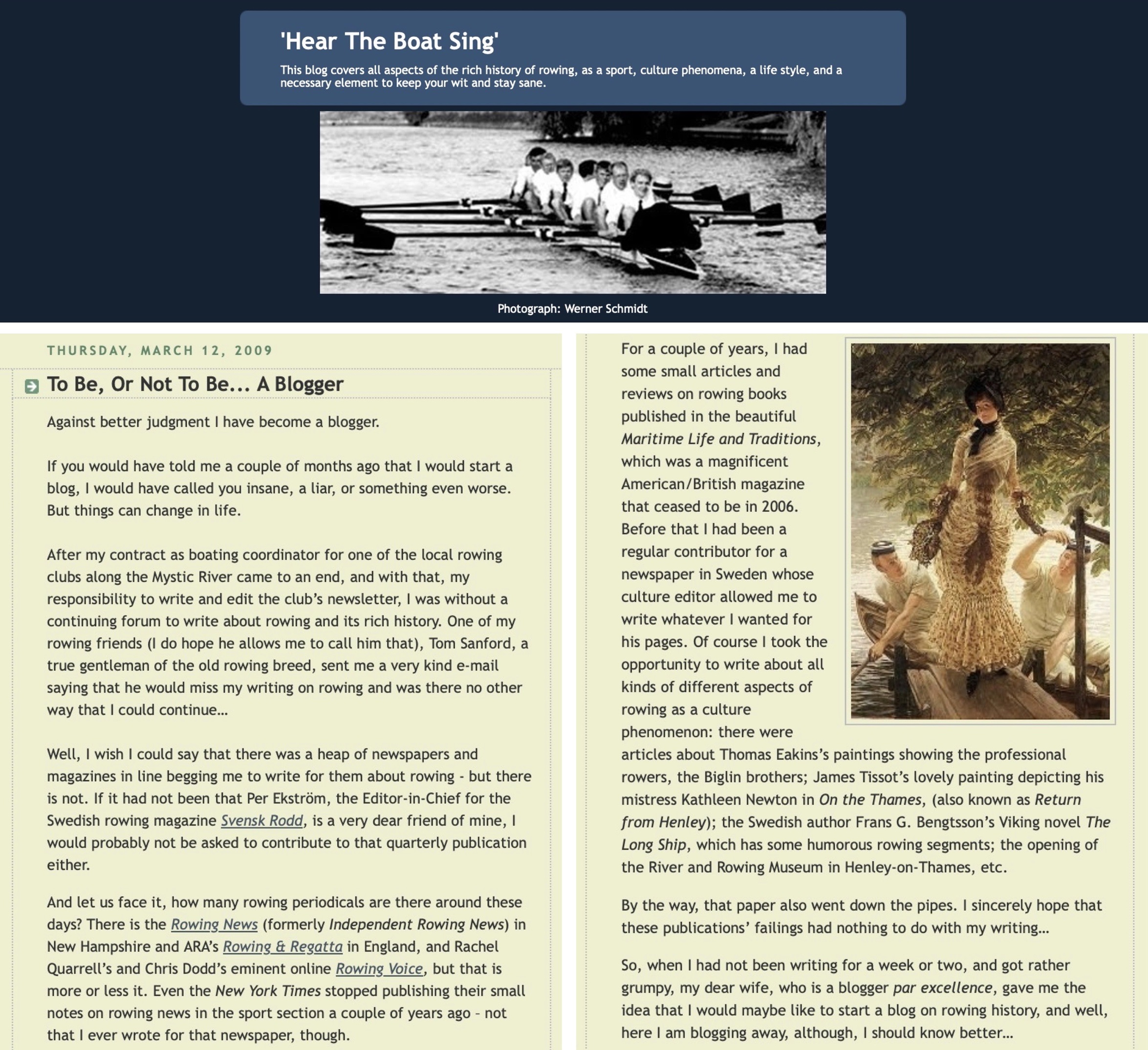 Today, 12 March 2024, is the fifteenth anniversary of the first posting on Hear The Boat Sing. From the start, its “mission statement” was to cover all aspects of the rich history of rowing, as a sport, culture phenomena, a life style, and a necessary element to keep your wit and stay sane. I think it has done a rather good job in keeping to these aims.