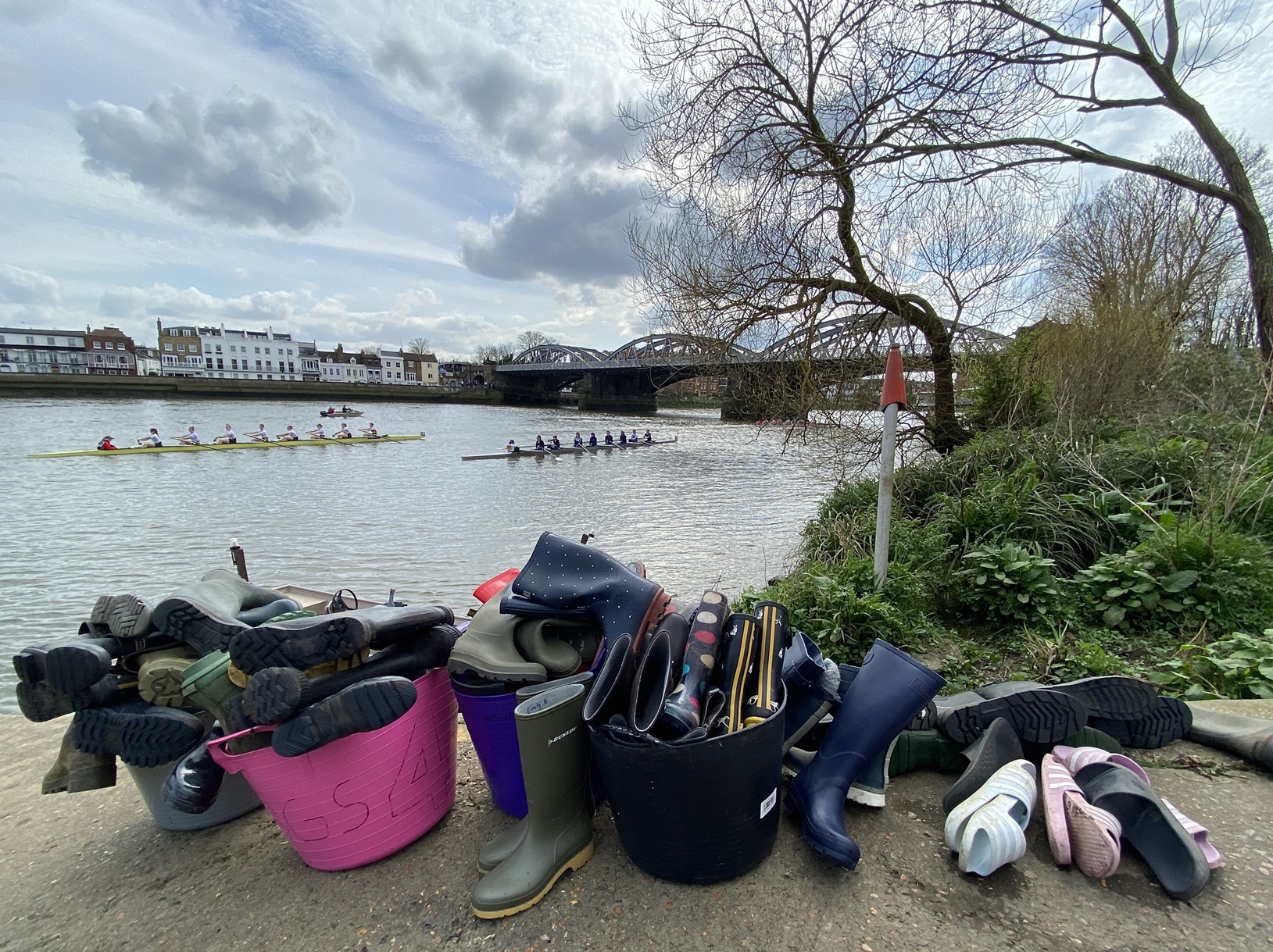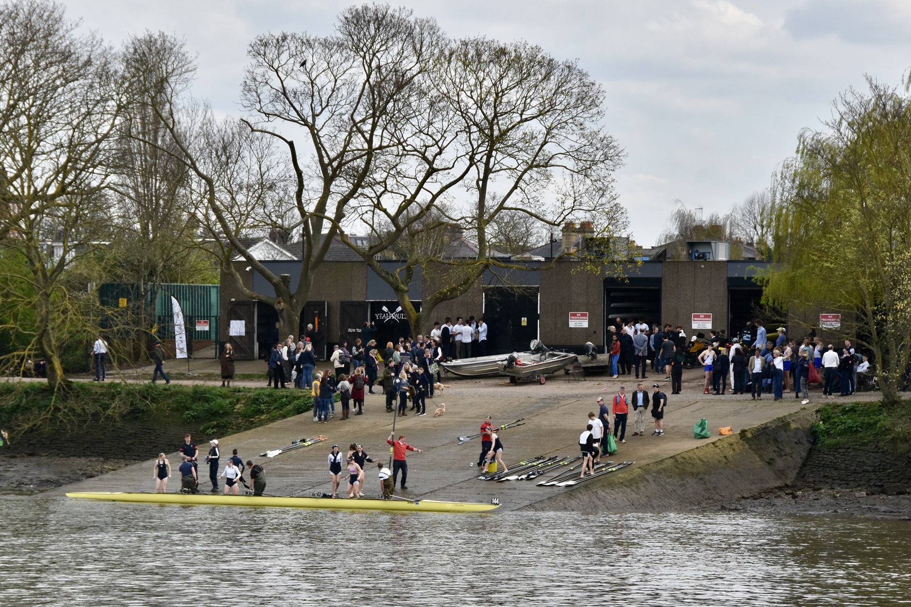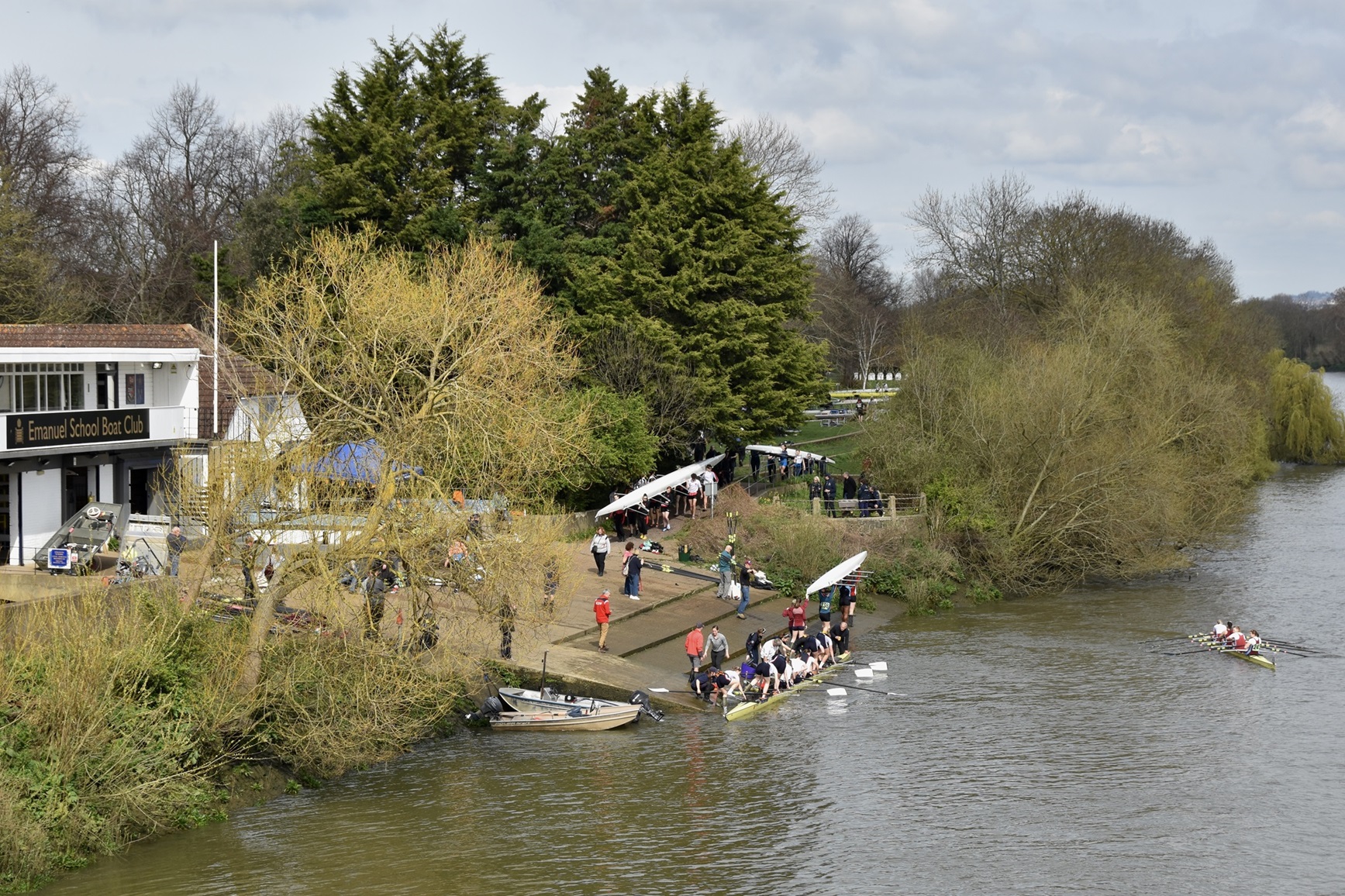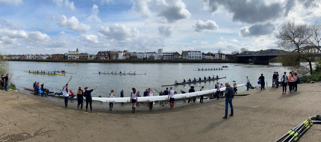 Going afloat from the hard outside Emanuel School BC, Barnes Bridge Ladies RC and Cygnet RC for the start of the 2024 Schools’ Head held on 20 March.