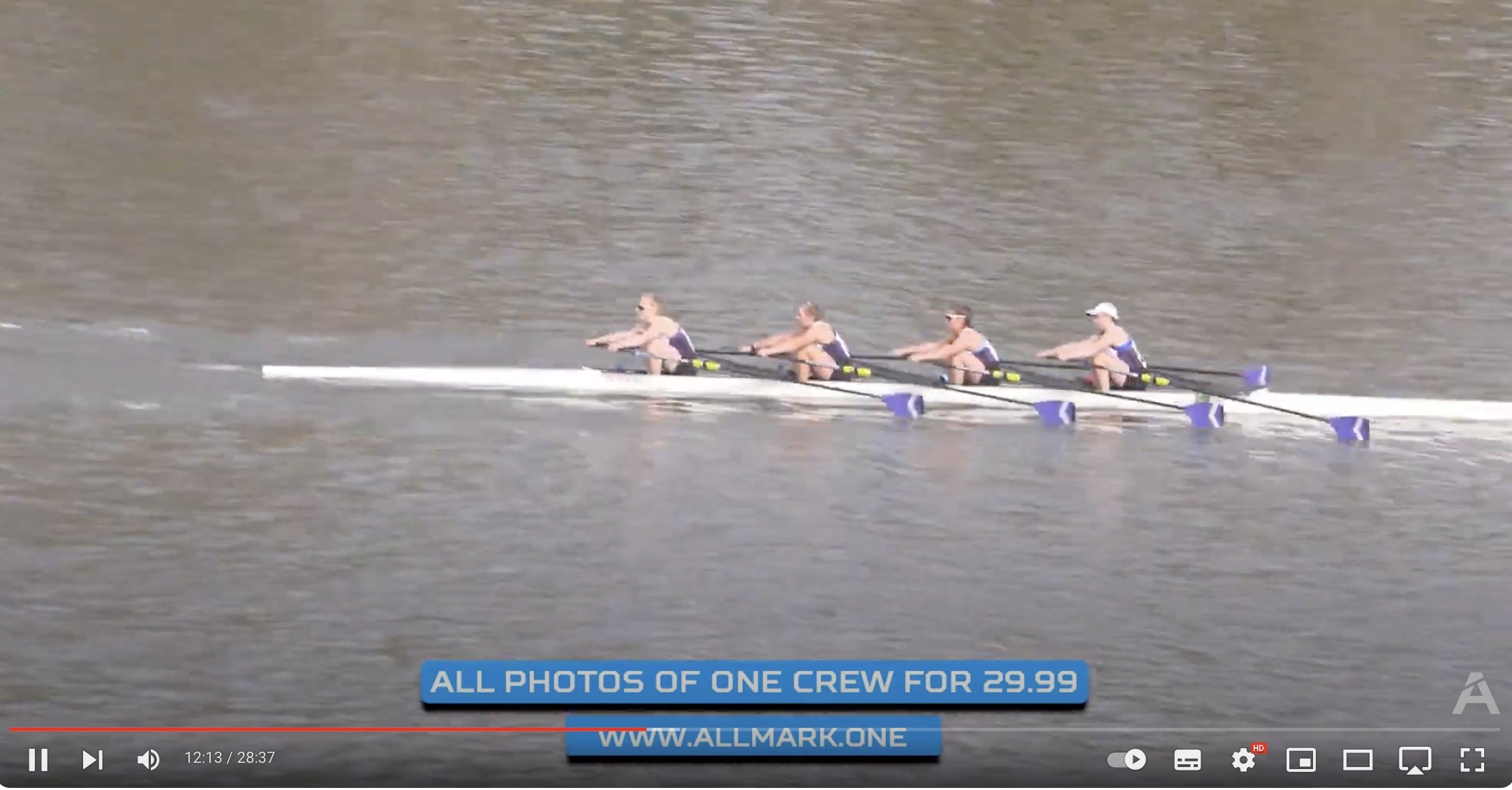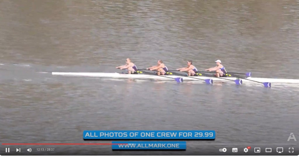 Boys’ Championship Eights won by Crew 3, St Paul’s School, in a record time of 16.24.0.Girls’ Championship Eights won by Crew 135, Headington School, in a time of 18.09.5.Boys’ Championship Quads won by Crew 88, Tideway Scullers, in a time of 17.22.3.Girls’ Championship Quad won by Crew 226, Wycliffe College, in a time of 18.15.4, thirty-seven seconds ahead of the next crew and taking 1 minute 2 seconds off the course record. They were the third fastest girls’ boat and only two girls’ eights recorded better times. Screenshot from the YouTube coverage, better pictures are on the All Mark One site.