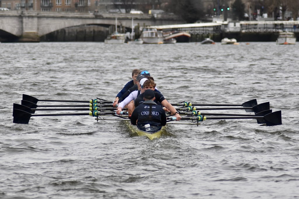 In racing against other clubs in January and February Oxford performed very well. Against Leander Club, made up of athletes on the fringe of the British team, Oxford demonstrated a strong racing start and showed resilience by extending their early lead in the middle sections of their race. The race with Leander was marred by clashes and disciplinary issues, with Oxford involved in incidents leading to warnings and a significant clash, which resulted in Leander’s disqualification by Umpire, Sir Matthew Pinsent.