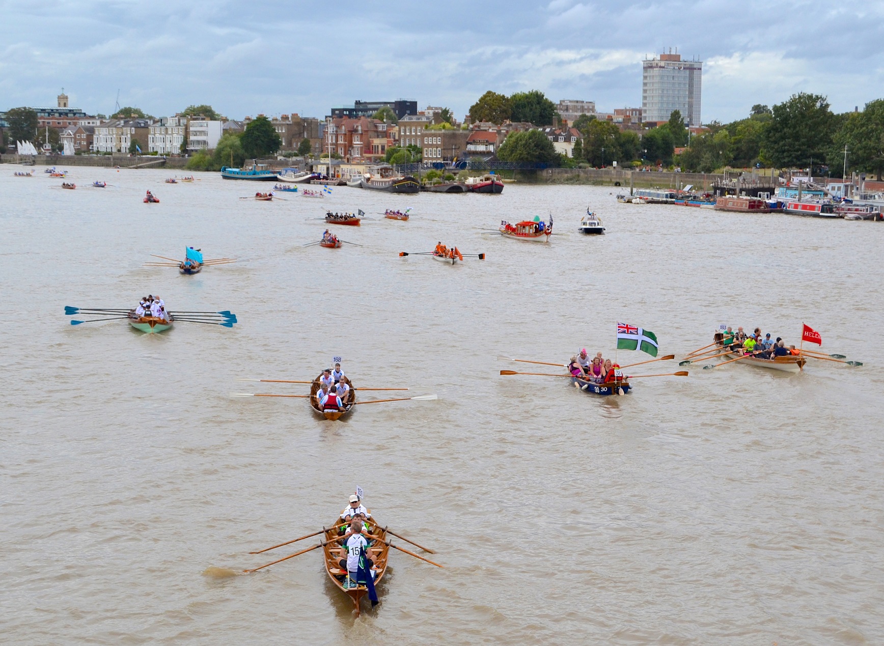 The Great River Race is an event for traditional and traditional-style boats, powered by a minimum of four oars or paddles. Sliding seats and outriggers, banned for many years, are now allowed. Each boat must be coxed and, in keeping with the Watermen’s role as the taxi drivers of the Thames, must carry a passenger.