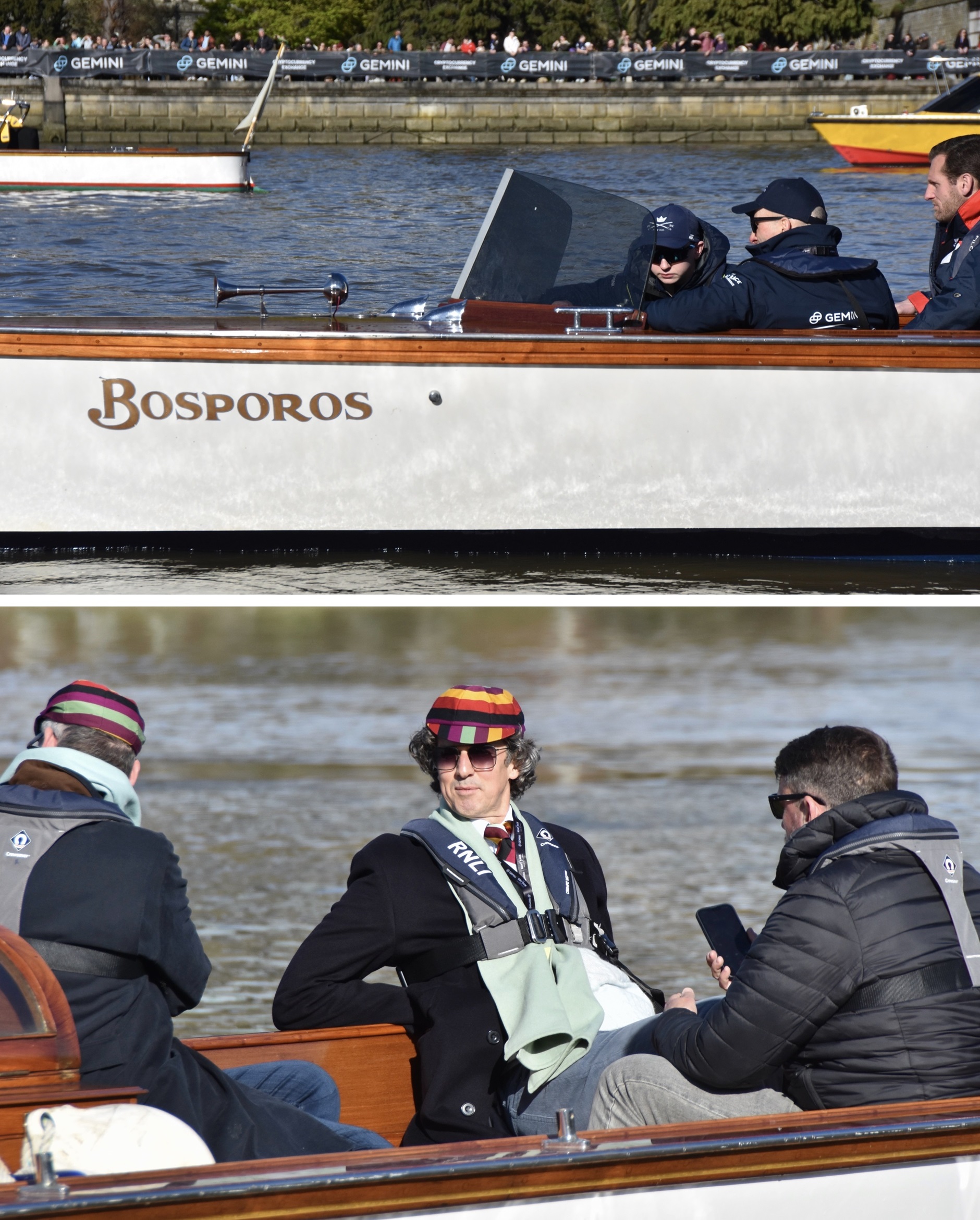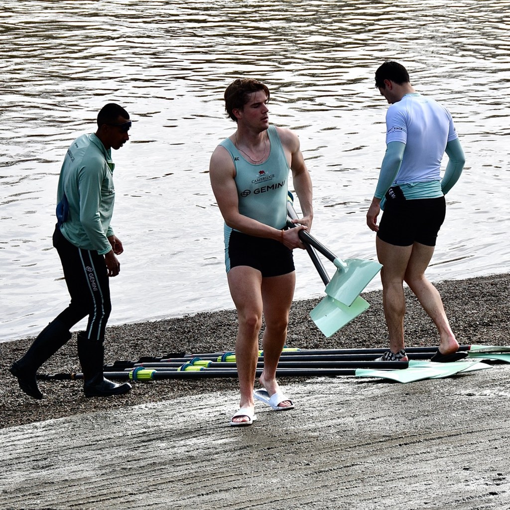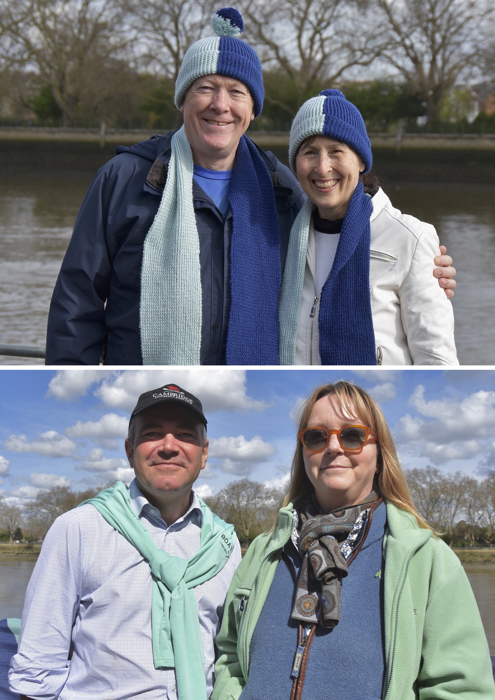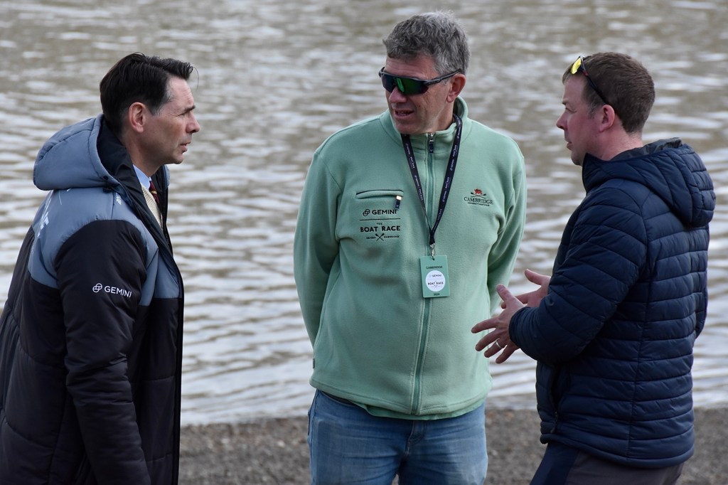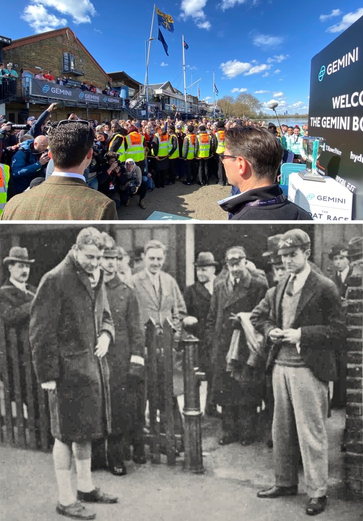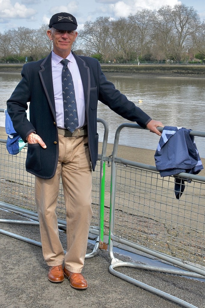 Donald Legget (CUBC 1963 and 1964) has been actively involved with Cambridge’s Boat Race preparations for a remarkable 61 years.Possibly, Matthew Holland (CUWBC 2017, CUBC 2019) intends to break Donald Legget’s record. He is one of the BBC’s Boat Race commentators and is on the Boat Race Umpires’ Panel. Although a Doctoral Student at Oxford since 2020, Holland shows no signs of coxing for the Dark Side.Nick Holland (no relation to Matthew as far as I know) rowed for Isis in 1980 and Oxford in 1982. Unfortunately, fewer and fewer Old Blues of both shades are wearing their hard won blazers on Boat Race Day. At worst, they get their style tips from Luke Juckett (CUBC 2014, 2015 and 2016) as pictured here in 2019.The 2024 Women’s Boat Race umpire, Richard Phelps (CUBC 1993, 1994, 1995). As things later transpired, he was to need all his experience to rule on an incident during the race. Video playback eventually proved him correct.Proud parents, split loyalties. In the top picture are the parents of Gemma King, who was the Cambridge bow, and of her twin sister, Catherine, who was in the “2” seat for Oxford’s Osiris. Remarkably, both girls won. In the lower picture are the parents of the Cambridge men’s cox, Ed Bracey. Dad, Andrew, coxed Cambridge in 1991. Mum, Victoria, coxed the Oxford’s Isis, in 1991. Victoria was uncomfortable donning the Light Blue for the day, but mothers do make such sacrifices for their children.A Cambridge supporter gives a new meaning to the phrase, “Grin and bear it.”Men of Kent. Ben Kent (right) has been the race finish judge for twenty-five years. His flagman on the opposite bank is his son, Josh (left).
