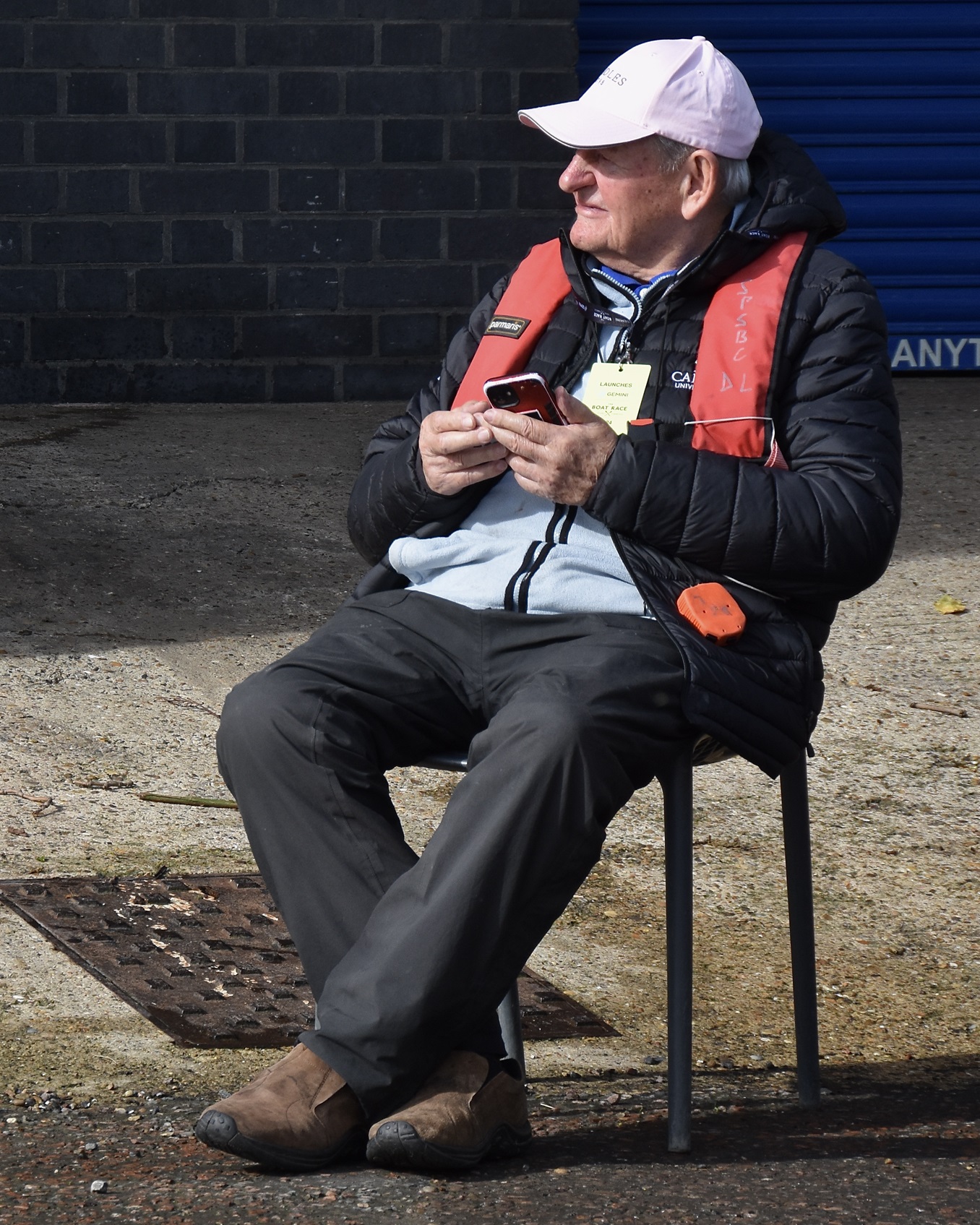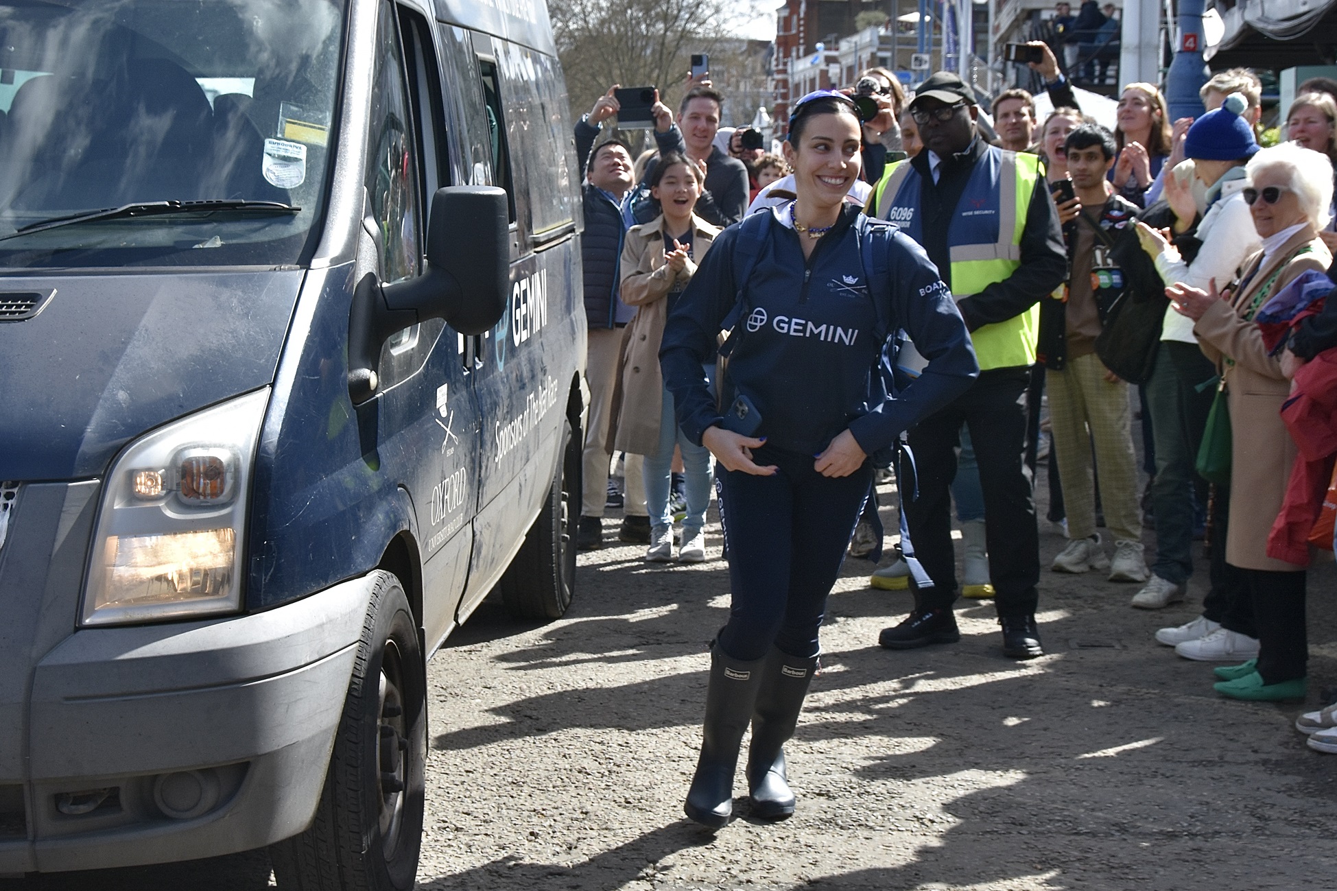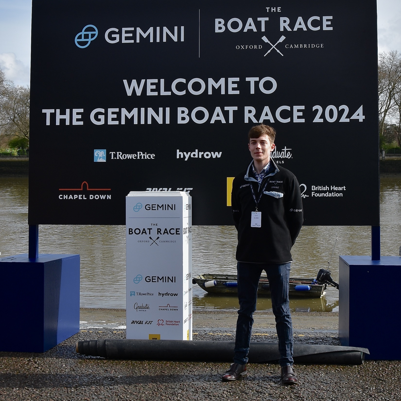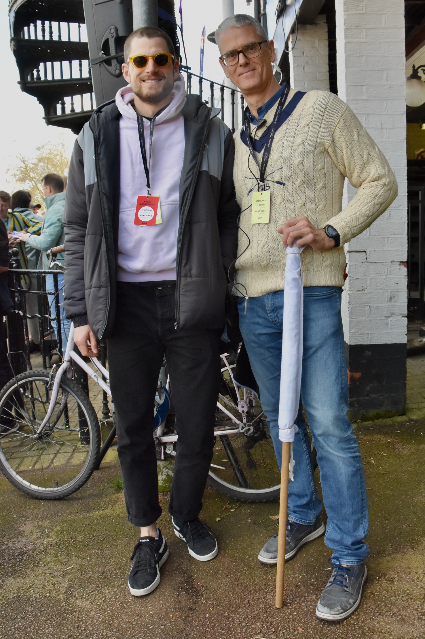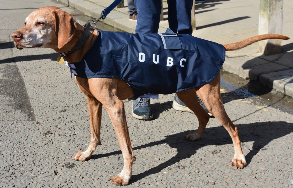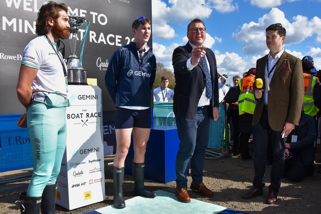 Donald Legget (CUBC 1963 and 1964) has been actively involved with Cambridge’s Boat Race preparations for a remarkable 61 years.Possibly, Matthew Holland (CUWBC 2017, CUBC 2019) intends to break Donald Legget’s record. He is one of the BBC’s Boat Race commentators and is on the Boat Race Umpires’ Panel. Although a Doctoral Student at Oxford since 2020, Holland shows no signs of coxing for the Dark Side.Nick Holland (no relation to Matthew as far as I know) rowed for Isis in 1980 and Oxford in 1982. Unfortunately, fewer and fewer Old Blues of both shades are wearing their hard won blazers on Boat Race Day. At worst, they get their style tips from Luke Juckett (CUBC 2014, 2015 and 2016) as pictured here in 2019.The 2024 Women’s Boat Race umpire, Richard Phelps (CUBC 1993, 1994, 1995). As things later transpired, he was to need all his experience to rule on an incident during the race. Video playback eventually proved him correct.Proud parents, split loyalties. In the top picture are the parents of Gemma King, who was the Cambridge bow, and of her twin sister, Catherine, who was in the “2” seat for Oxford’s Osiris. Remarkably, both girls won. In the lower picture are the parents of the Cambridge men’s cox, Ed Bracey. Dad, Andrew, coxed Cambridge in 1991. Mum, Victoria, coxed the Oxford’s Isis, in 1991. Victoria was uncomfortable donning the Light Blue for the day, but mothers do make such sacrifices for their children.A Cambridge supporter gives a new meaning to the phrase, “Grin and bear it.”Men of Kent. Ben Kent (right) has been the race finish judge for twenty-five years. His flagman on the opposite bank is his son, Josh (left).