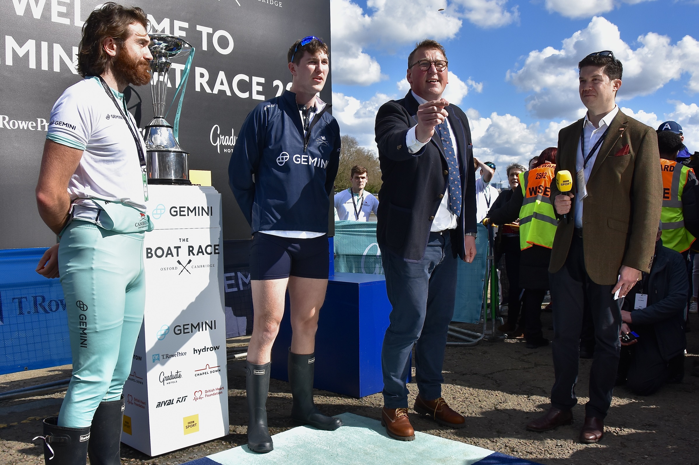 The coin toss for stations in 2024 was a little more choreographed than it was one hundred years earlier in 1924.Men’s race umpire Matthew Pinsent spins the 1829 gold sovereign that was presented by the BBC’s “Voice of the Boat Race” between 1931 and 1980, John Snagge.The CUBC Men’s President, Seb Benzecry.Oxford was represented by James Doran, who won the toss and chose Surrey.