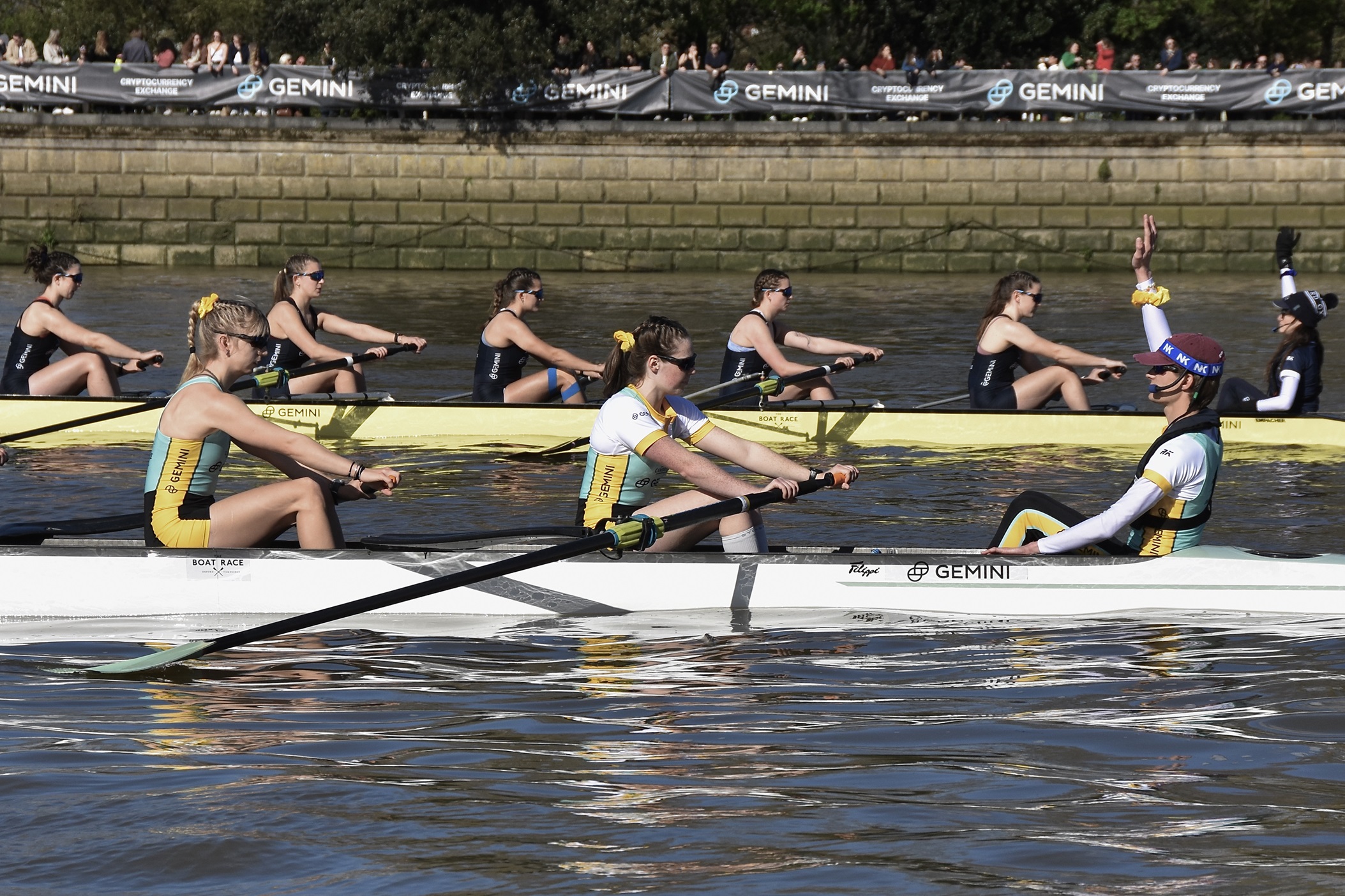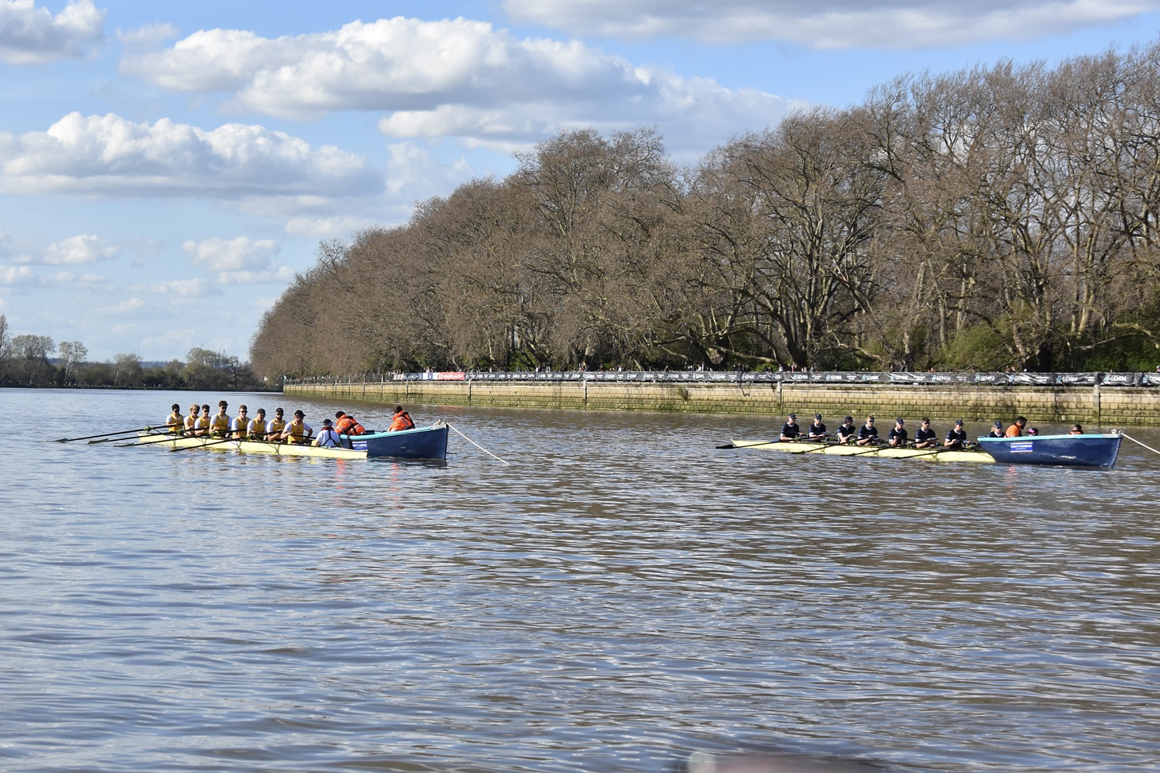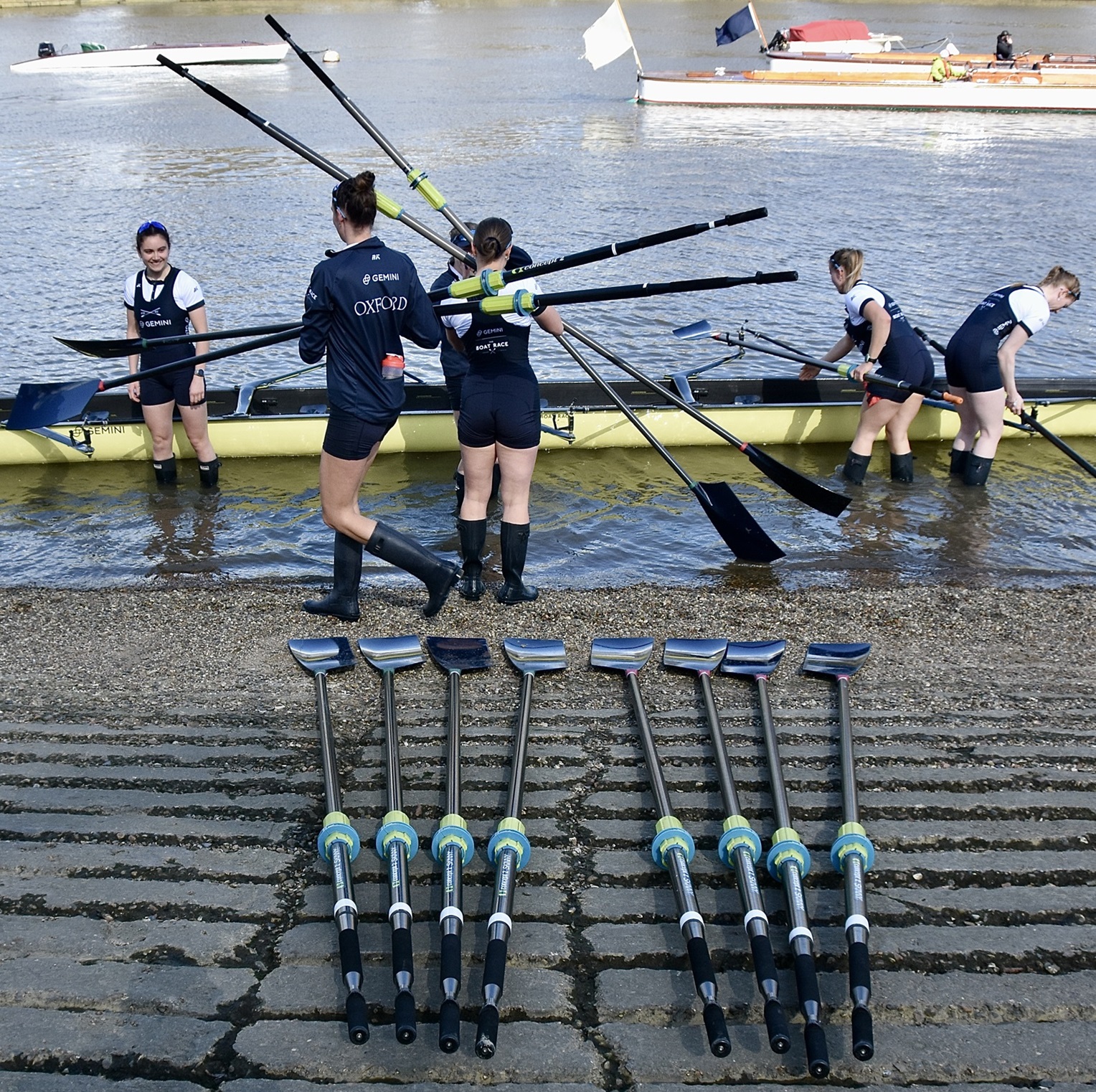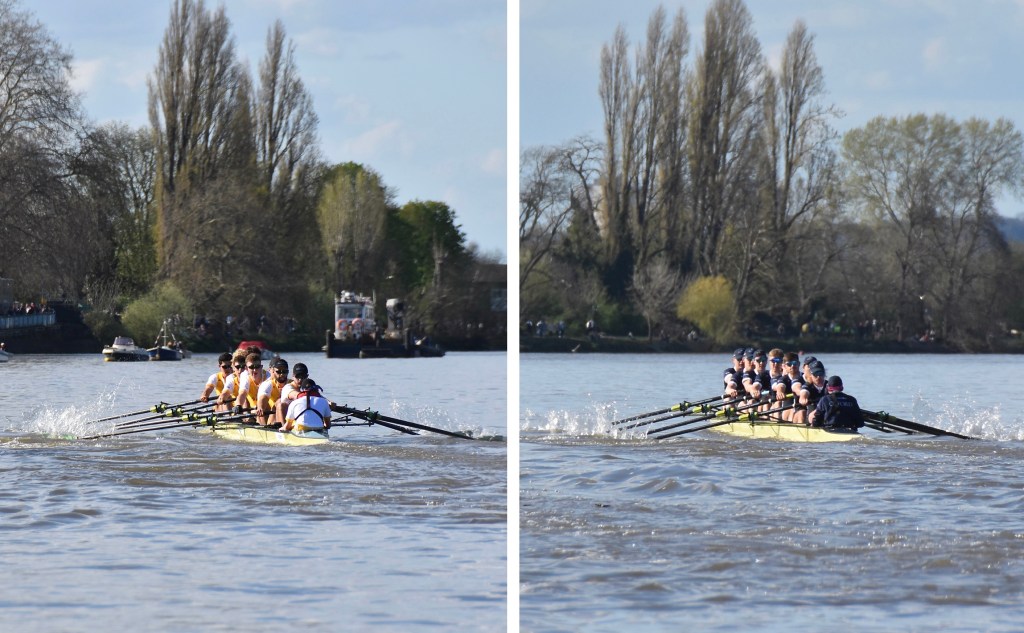 The “Hard” at Putney Embankment awaits the crews. Oxford did row with straight oars, the bending effect is a result of my cameraphone’s “panorama” mode.Last minute clarifications between the Women’s Race umpire, Richard Phelps (left) and the two women’s Blue Boat coaches, Paddy Ryan (Cambridge, centre) and Allan French (Oxford, right).On the balcony of the Oxford Women’s base at Imperial College Boat Club, Oxford stroke Annie Anezakis awaits the call to arms.Cambridge go afloat from their base at Thames Rowing Club.Oxford draw blades.Oxford Women’s coach, Allan French, gave each of his girls a “fist bump” before they boated. Here he is with President Ella Stadler.Putney viewed from the press boat. I was allocated a seat in the press launch following the men’s race, the last of the day’s four races, so I would see little of the rest.The start of the Women’s Race.The Women’s Reserves Race on the start. Nearest the camera is Blondie (Cambridge) and in the foreground is Osiris (Oxford).The first stroke of the Women’s Reserves Race.The Men’s Reserves on the start. On the left is Goldie (Cambridge) and on the right is Isis (Oxford).Goldie and Isis a few strokes into their race.Top: In the Oxford launch, Bosporos, are the men’s coach, Sean Bowden (centre), and President, Louis Corrigan (left). Below: In the Cambridge launch, Amaryllis, are men’s coach, Rob Baker, and two Old Blues in the colourful caps and ties of the non-rowing rowing club, the Cambridge Archetypals. In the middle is Stephen Peel, CUB 1985, 1986, 1987, who founded Infinity Boat Club.Oxford on the stake boat.