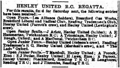 Open Senior Sculls. J Arlett, Henley United (holder); A E Hammerten, Twickenham RC; A Trimmings, Henley United; J Rough, Oxford; and A MacDonal, Twickenham RC. Open Junior Fours.-Henley United (Robson’s crew), Reading Tradesmen’s R. O, Henley United (Marshall’s crew), and “The Lads” Oxford.
