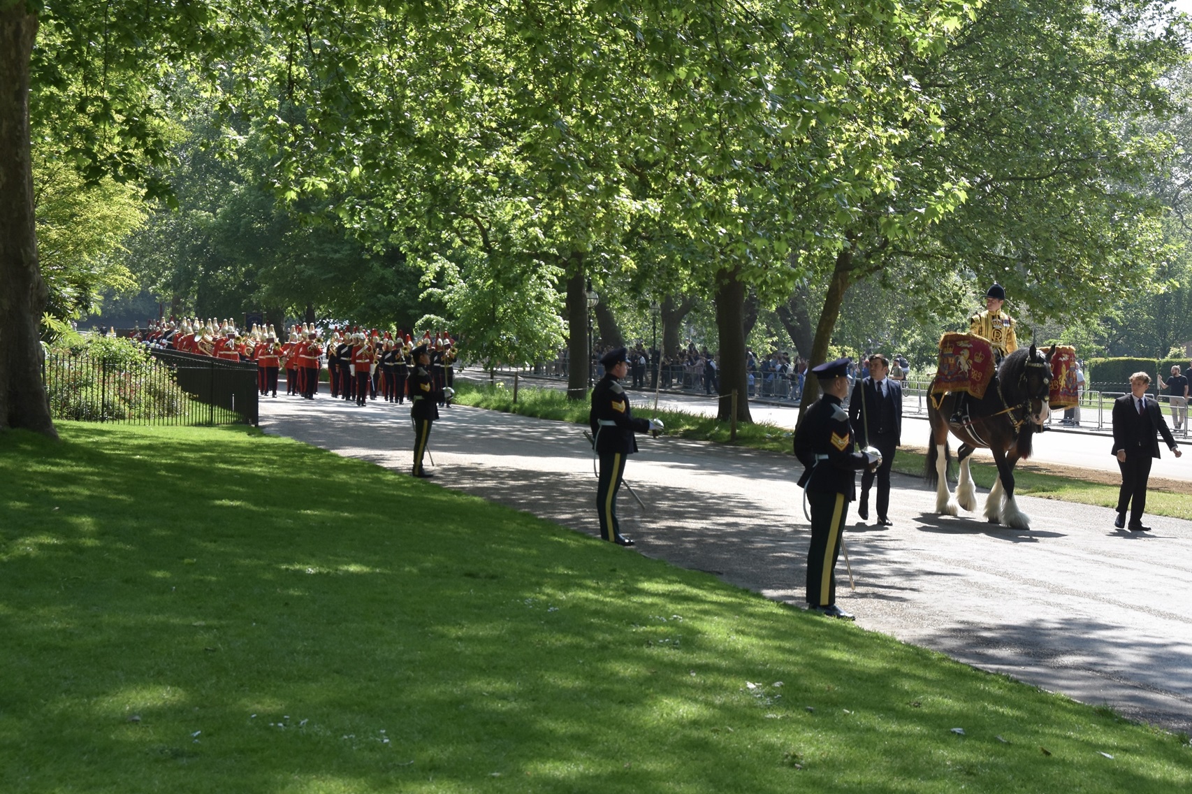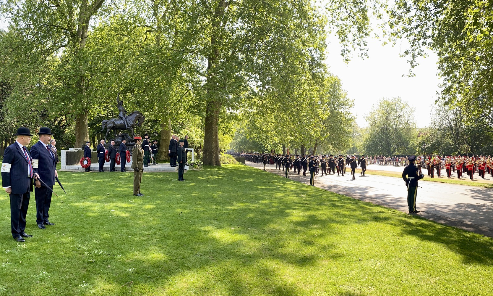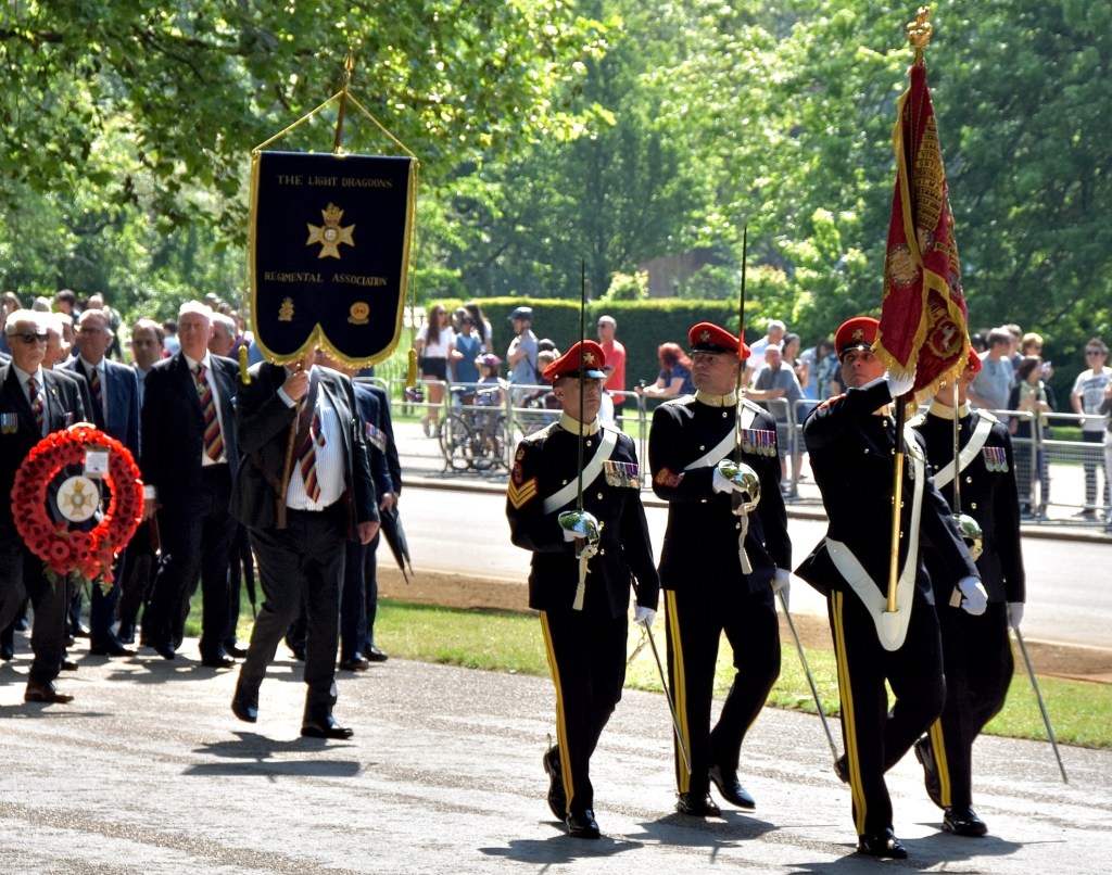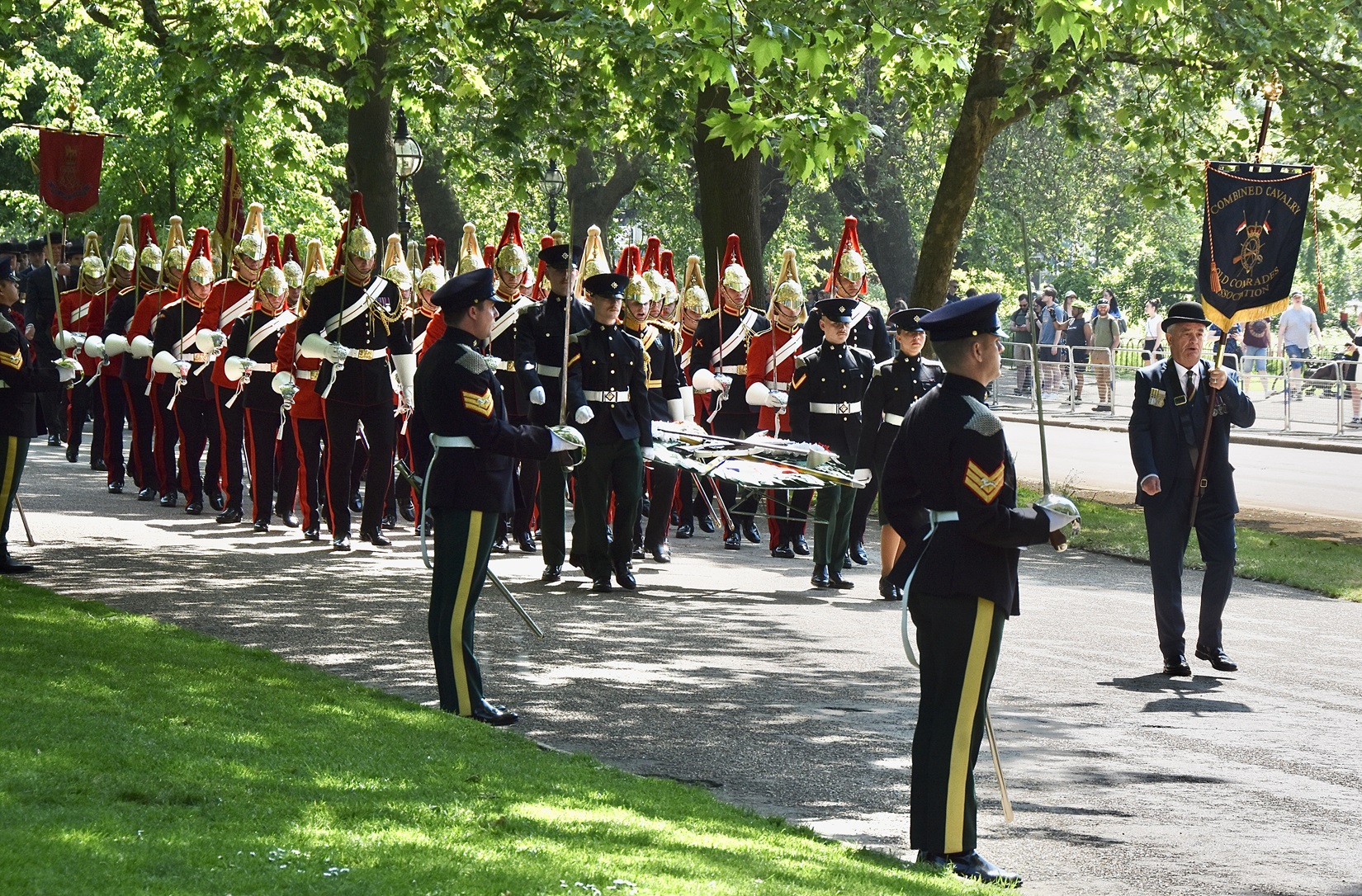 On the left, Prince Edward, Duke of Edinburgh, positioned in front of the Cavalry Memorial, takes the salute. In the centre, more than 3,000 serving, veteran and reserve personnel march along the Serpentine Road past the Duke, Old Comrades Association Officials and invited guests. On the right, the band of the Household Cavalry provides a musical accompaniment. The order of precedence is jealously guarded. Today, there are nine regular cavalry regiments that are mostly the products of the many amalgamations of historic regiments that have taken place since 1922. The four Yeomanry regiments are members of the Army Reserve (formerly the Territorial Army).Juno, the Drum Horse of the Household Cavalry Mounted Regiment, leads the march past followed by the band of the Household Cavalry who will play on the right as viewed here for the duration of the ceremony.The banner of the Combined Cavalry Old Comrades Association is followed by the Association’s wreath carried by four troopers from the 2024 sponsor regiment, the Royal Dragoon Guards. Behind them are members of the Life Guards and of the Blues and Royals.