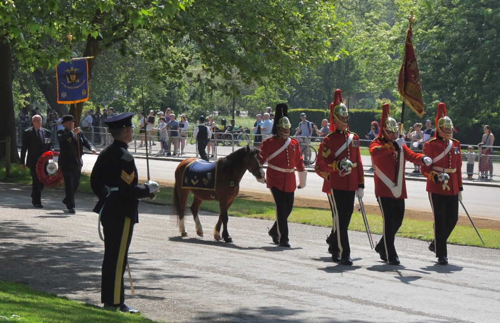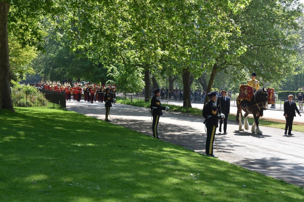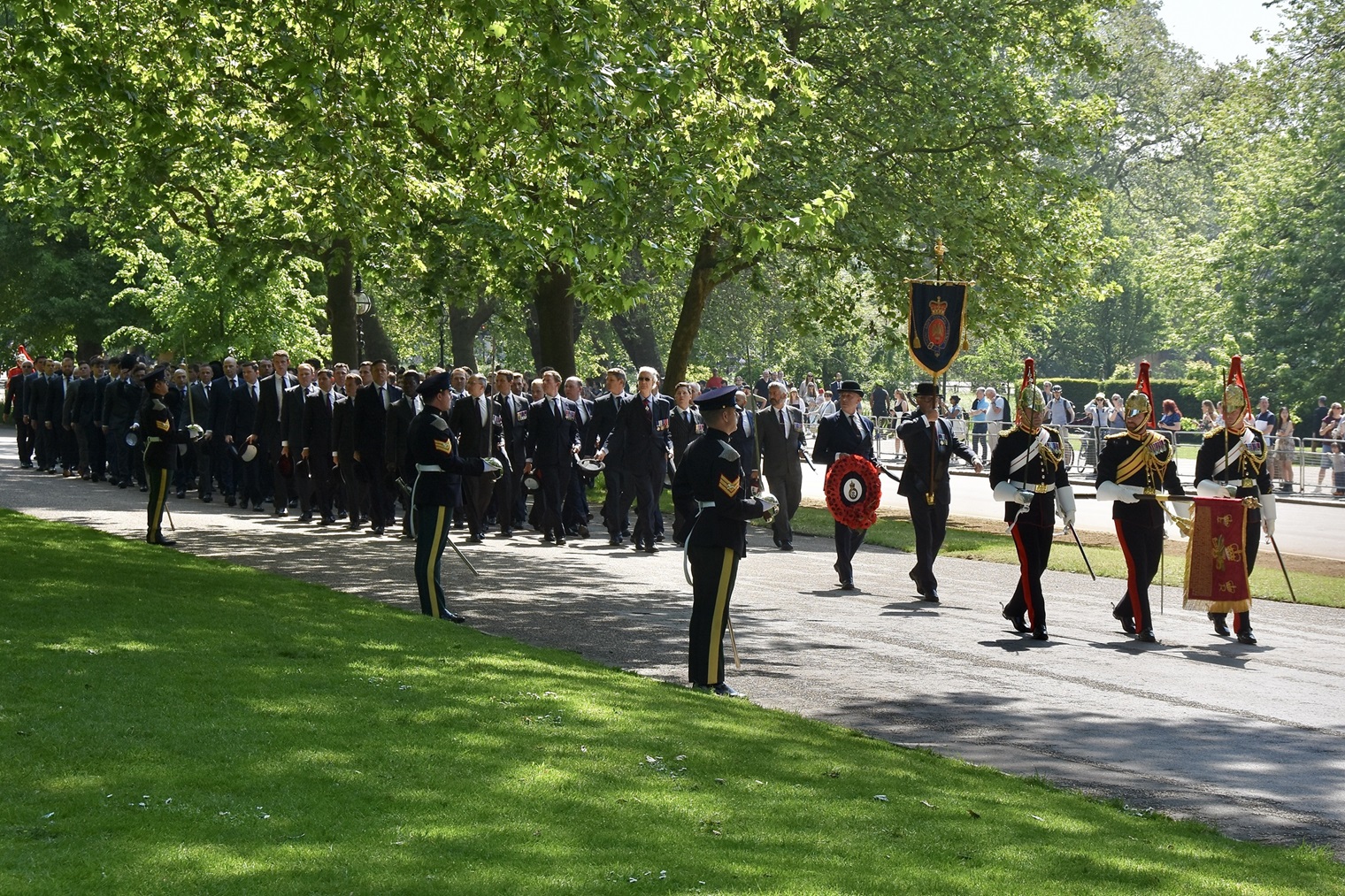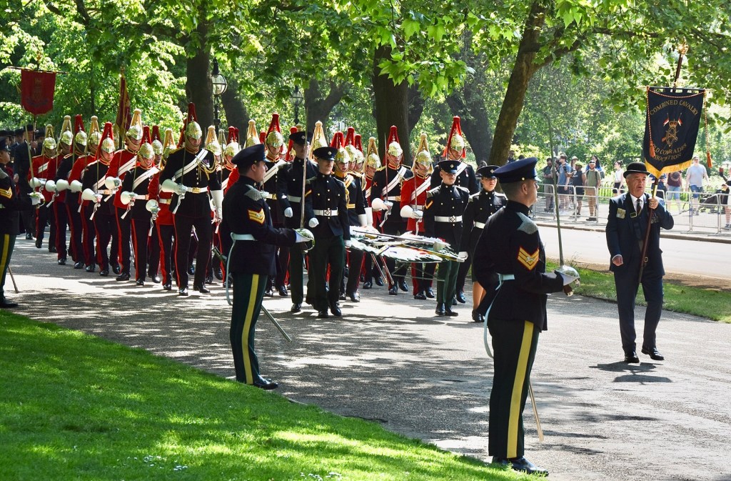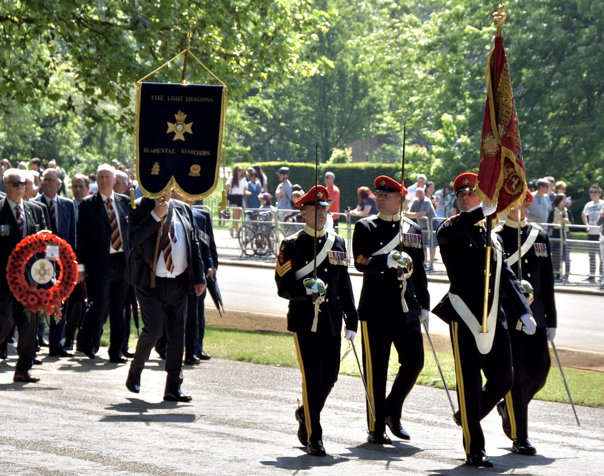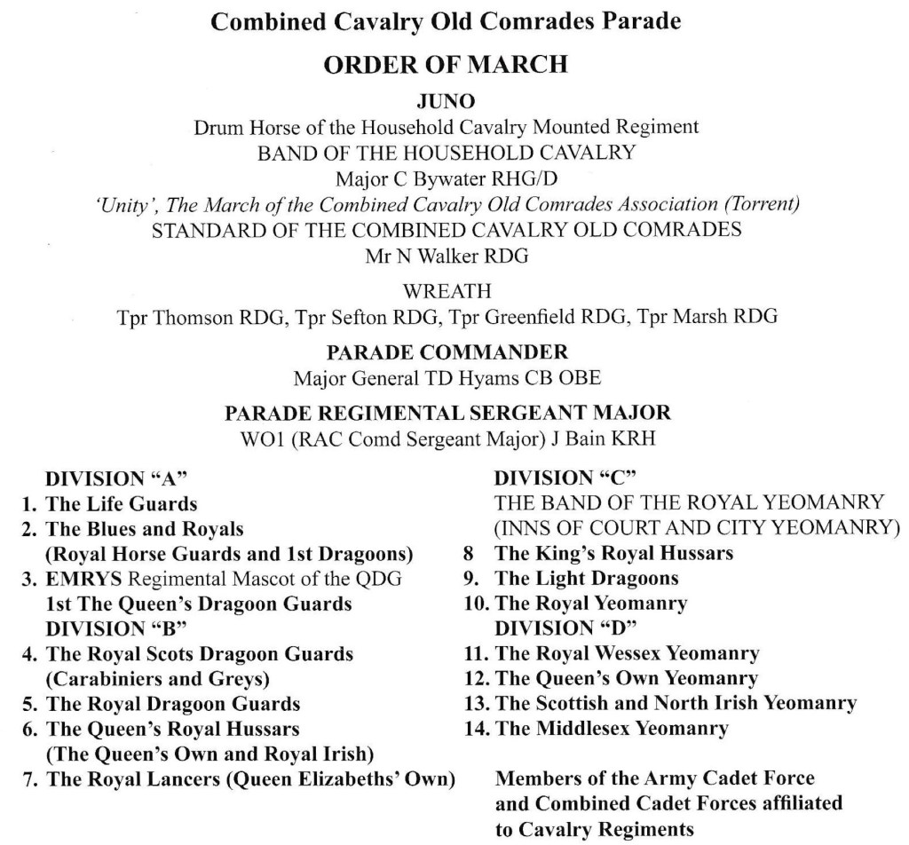 On the left, Prince Edward, Duke of Edinburgh, positioned in front of the Cavalry Memorial, takes the salute. In the centre, more than 3,000 serving, veteran and reserve personnel march along the Serpentine Road past the Duke, Old Comrades Association Officials and invited guests. On the right, the band of the Household Cavalry provides a musical accompaniment. The order of precedence is jealously guarded. Today, there are nine regular cavalry regiments that are mostly the products of the many amalgamations of historic regiments that have taken place since 1922. The four Yeomanry regiments are members of the Army Reserve (formerly the Territorial Army).Juno, the Drum Horse of the Household Cavalry Mounted Regiment, leads the march past followed by the band of the Household Cavalry who will play on the right as viewed here for the duration of the ceremony.The banner of the Combined Cavalry Old Comrades Association is followed by the Association’s wreath carried by four troopers from the 2024 sponsor regiment, the Royal Dragoon Guards. Behind them are members of the Life Guards and of the Blues and Royals.
