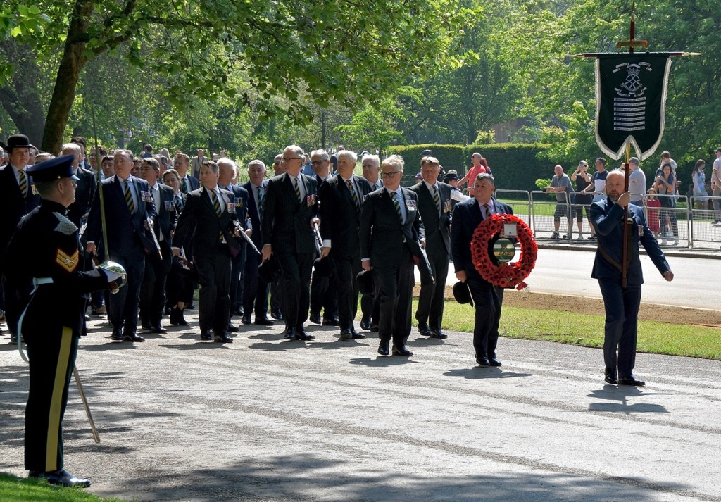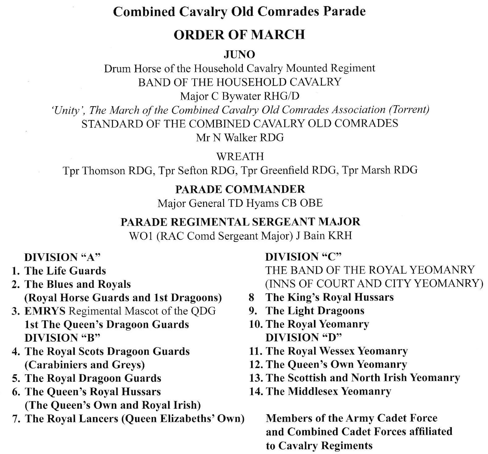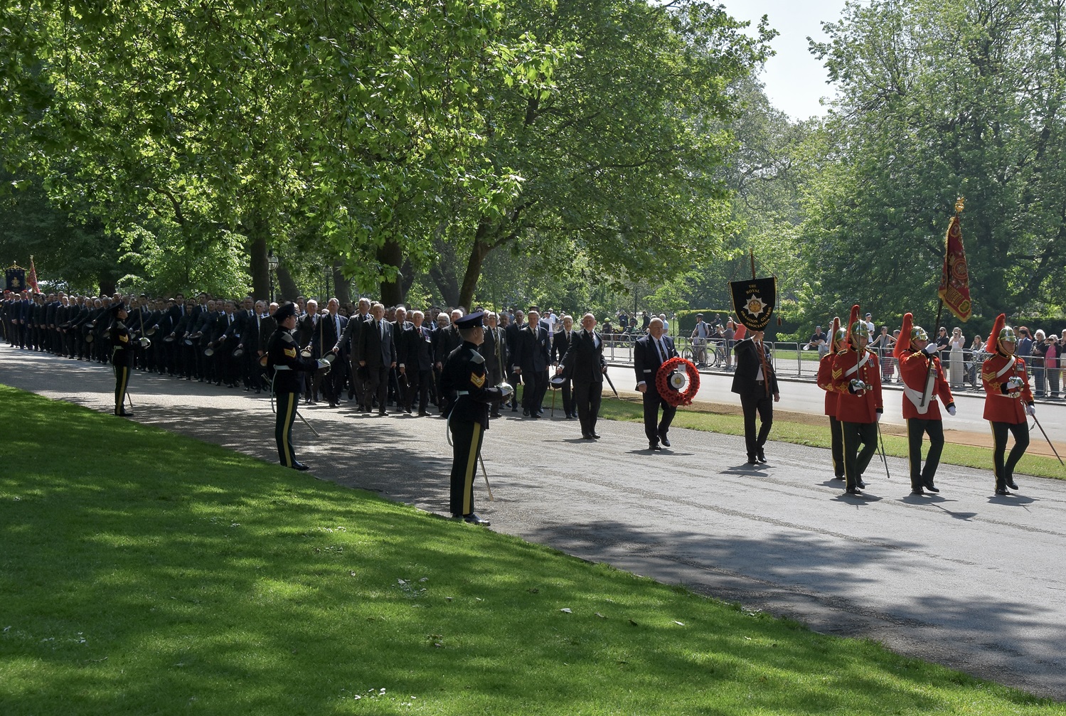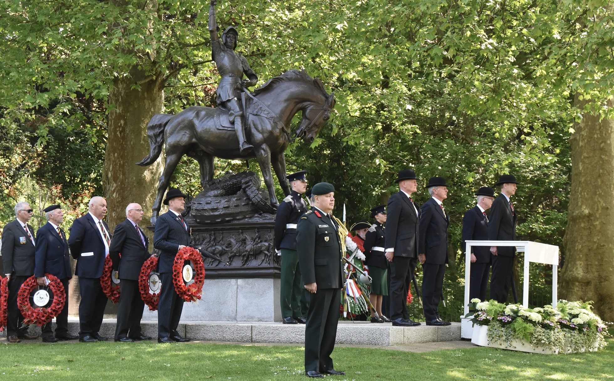 On the left, Prince Edward, Duke of Edinburgh, positioned in front of the Cavalry Memorial, takes the salute. In the centre, more than 3,000 serving, veteran and reserve personnel march along the Serpentine Road past the Duke, Old Comrades Association Officials and invited guests. On the right, the band of the Household Cavalry provides a musical accompaniment. The order of precedence is jealously guarded. Today, there are nine regular cavalry regiments that are mostly the products of the many amalgamations of historic regiments that have taken place since 1922. The four Yeomanry regiments are members of the Army Reserve (formerly the Territorial Army).Juno, the Drum Horse of the Household Cavalry Mounted Regiment, leads the march past followed by the band of the Household Cavalry who will play on the right as viewed here for the duration of the ceremony.The banner of the Combined Cavalry Old Comrades Association is followed by the Association’s wreath carried by four troopers from the 2024 sponsor regiment, the Royal Dragoon Guards. Behind them are members of the Life Guards and of the Blues and Royals.