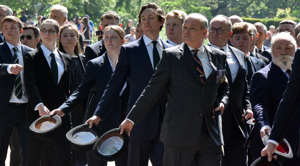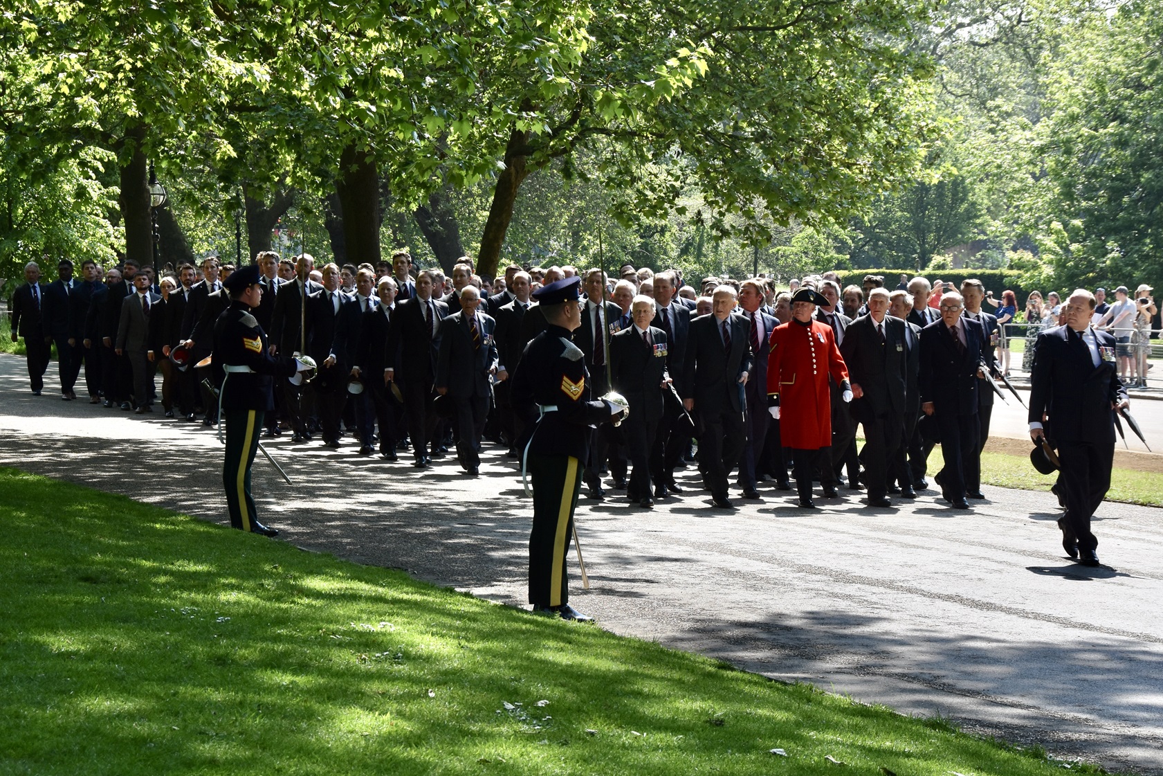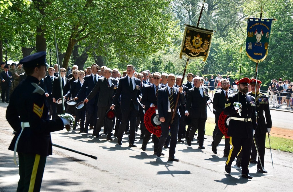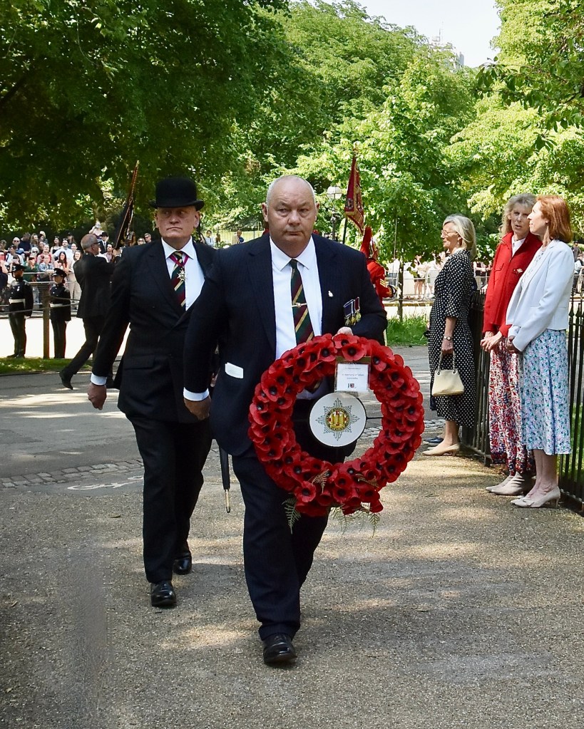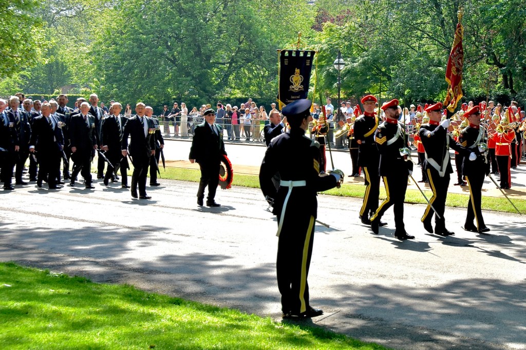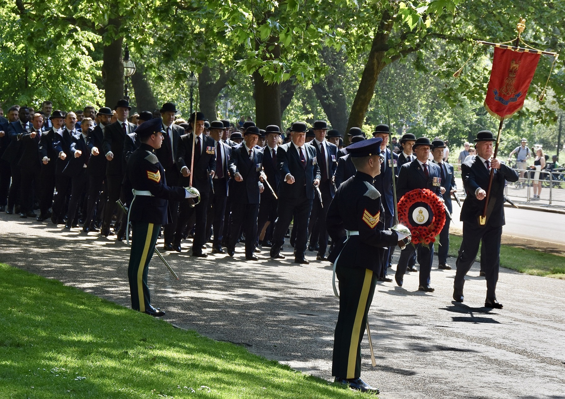 On the left, Prince Edward, Duke of Edinburgh, positioned in front of the Cavalry Memorial, takes the salute. In the centre, more than 3,000 serving, veteran and reserve personnel march along the Serpentine Road past the Duke, Old Comrades Association Officials and invited guests. On the right, the band of the Household Cavalry provides a musical accompaniment. The order of precedence is jealously guarded. Today, there are nine regular cavalry regiments that are mostly the products of the many amalgamations of historic regiments that have taken place since 1922. The four Yeomanry regiments are members of the Army Reserve (formerly the Territorial Army).Juno, the Drum Horse of the Household Cavalry Mounted Regiment, leads the march past followed by the band of the Household Cavalry who will play on the right as viewed here for the duration of the ceremony.The banner of the Combined Cavalry Old Comrades Association is followed by the Association’s wreath carried by four troopers from the 2024 sponsor regiment, the Royal Dragoon Guards. Behind them are members of the Life Guards and of the Blues and Royals.