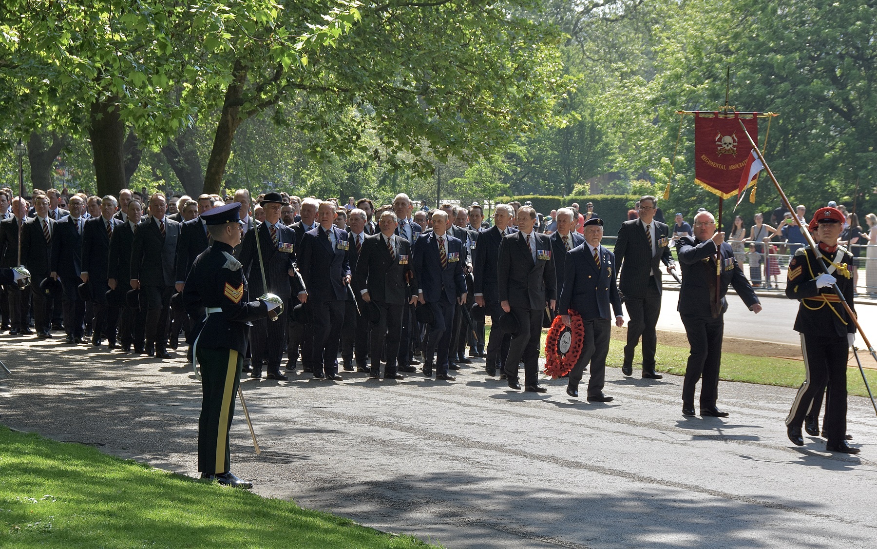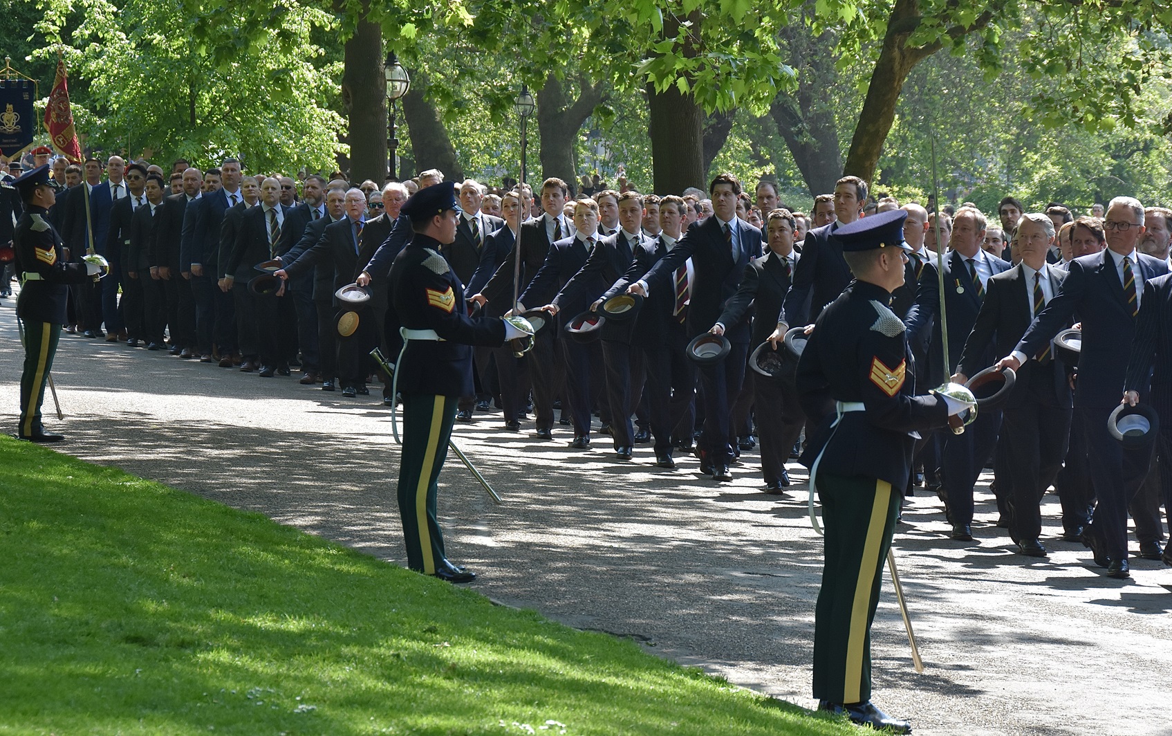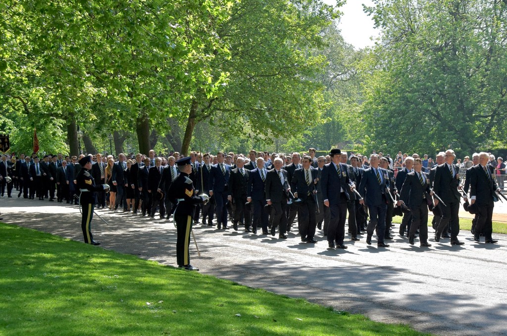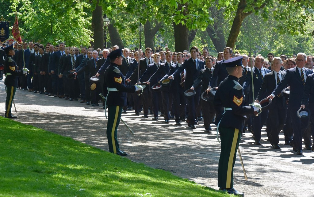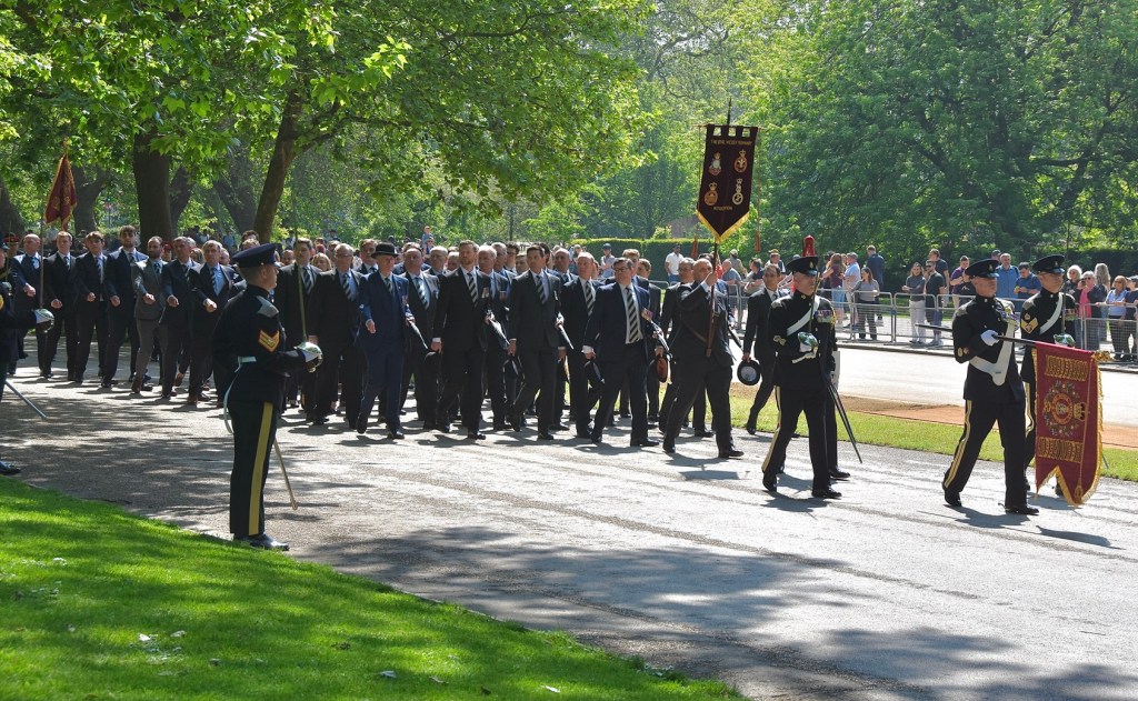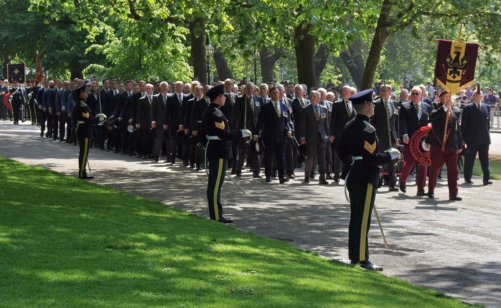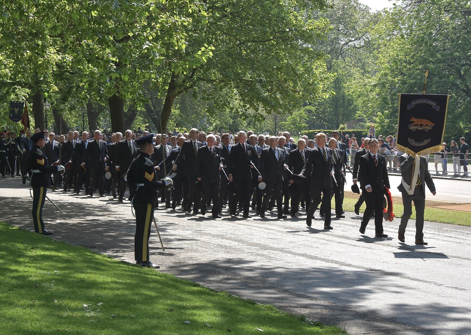 The Regimental Standard leads the RDG.Because of its lineage through the 5th Royal Inniskillings and the 4th/7th Royal Dragoon Guards the RDG retains strong links to Northern Ireland.As with all the other units on parade, the RDG Wreath Bearer leaves the march to take the regiment’s wreath to the Memorial.The Saluting Base