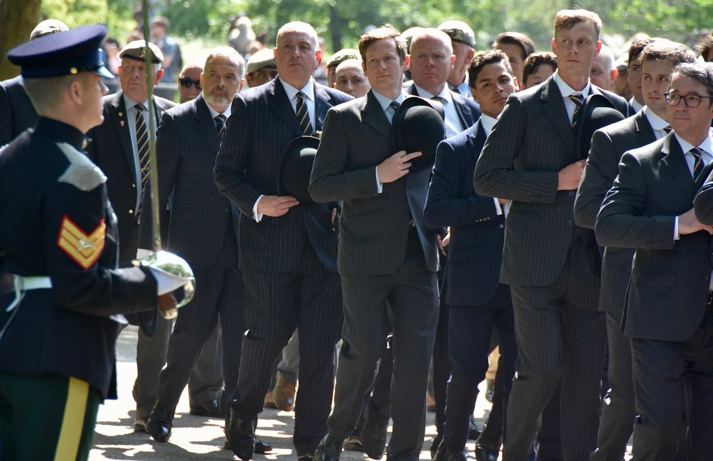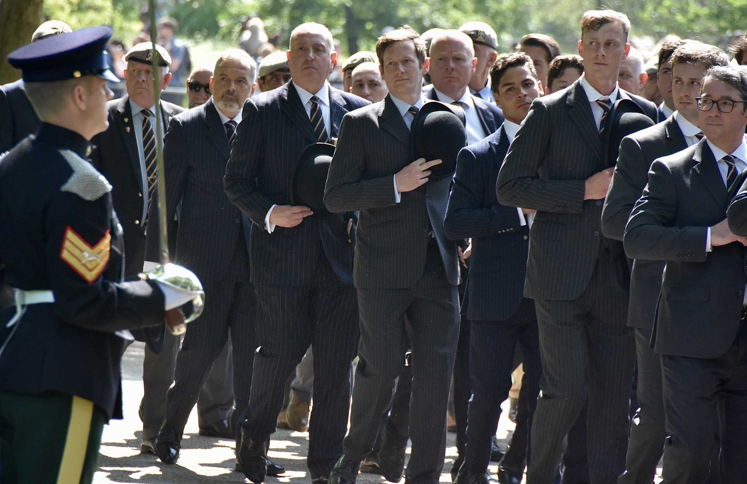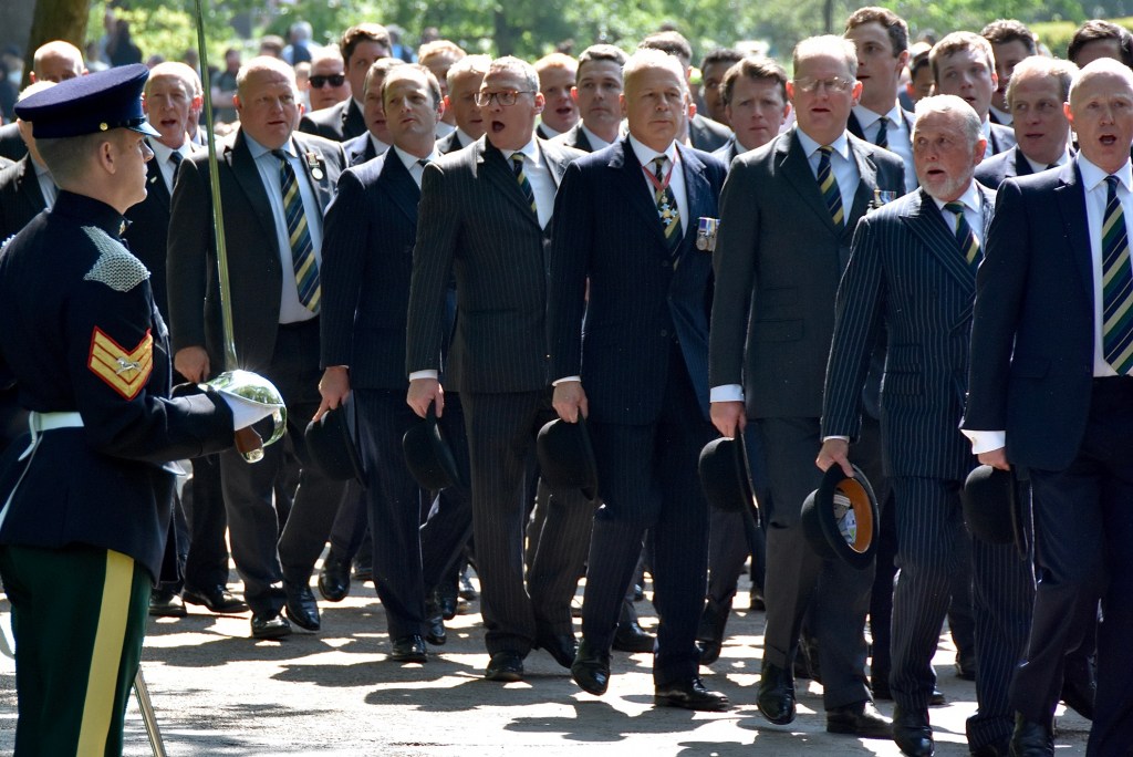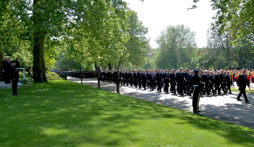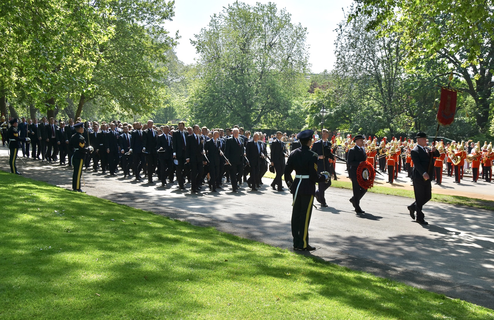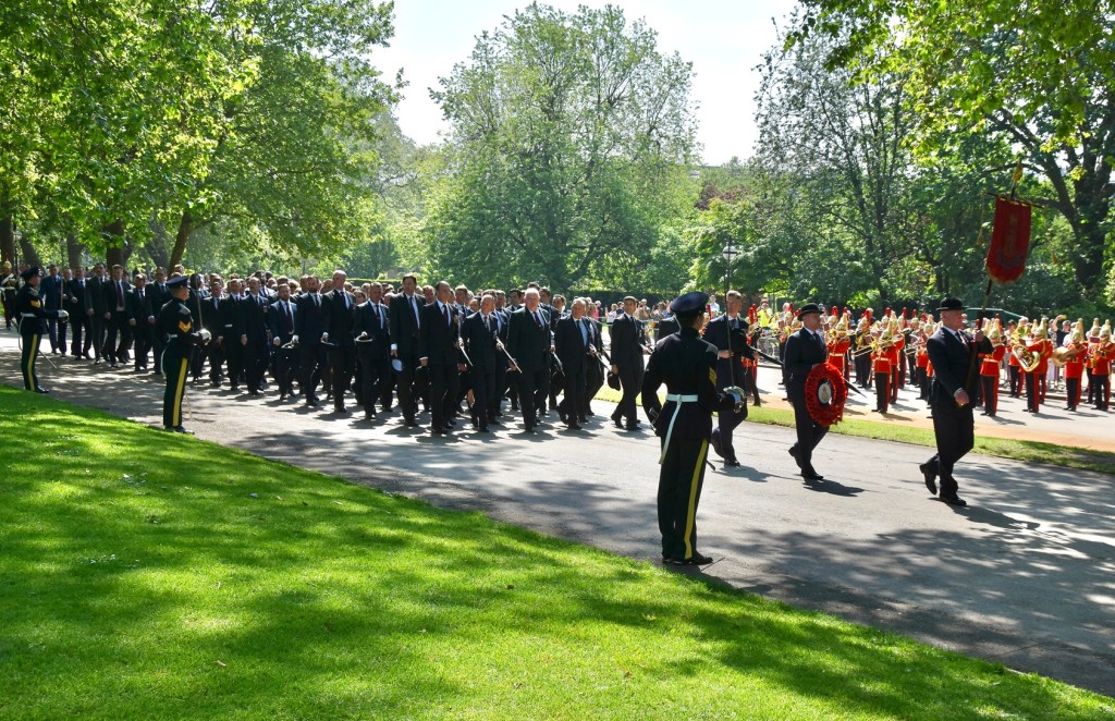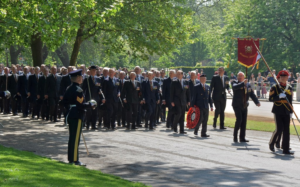 The Regimental Standard leads the RDG.Because of its lineage through the 5th Royal Inniskillings and the 4th/7th Royal Dragoon Guards the RDG retains strong links to Northern Ireland.As with all the other units on parade, the RDG Wreath Bearer leaves the march to take the regiment’s wreath to the Memorial.The Saluting Base