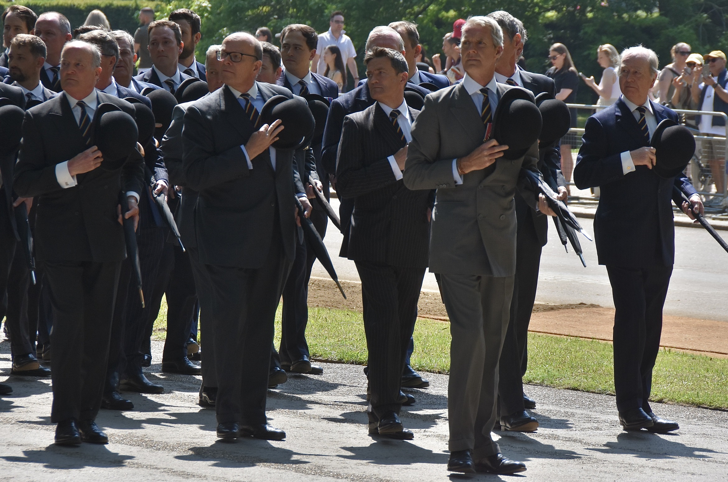 Hats are kept on until near the saluting base.Approaching the saluting base, the command “Eyes Right” is given and civilian hats are removed.