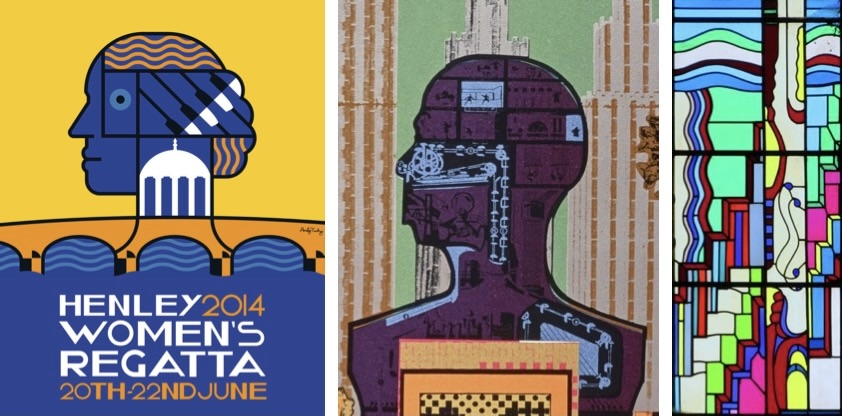 Pam Hayes approached me in 2012 to create the 2013 poster. She’d seen prints and posters on my website in a vintage travel poster style. It’s as simple as that, really. She asked, and I happily agreed. Many of my commissions have come about this way. The original brief, which has remained the same through the years, was to include Temple Island, women/a woman, and rowing. It has become increasingly challenging to generate something fresh and original with these elements, but I feel I’ve succeeded. I drew the typography from the original 1920s lettering in the Olympic Stadium in Amsterdam and that has remained unchanged in every design since, except for different dates. Probably because it was already vintage typography, it has managed to endure without dating.