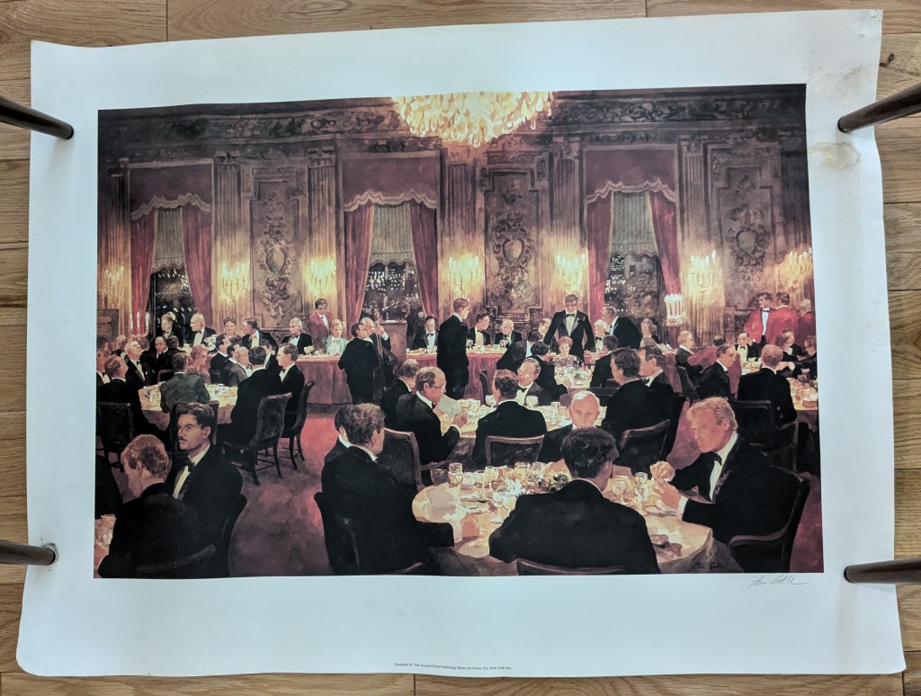 The print that David found in his attic (see above) is a “rowing” lithograph showing a so-called Power Ten Dinner. “Power Ten” is an organization which celebrates and supports the sport of rowing at black-tie affairs. The dinner attracts, in the words of rowing historian Tom Weil, “a significant number of American rowing movers and shakers.”