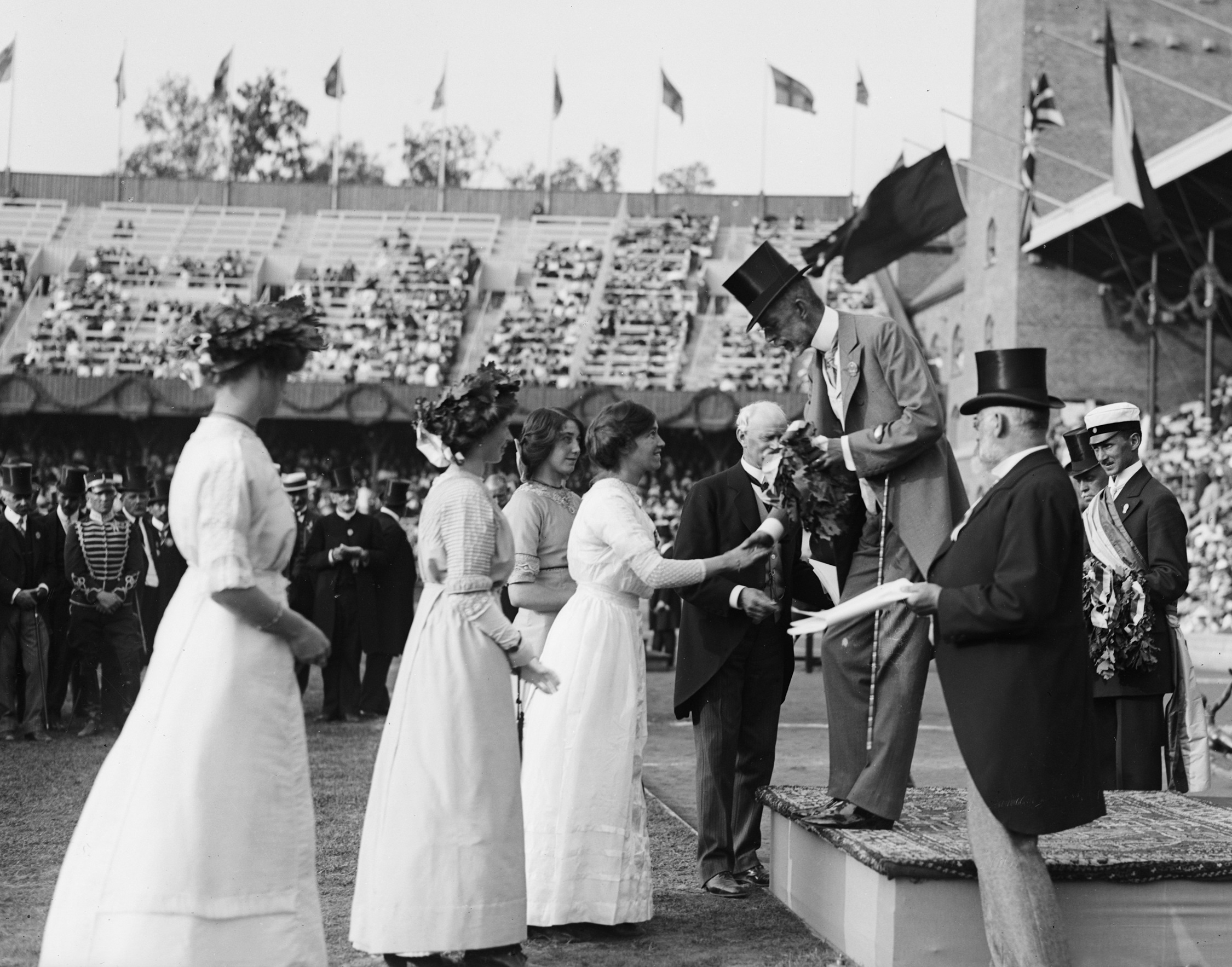 The presentation of medals was standardised to the current arrangement at the 1932 Los Angles Games. Before then, all the medals were awarded at the closing ceremony and, in some of the five Games held before the 1914-18 War, the athletes wore morning dress (the return of this custom is, in my opinion, long overdue). Originally the presenting dignitary was stationary while the athletes filed past to receive their medals but another 1932 innovation was the winners’ podium.