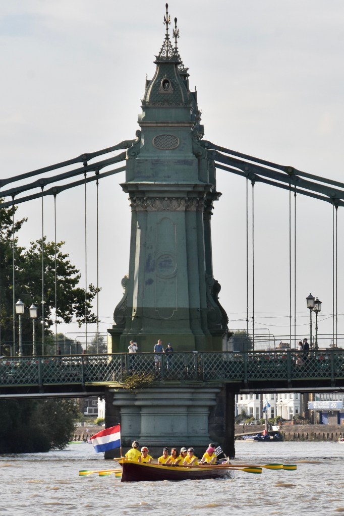 In total, thirty-seven trophies are awarded at the Great River Race. The fastest overall female crew on handicap was WSV Woudrichem rowing a St Ayles Skiff; the fastest mixed crew on handicap was Burra Rowing Club racing a Shetland Yaol; and the fastest female crew (not including handicap) was Bristol Gig Club in a Cornish Pilot Gig.