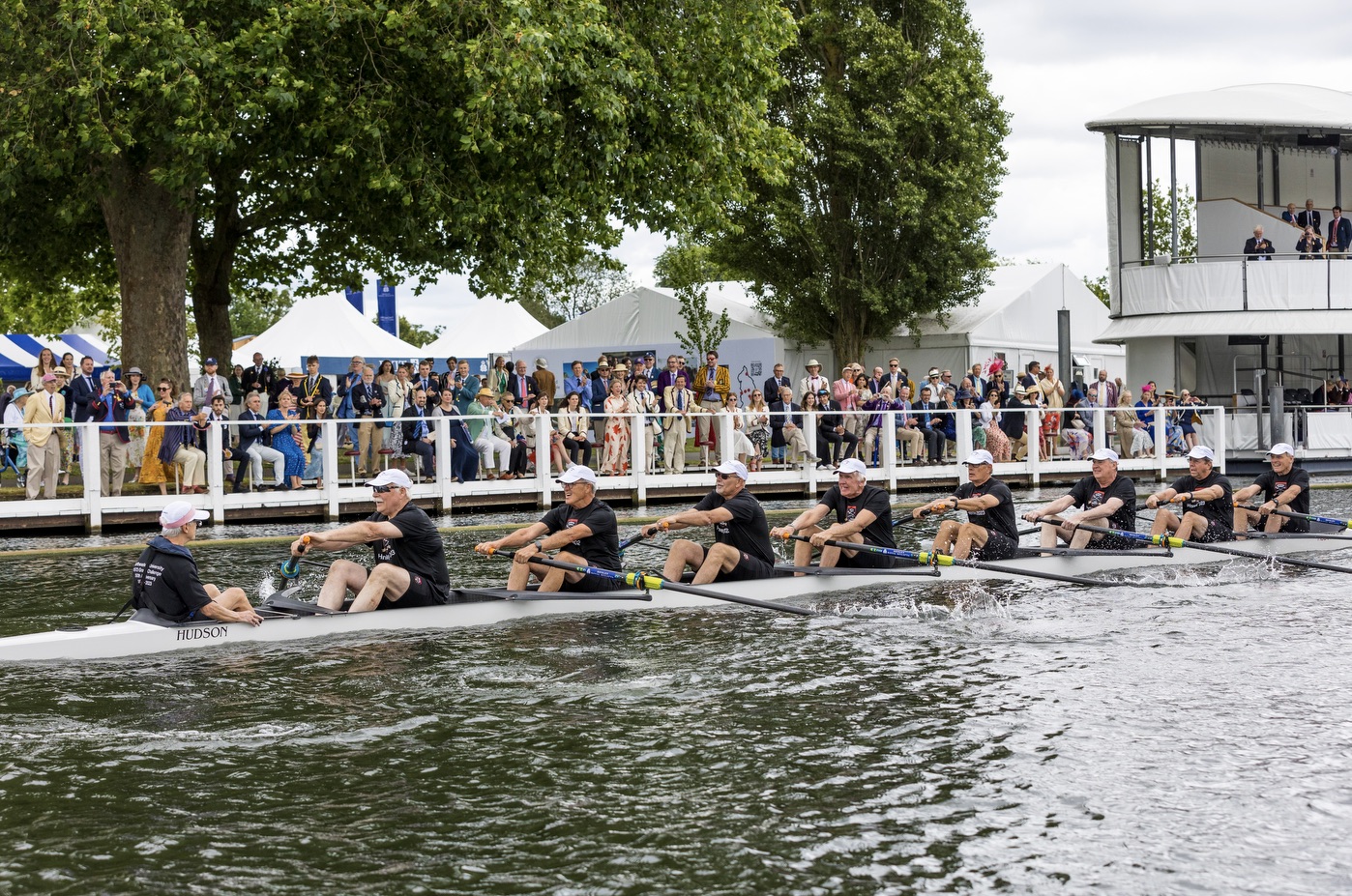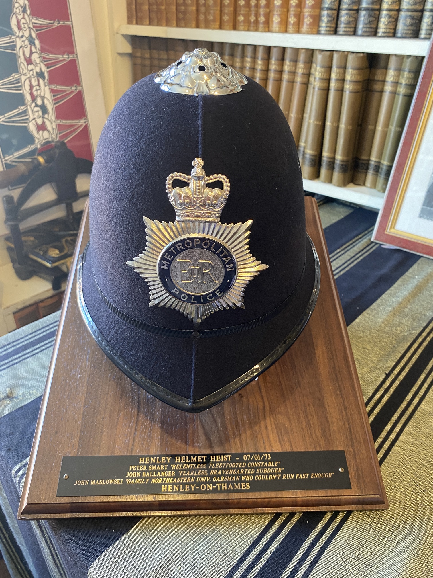 At the reunion, members of the 1973 Northeastern eight presented former PC Smart with an old Metropolitan Police helmet, similar to his Thames Valley Police original, suitably mounted (the “Met” polices Greater London, the Thames Valley Police area is Berkshire, Oxfordshire and Buckinghamshire). The helmet was given to Peter to hold as custodian and it was to be handed back to any future Northeastern crew winning a Henley final.