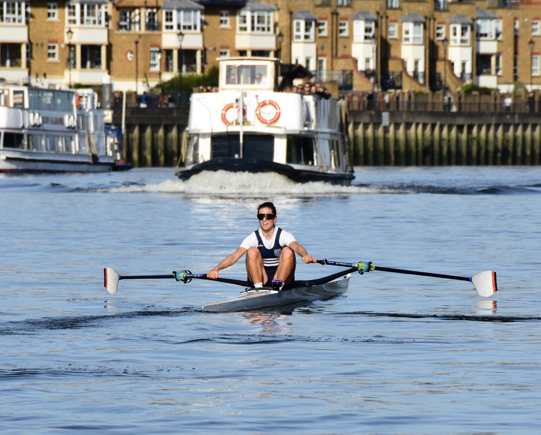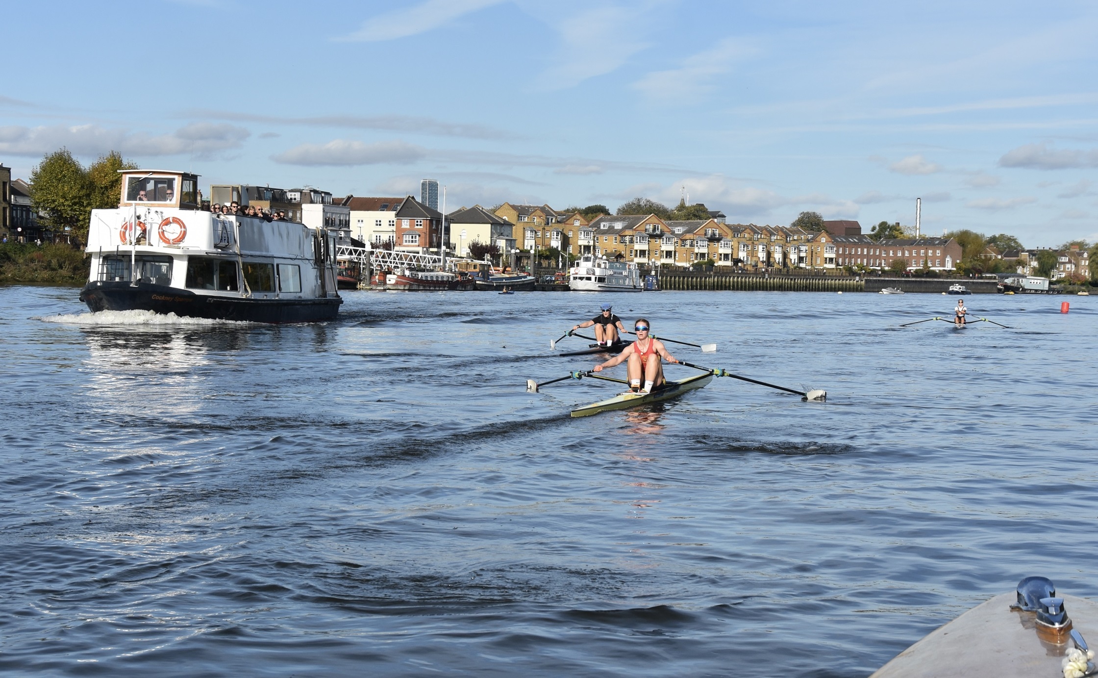 At Chiswick Pier, the race encountered a tourist boat coming upriver.