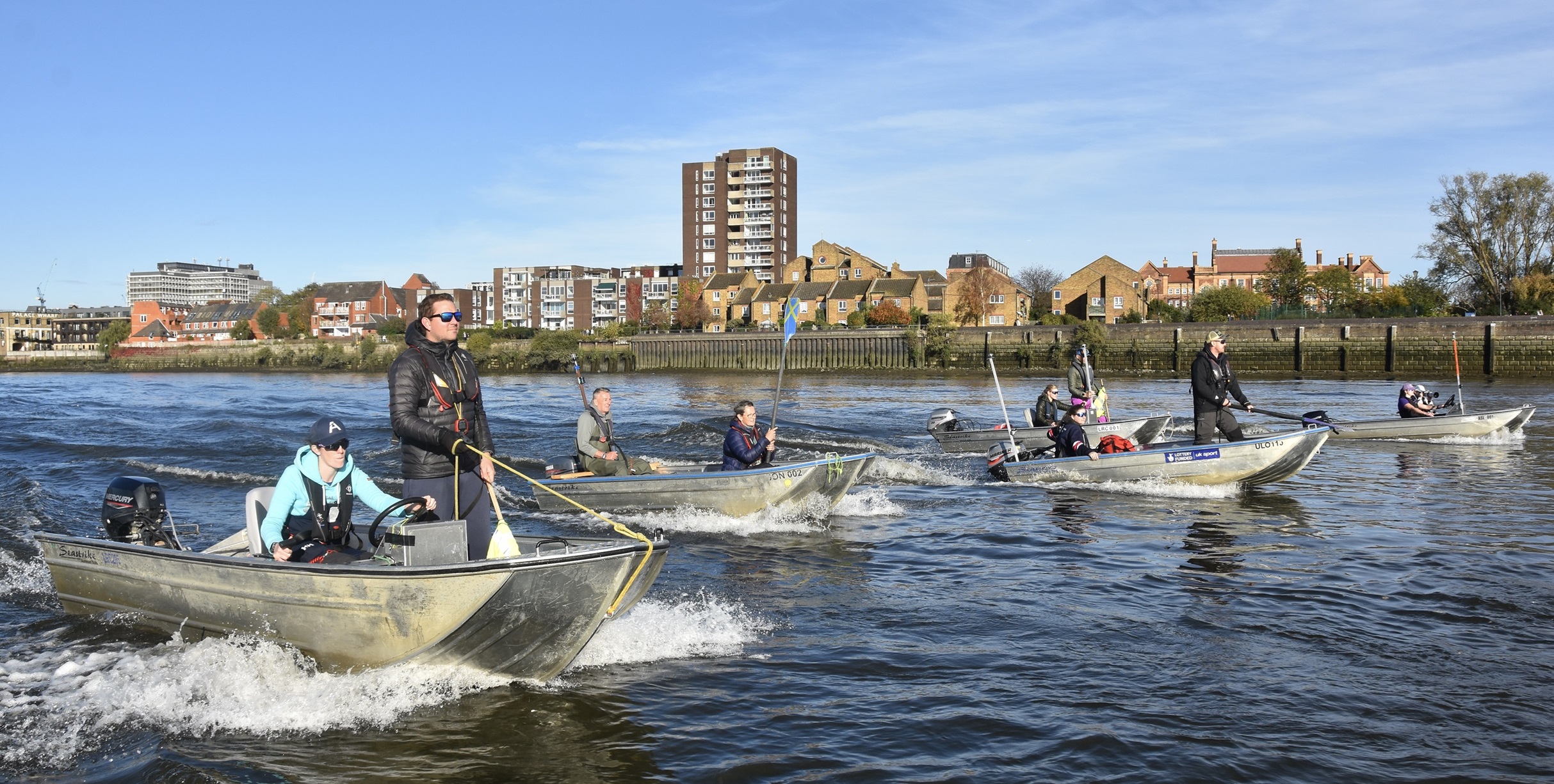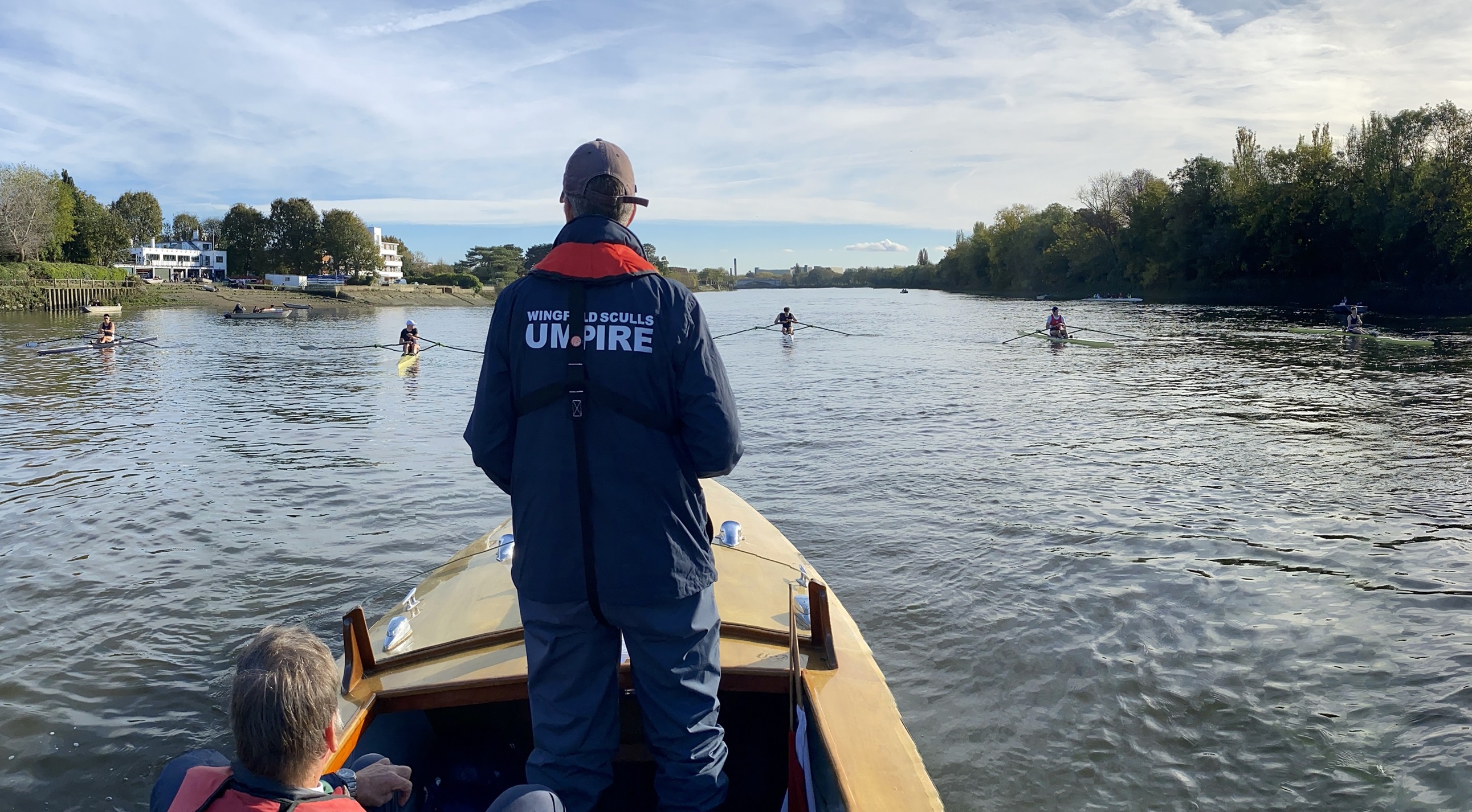The five male competitors in the 2024 Wingfield Sculls line up under the control of umpire Greg Searle. Pictured here from Middlesex to Surrey, left to right, are Rui Xu (London Rowing Club), Callum Dixon (Twickenham Rowing Club), Josh Lyon (London Rowing Club), Graeme Thomas (Agecroft Rowing Club) and Ben Parsonage (Clydesdale Amateur Rowing Club).