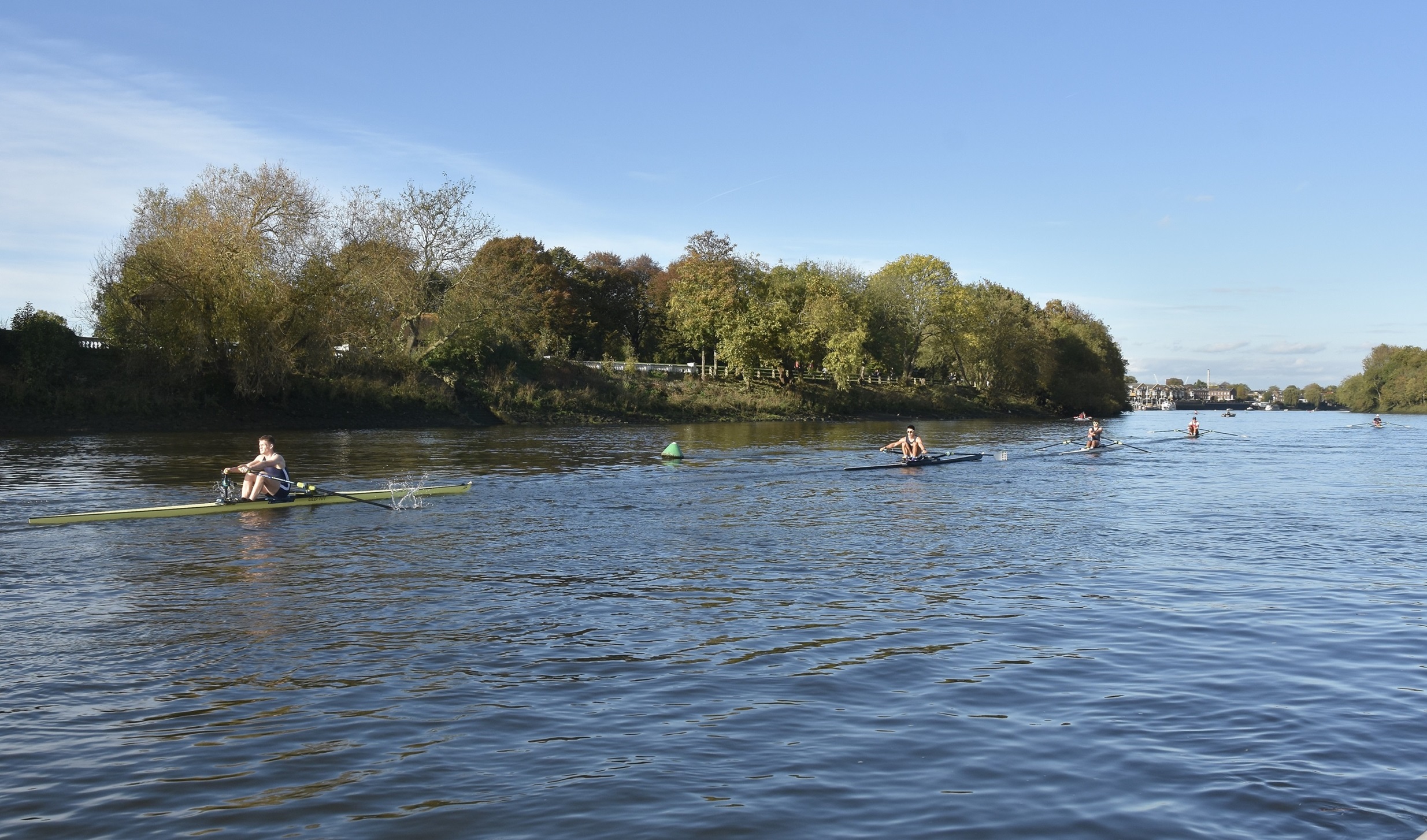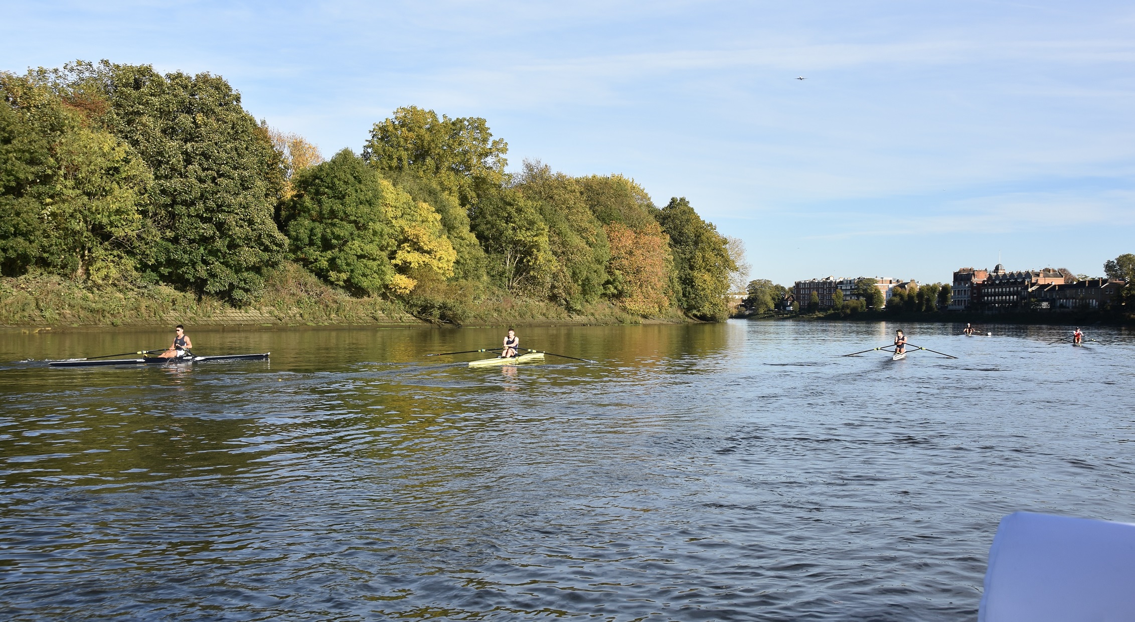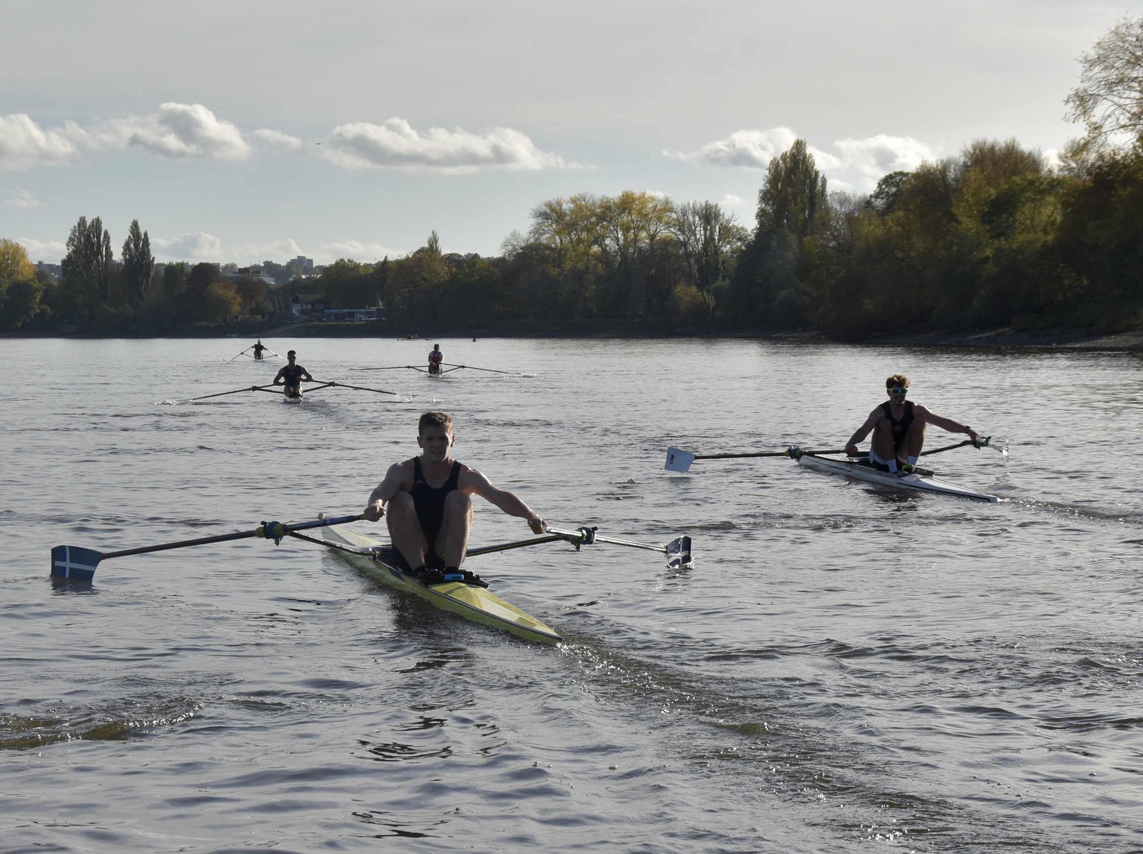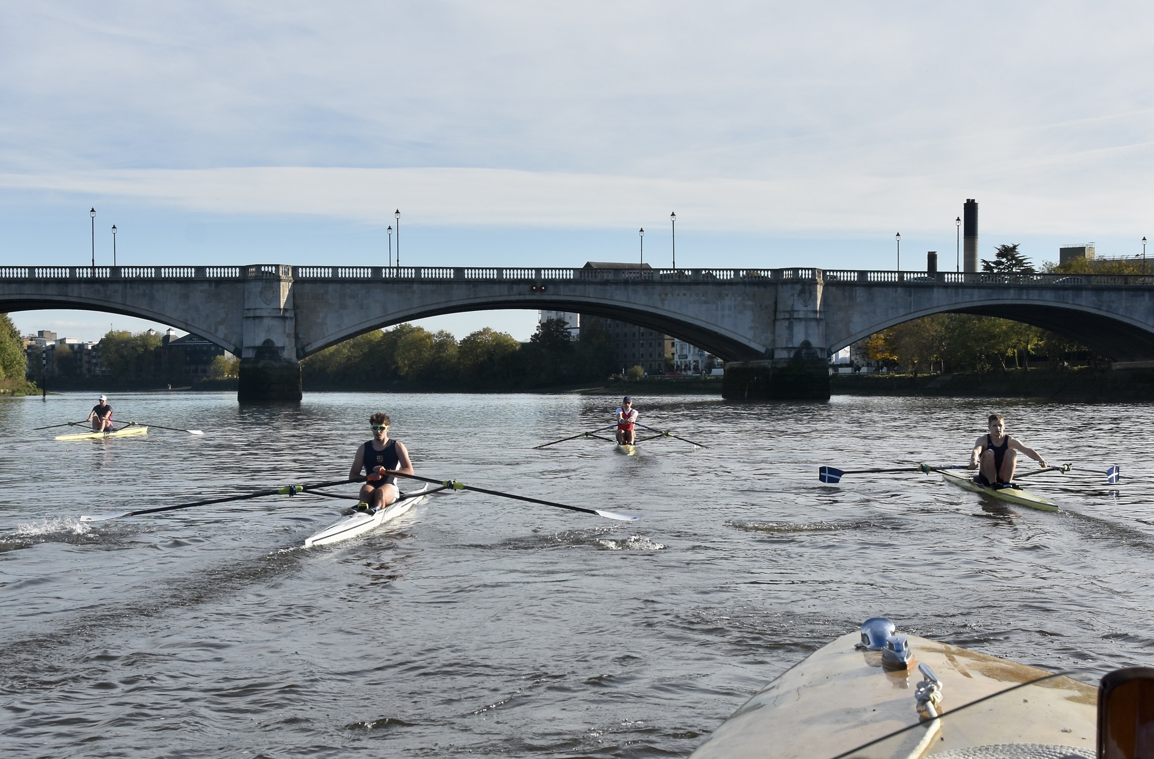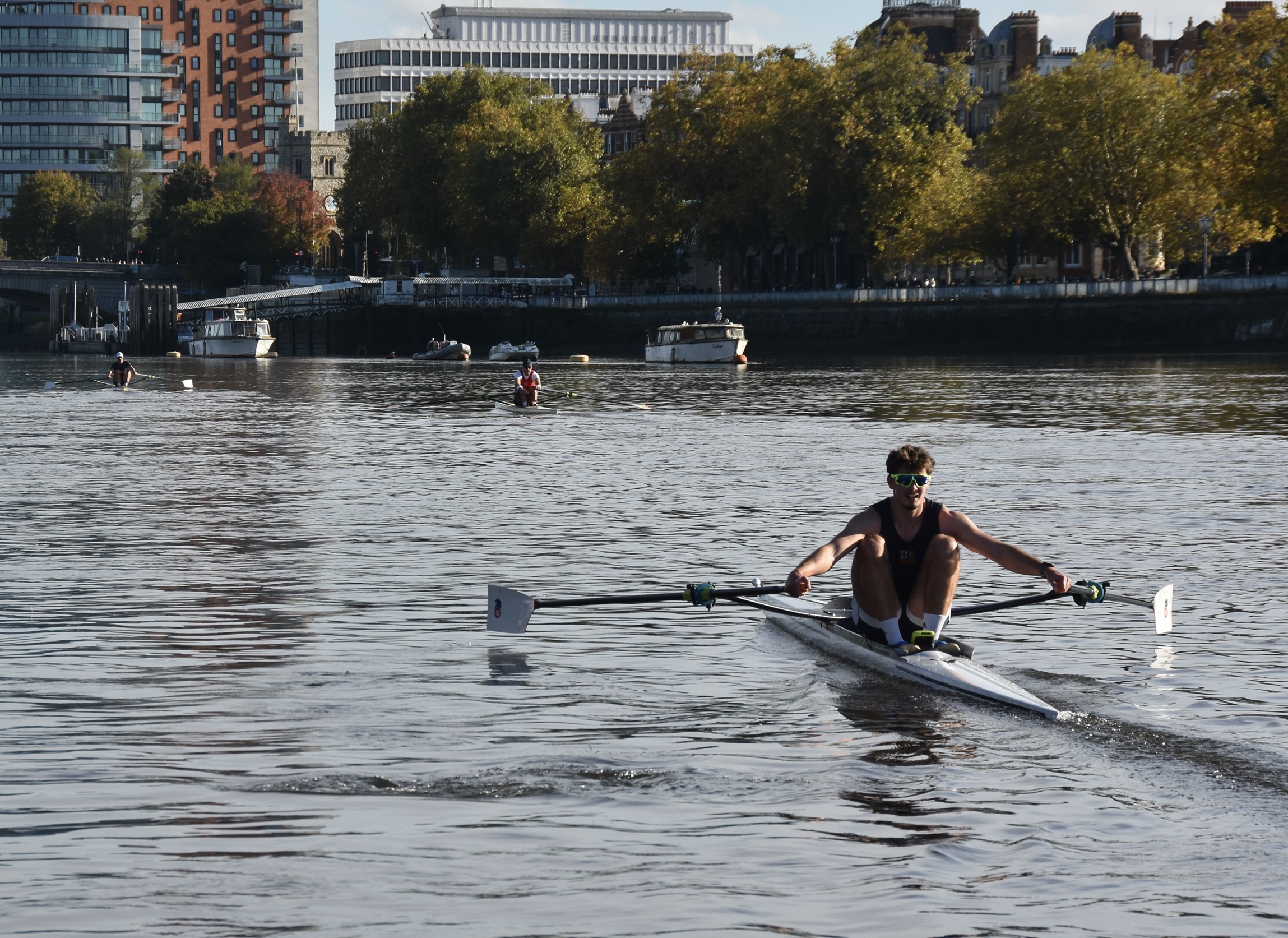 Off the start, it was Lyon in front followed by Thomas, Parsonage, Dixon and then Xu. However, Dixon soon took the lead and reached Chiswick Bridge (pictured) in 3min 06 sec. Left to right here are Dixon (1st), Lyon (4th), Thomas (2nd) and Parsonage (3rd). Xu (5th) is out of shot.Although an experienced Tideway sculler, Xu mostly stayed close to the Middlesex shore until well past Chiswick Bridge and was far down on the rest of the field for some time.Between Chiswick and Barnes Bridges, the order was still, left to right, Lyon (4th), Dixon (1st), Thomas (2nd) and Parsonage (3rd). Xu (5th) is out of shot.One minute after the previous picture was taken, Lyon passed Parsonage and took his third place.Approaching Barnes Bridge, Xu, who had fallen over a length behind off the start, began to challenge Parsonage for fourth place. Left to right here are Xu, Parsonage, Lyon, Thomas and Dixon.Xu (foreground left) closes in on Parsonage (foreground right).Leader Dixon reached Barnes Bridge in 6min 54sec. He was followed by Thomas, Lyon, Xu (now in fourth place) and Parsonage.Low in fat, big in muscle: Rui Xu (pronounced something like “Rooee See”).Passing the Bandstand on Dukes Meadows, Chiswick. Left to right: Parsonage, Xu, Lyon, Thomas and Dixon.Between Chiswick Pier (pictured) and Chiswick Eyot, Xu (middle right) overtook Lyon (middle left) to take third place.Near St Paul’s School, Graeme Thomas takes evasive action. Despite his creditable finish position, Thomas seemed out of form.At Hammersmith Bridge, the order was Dixon, Thomas, Xu, Lyon and Parsonage. Dixon reached the bridge in 16min 11sec.In Fulham Reach, it is Dixon (1st), Thomas (2nd), Xu (3rd), Lyon (4th) and Parsonage (5th). Dixon passed the Mile Post at 19min 56sec.The competitors’ steerers follow behind the umpire.The leader, Dixon, reaches Fulham Football Ground while the others follow in his wake.Pictured at the finish is Dixon (1st, 23mins 46sec), Thomas (2nd) and Lyon (4th). Out of shot are Xu (3rd) and Parsonage (5th).Josh Lyon recovers.Ben Parsonage with his trainer, Peter Haining (left). Haining was Wingfields Champion four times (1994, 1995, 1996, 2000), he competed in the 1992 and 1996 Olympic Games and was World Lightweight Single Sculling Champion, 1993 – 1995. He was the first to complete the Wingfields over the Championship Course in under twenty minutes.Callum Dixon, the new Champion of the Thames, with Team Dixon.The London RC boys, Rui Xu and Josh Lyon.The Long Room at London RC, ready for the prize giving. Changing the course to finish at the accessible Putney Embankment (as opposed to the inaccessible Tideway Scullers’ Chiswick boathouse) coupled with holding the event on a Sunday (not a weekday as has been traditional) produced a much greater turnout of spectators and supporters. While the tides may not allow this direction every year, the change was regarded as a success by all concerned.The women’s prize (left) and the men’s prize (right). Winners have a choice of scarf or tie. First time winners get a medal and year bar to go on their medal ribbon and second time and subsequent winners get a year bar to go on their existing medal ribbon.Wingfield’s Secretary, Sam Meijer (2019 Champion), has continued the enthusiasm of his predecessor, Wade Hall-Craggs, for preserving and adding to the Wingfield’s paper archive.