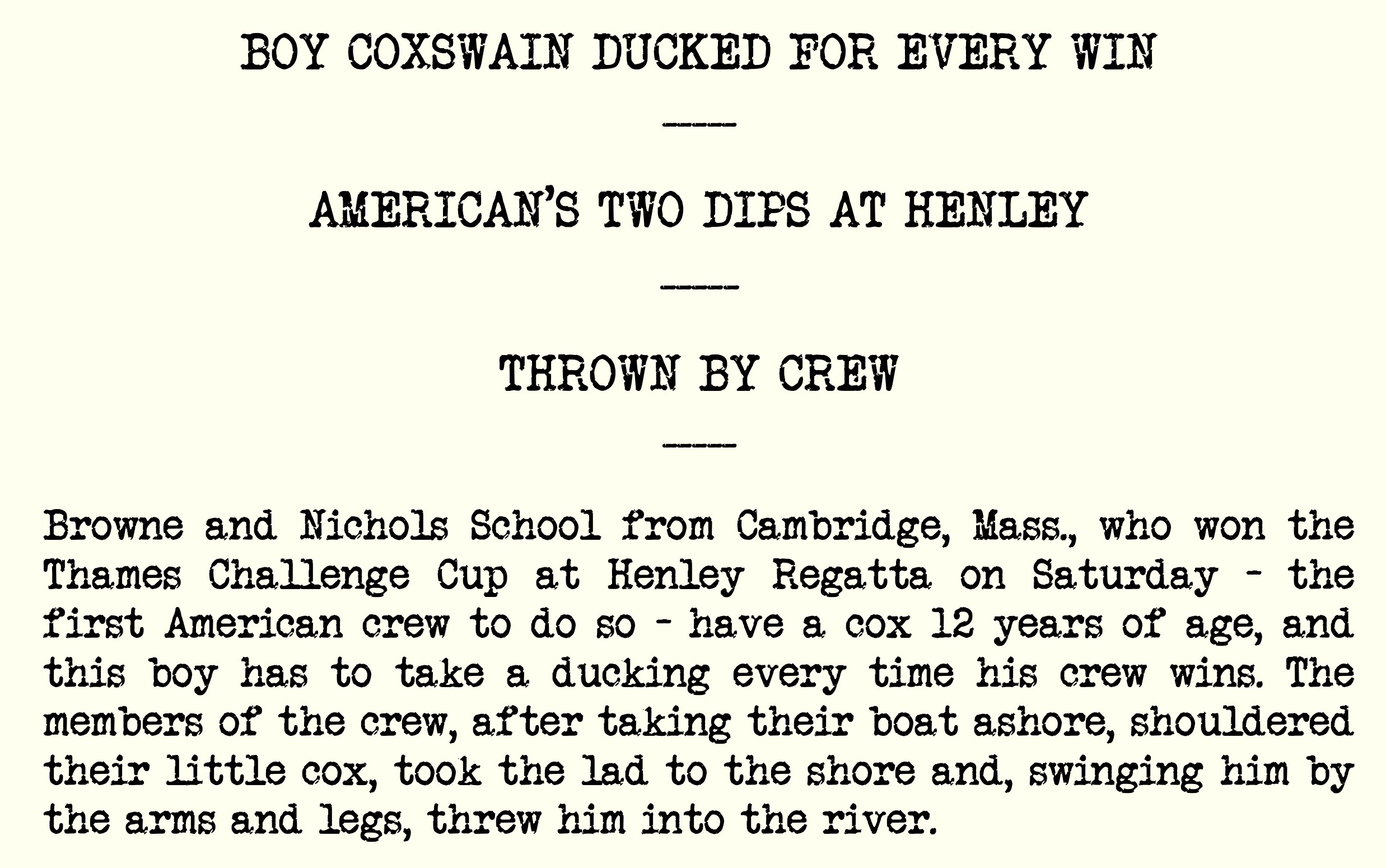I have been unable to find any mention of (cox tossing) in old publications… Did it originate in the UK or USA? We know from watching the documentary The Boys of ‘36 that the Washington crew threw Bobby Moch in the water after winning. Can anyone supply any other older instances? Is it done in other rowing countries?