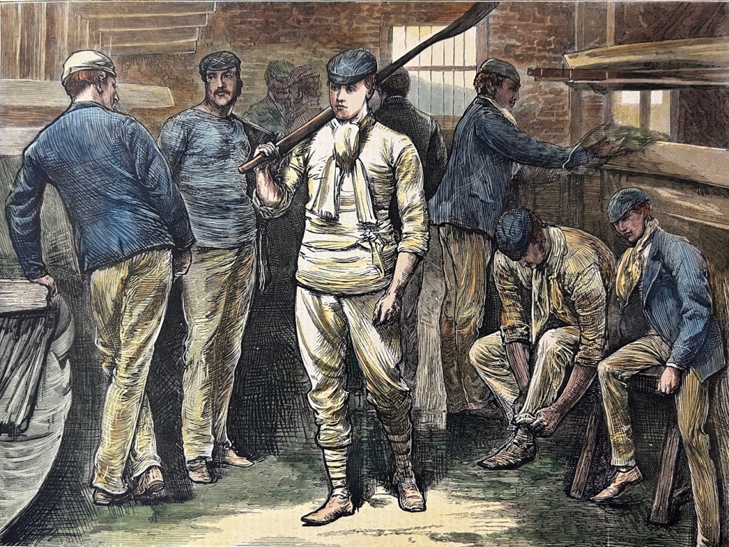 The Oxford crew in the old Oxford University Boat Club boathouse in 1875.