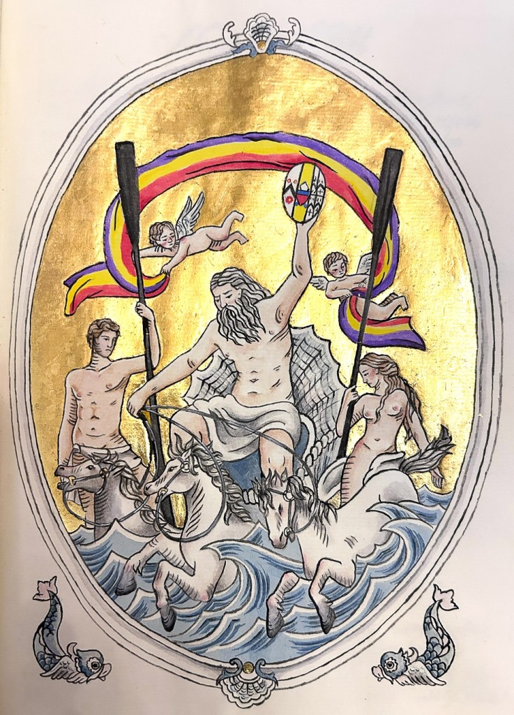 So, a decision was made that continuing the tradition of handwritten minutes should be accompanied by a new illuminated frontispiece, and an accompanying dedicatory poem. This correspondent was given the task of writing that poem, and the exceptionally talented hand gilder and rowing trophy maker, Lisa Harse, was commissioned to do the frontispiece. Together a theme was developed around the idea of Neptune endowing the Boat Club with divine strength, and bestowing the heritage of the Childe of Hale. The result poem was entitled Neptune’s Gift.