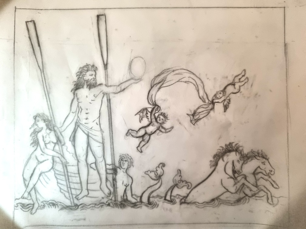 As the poem was taking shape, Lisa Harse went to work on a series of sketches which were gradually refined until a final concept was achieved. These showed Neptune in his chariot, holding aloft the Brasenose College coat of arms, and accompanied by putti with ribbons of purple, yellow and red, while two rowers bear the painted black oars.