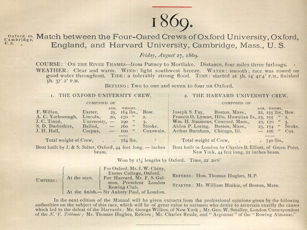 Chapter II – Races won in paper boats from 1868 to 1871. Boat racing at American colleges. The Harvard-Yale and Inter-Collegiate races, 1852 to 1871. Citizens’ Regatta, Worcester, Mass., 1859 to 1870. Regattas of the New England Rowing Association, Hudson Amateur Rowing Association and North-Western Amateur Boating Association, 1867 to 1871. Oxford and Cambridge (England) annual races, 1829 to 1871. International Races, 1866 to Sept. 15, 1871.