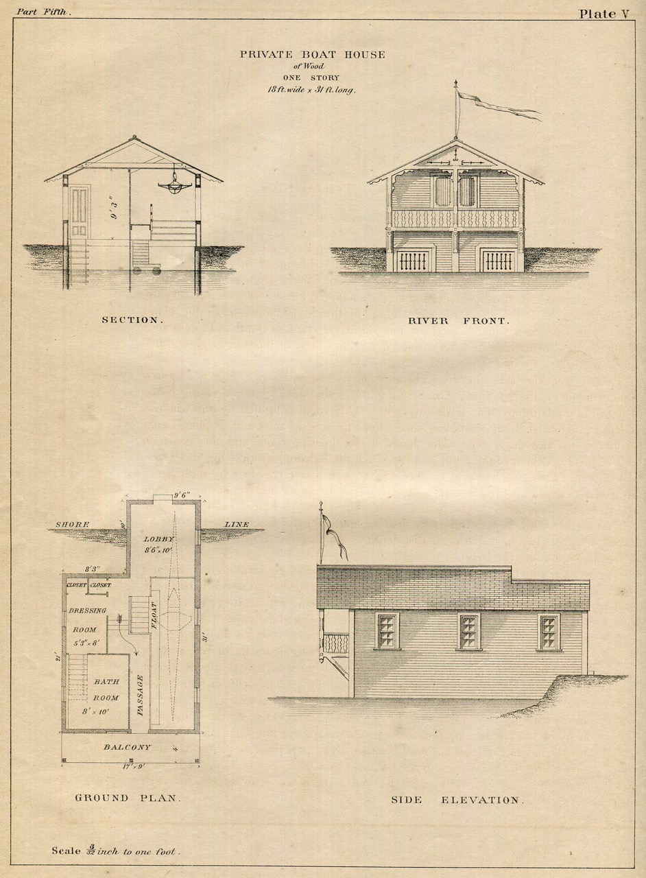 Hints on the construction of Boat Houses, with plans and specifications of five, costing from $150 to $500, (with 7 plates.)
