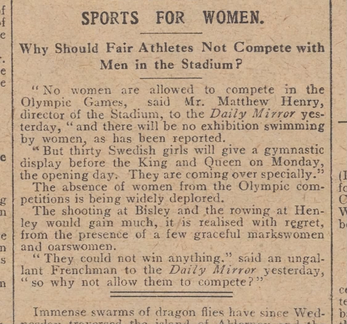 What maybe few people are aware of is that the discussion of women rowing in the Olympics is an old topic. The other day, Olympic historian Hilary Evans sent HTBS a brief notice from the Daily Mirror of London from July 1908. The unknown article writer called for women rowing at the Olympic Games, a four-day event at Henley from 28 to 31 July.
