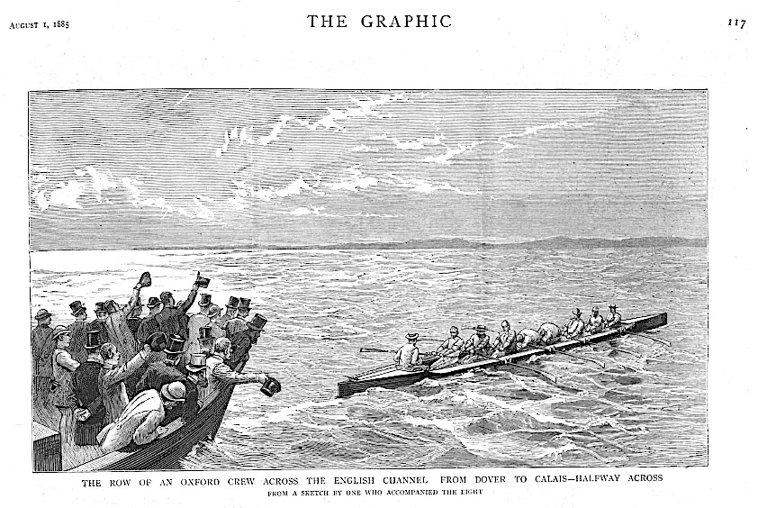 The row from Dover to Calais took place on 25 July 1885 and is captured in a lithograph published in The Graphic newspaper on the following weekend, on 1 August. As can be seen above, two members of the crew were in considerable difficulty!