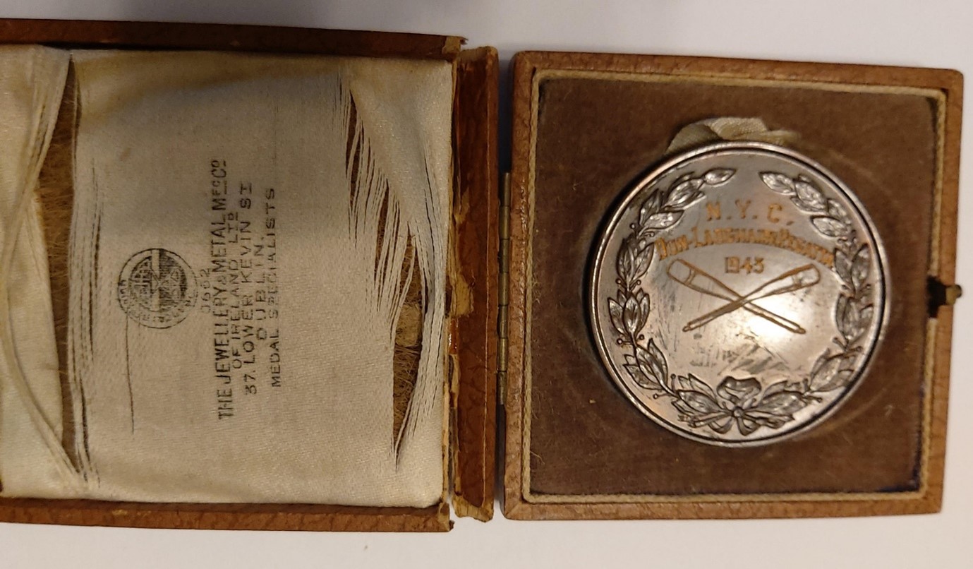 When DRC shut its doors for the final time in 1942, the stalwarts of the club who wished to continue rowing had a simple choice – jump the hedge and join Neptune – or join Commercial Rowing Club, who had moved into DRC’s recently vacated premises. Among the pictures that Frank sent me was a medal for the 1943 regatta held in Dún Laoghaire by the National Yacht Club (NYC). Poirot was back in business. The Irish Rowing Archives has a wealth of resources for me to call on, including programmes from this regatta. Commercial had several crews racing that day, but Gerry was not named in any of them. Programmes are not always a reliable source of crew names, and Commercial had many crews coxed by the same man, so it’s possible that Gerry picked up a race and a pot. Several programmes from 1944 and 1945, including those of the NYC and Dublin Metropolitan Regattas do have Gerry coxing for Commercial.