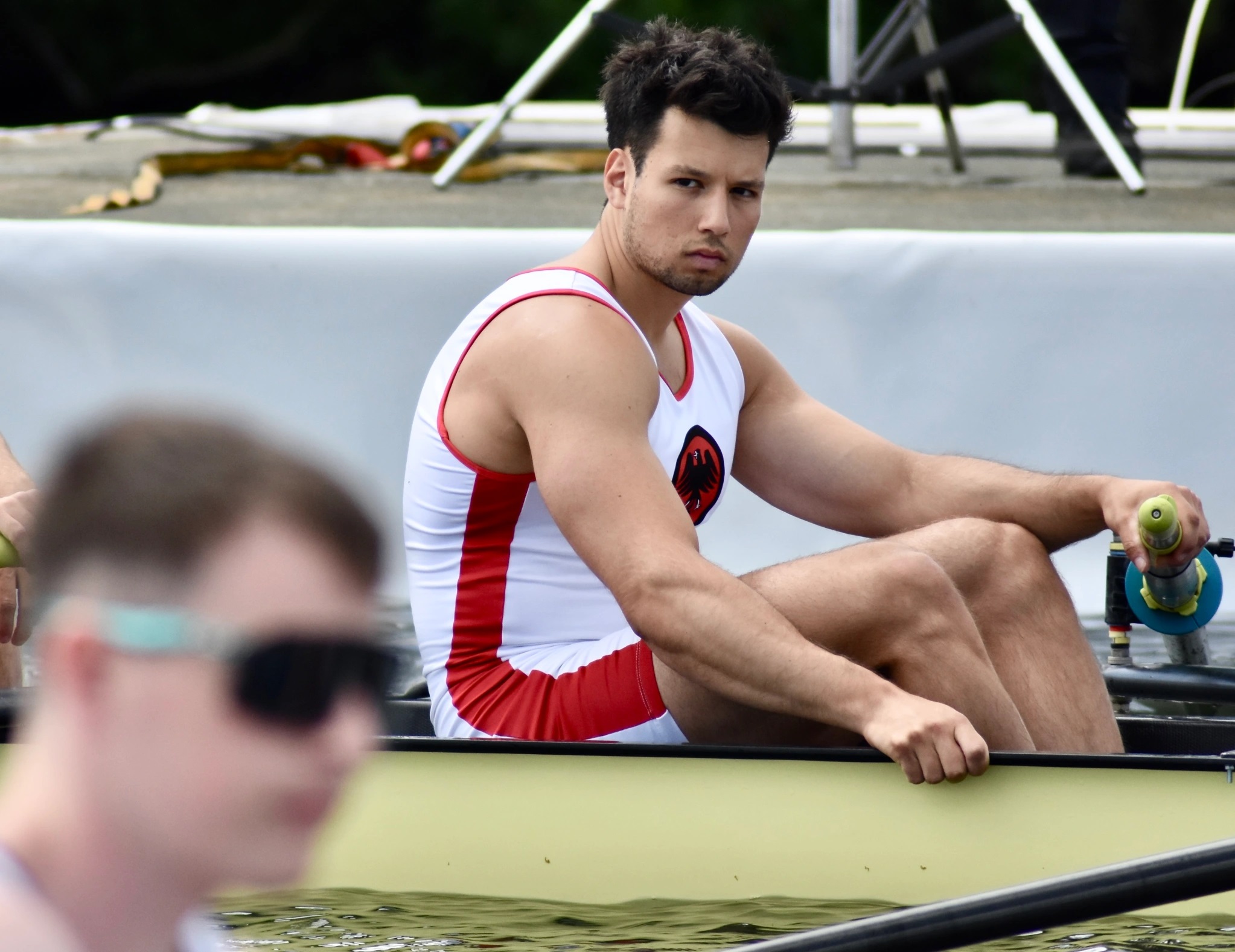 2024 was a famously wet Henley.“I like work; it fascinates me. I can sit and look at it for hours.” Jerome K. Jerome, Three Men in a Boat.A member of the Der Hamburger und Germania Ruder Club, Germany, crew checks out the opposition in the form of Tyne Amateur Rowing Club before their heat of the Thames Cup.