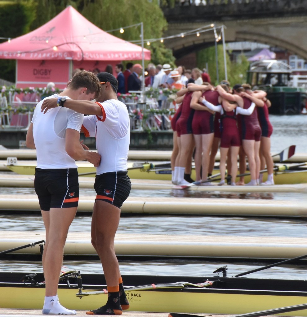 After winning the Temple Challenge Cup, Oxford Brookes University (in background) celebrate with a group hug while, in the foreground, two members of the defeated Princeton University crew console each other with a less joyous embrace.