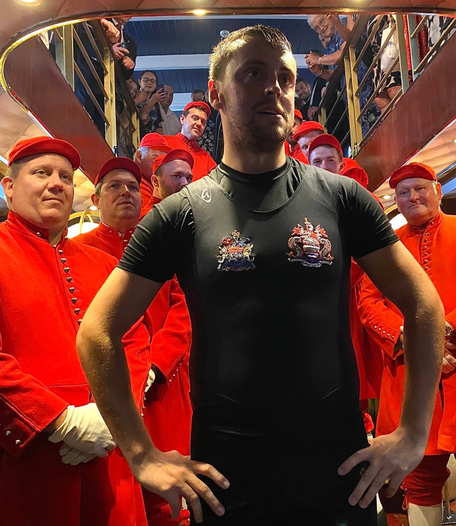 The PS Elizabethan followed the race carrying former winners (who have a privileged viewing spot at the bow), members of the Watermen’s Company and friends and family of the competitors. On board the Elizabethan following the race, Ronnie Richardson is welcomed into a very exclusive club by some former winners.