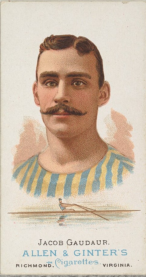 In October and November 2021, Bill Lanouette was on a book tour on the East coast promoting his brilliant The Triumph of the Amateurs: The Rise, Ruin, and Banishment of Professional Rowing in the Gilded Age, which was published by Lyons Press. One evening in the beginning of November, Bill was discussing and signing his book at Yale University Bookstore in New Haven. Tom, who lived outside of town, was of course there. For the event, Tom brought with him a mannequin on which he had put on a white tank top decorated with some medals from his vast collection. He also put a face on the mannequin, the face of Jacob “Jake” Gaudaur (1858 – 1937), the Canadian professional world champion sculler.