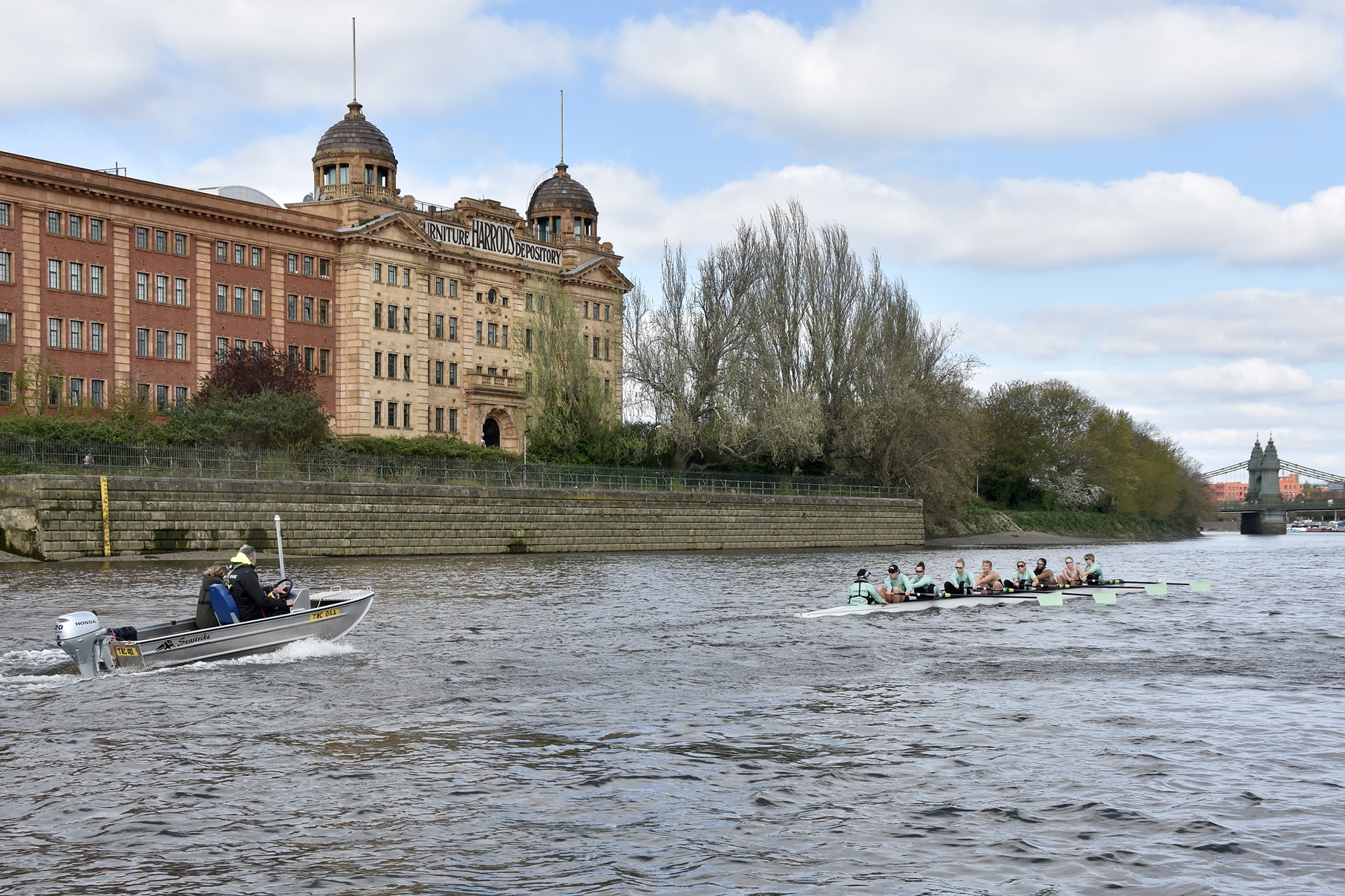 The Cambridge Blue Boat turns near Chiswick Steps watched by those in the media launch.By Chiswick Church.A quick burst from Cox, Ollie Boyne; Stroke, Douwe de Graaf; 7, Simon Hatcher; 6, James Robson; 5, George Bourne; 4, Gabriel Mahler; 3, Luke Beever; 2, Noam Mouelle; Bow, Luca Ferraro.A debrief by Coach Baker back at the boathouse.