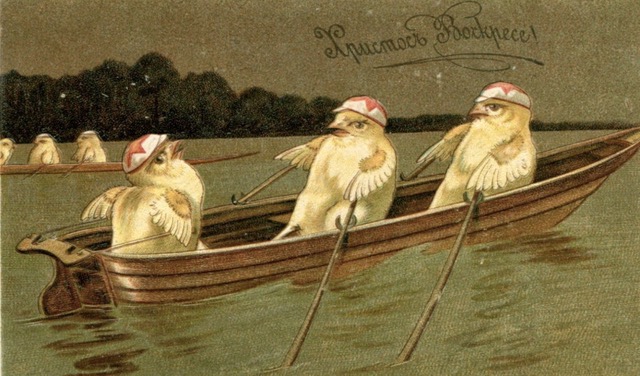 Rowing historian Bill Lanouette has informed HTBS that the phrase you see on the card is in Cyrillic and says, “Christ is risen!” Further, Bill says that this year Western and Orthodox Easter are on the same day.