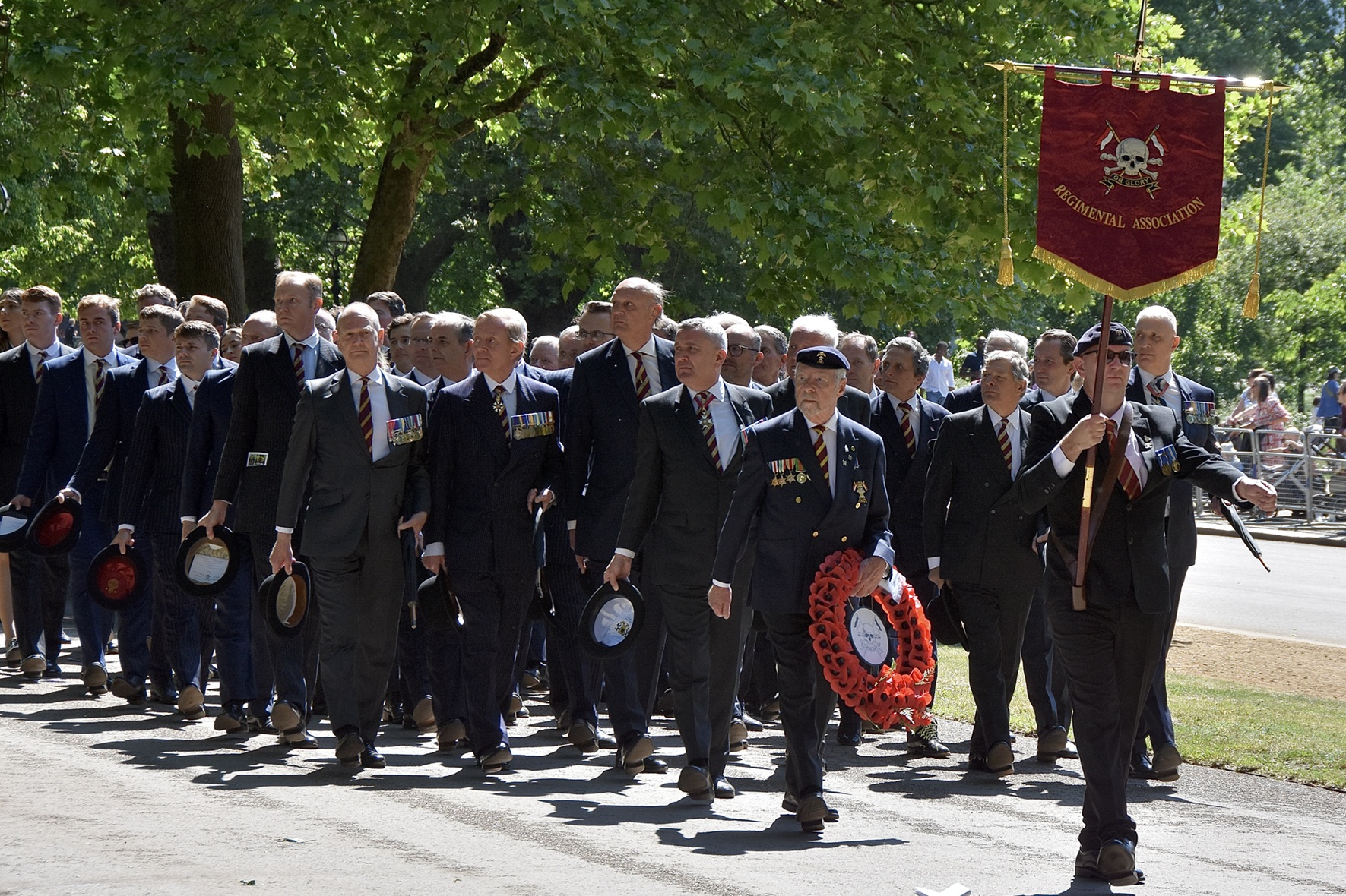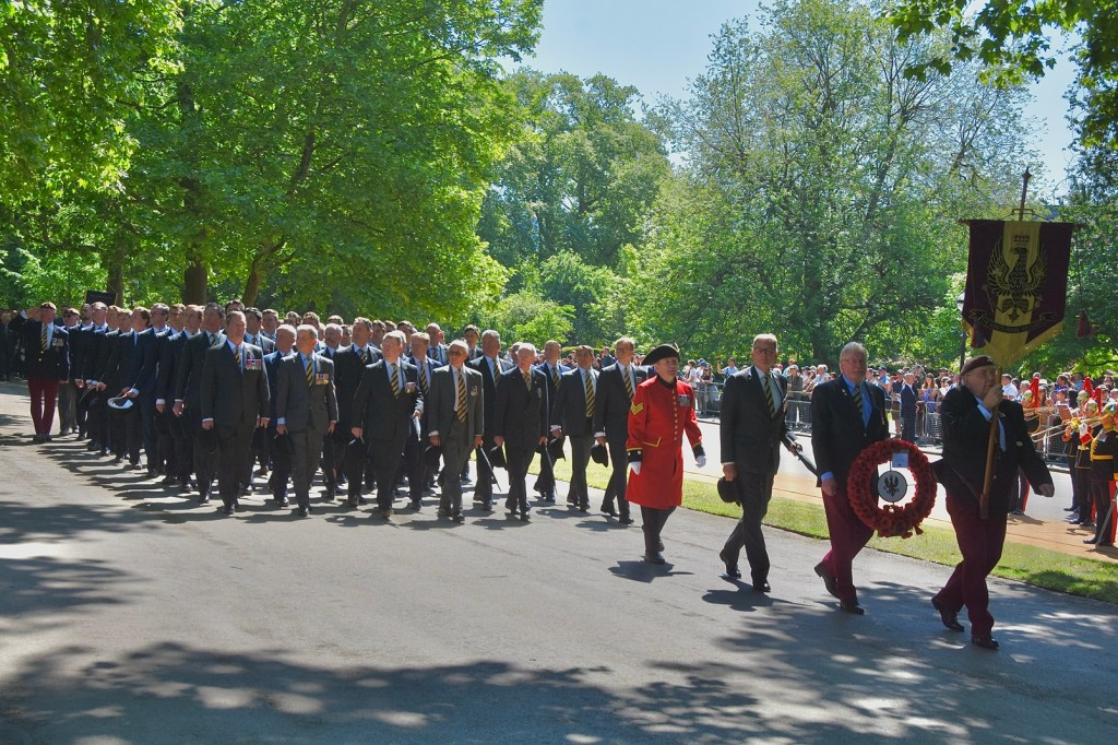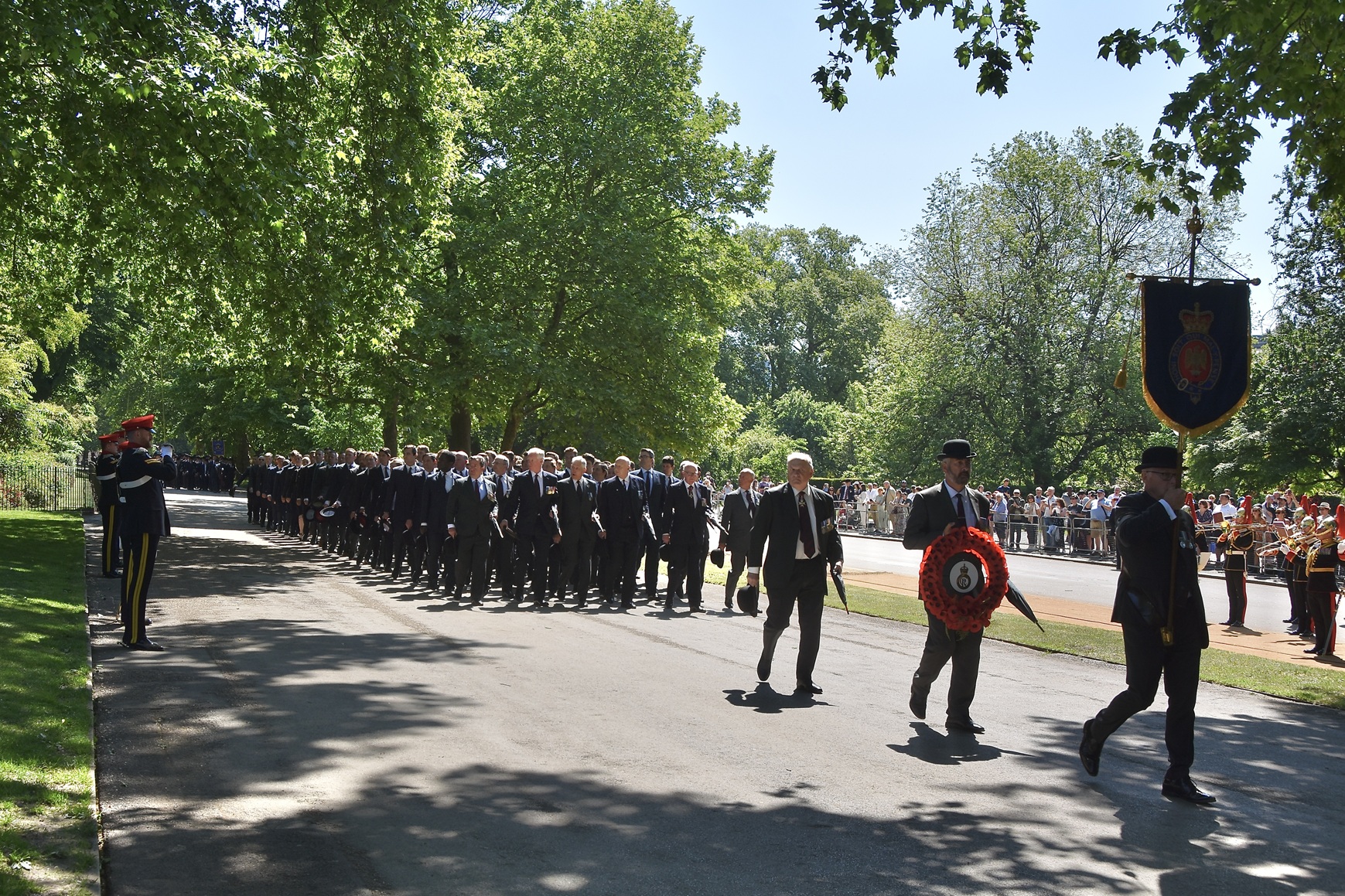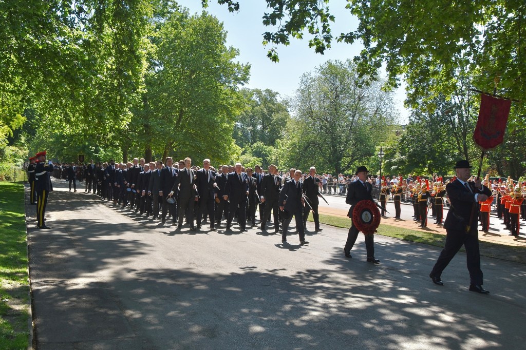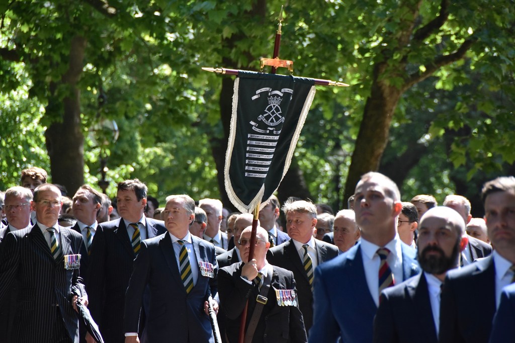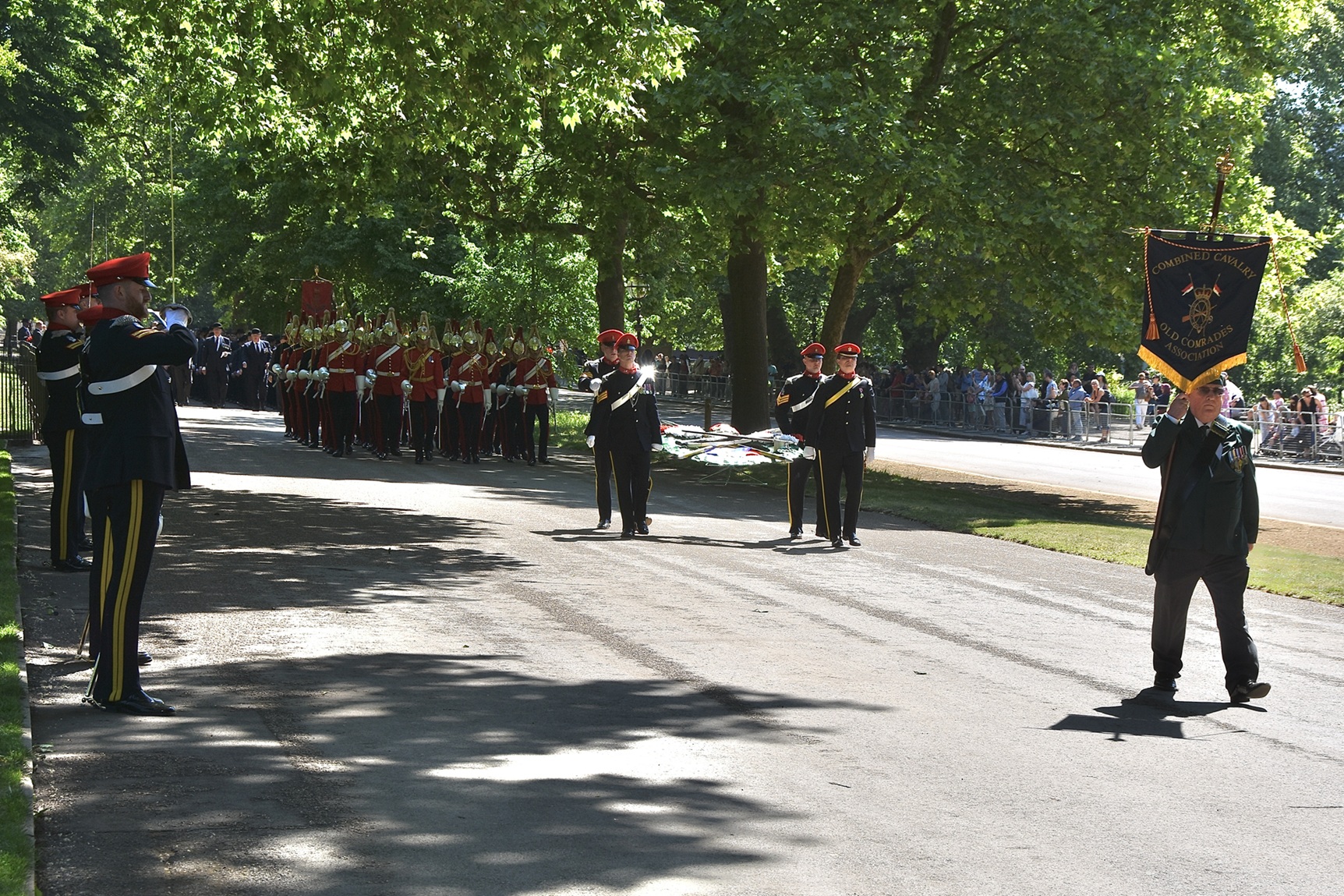 Pictured on 11 May, the Combined Cavalry Old Comrades Association’s banner leads its annual parade to remember cavalrymen killed in action since 1914. It is followed by four members of this year’s sponsoring regiments, The Queen’s Royal Hussars, carrying the Association’s wreath. Behind them are dismounted serving members of The Life Guards and The Blues & Royals, collectively the Household Cavalry. They will be followed by regimental associations in strict order of precedence.