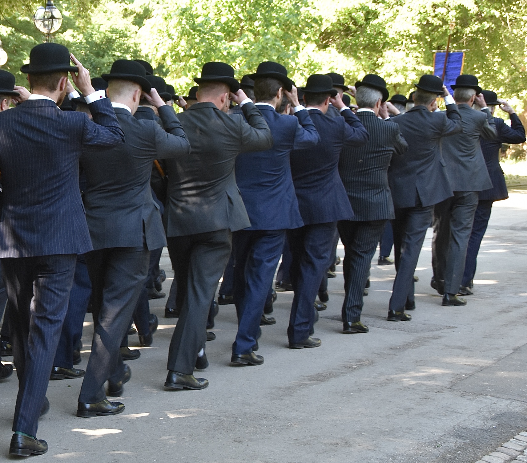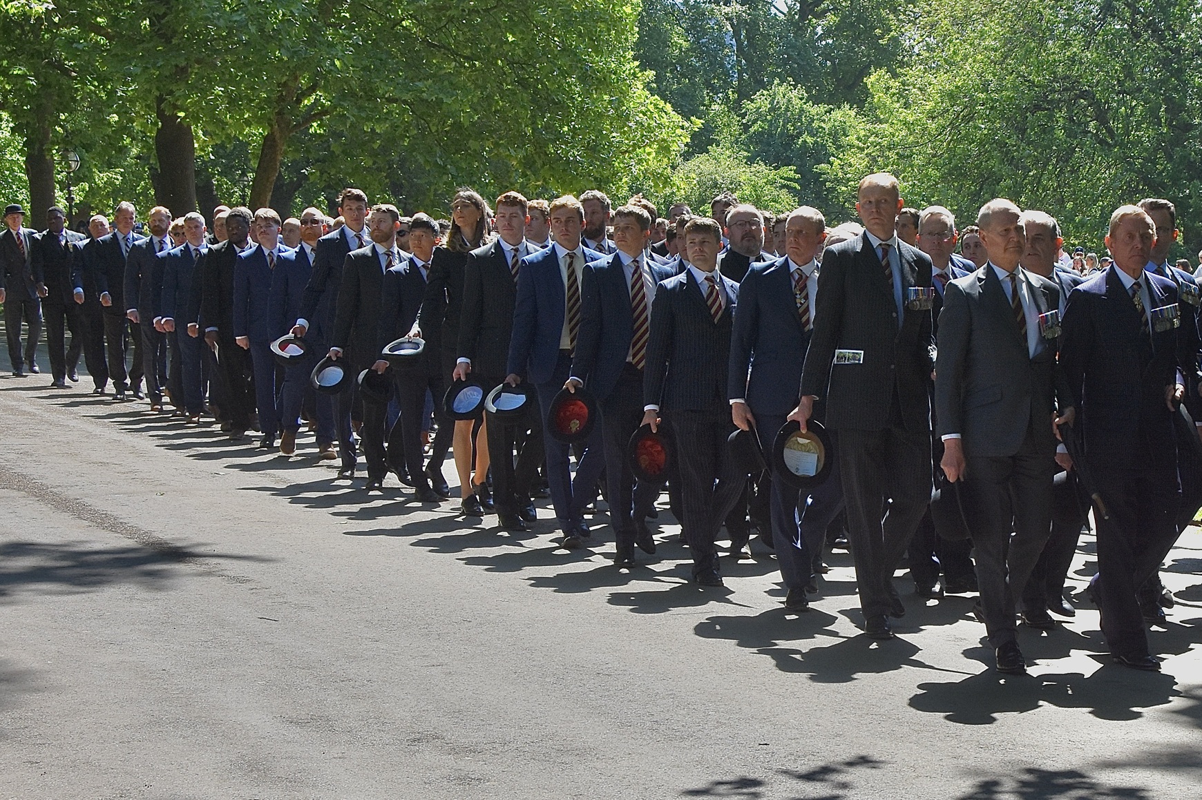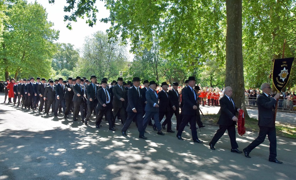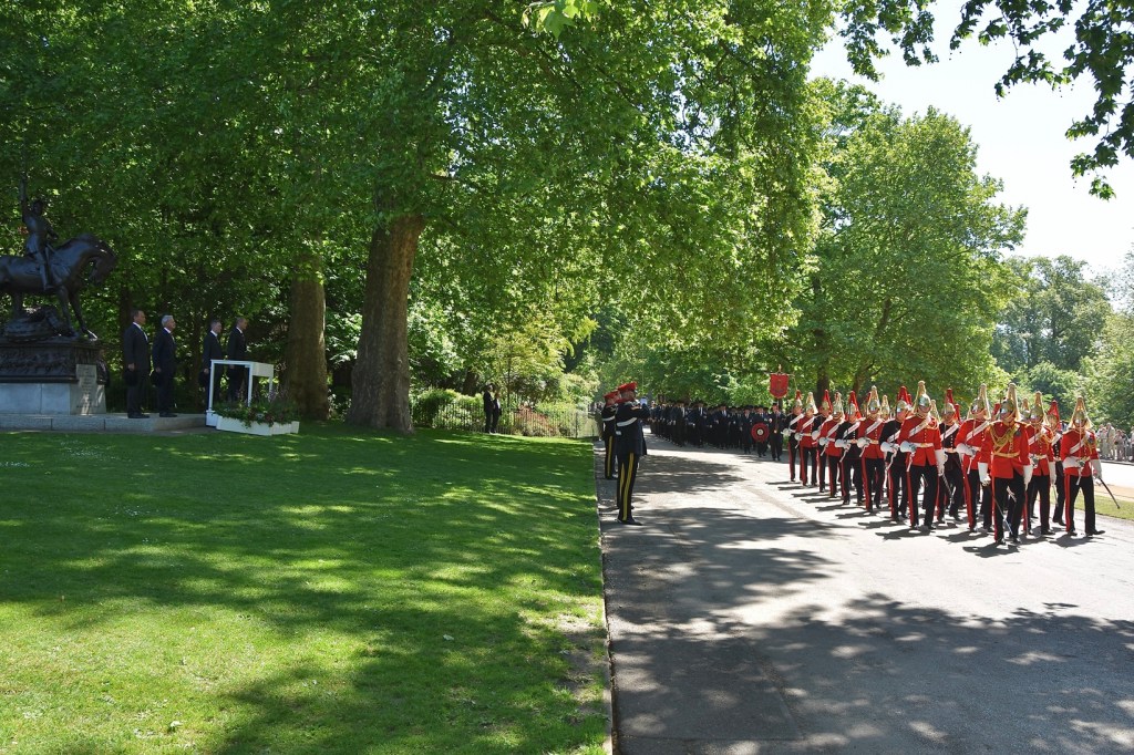 The Life Guards are the British Army’s most senior regiment with its origins going back to 1658.Passing the saluting base – eyes right, civilian hats off.