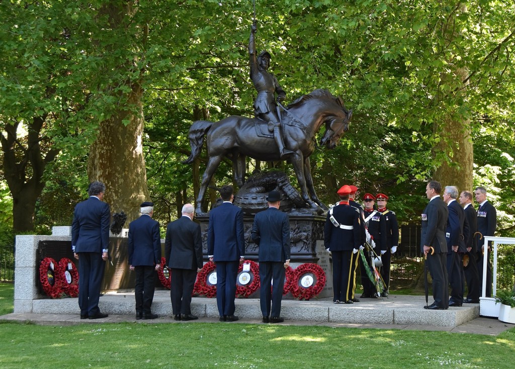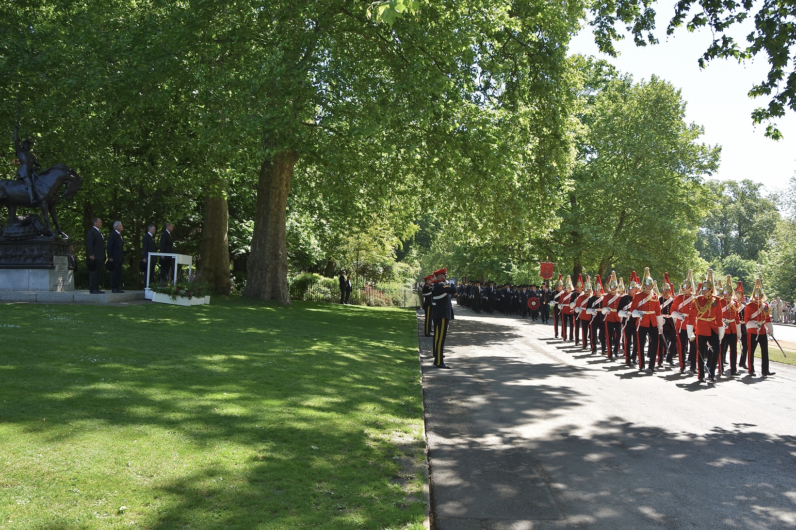 Serving members of the Household Cavalry pass the Cavalry Memorial and the saluting base where Prince Edward, Duke of Edinburgh, Colonel-in-Chief of the Queen’s Royal Hussars, took the salute.