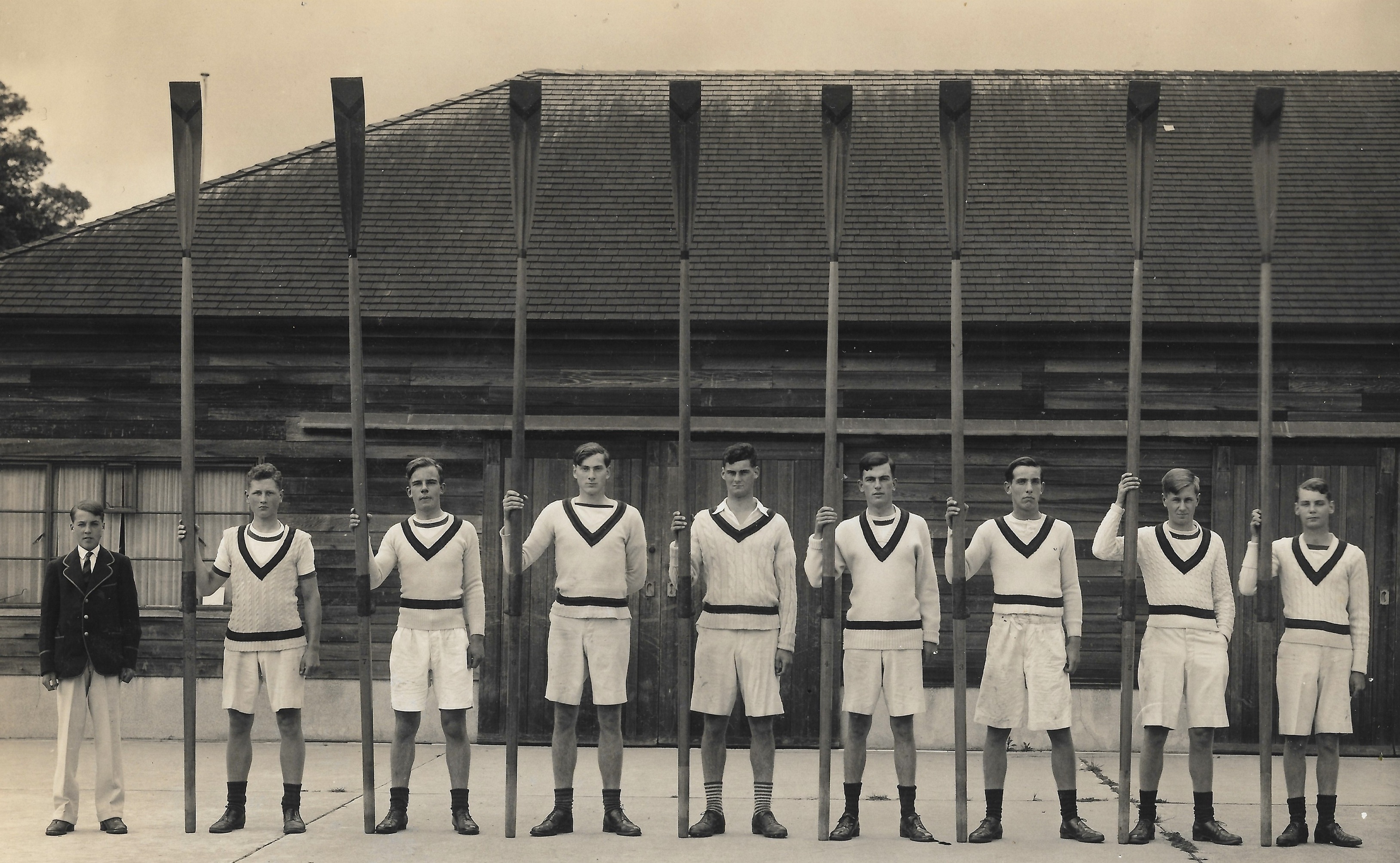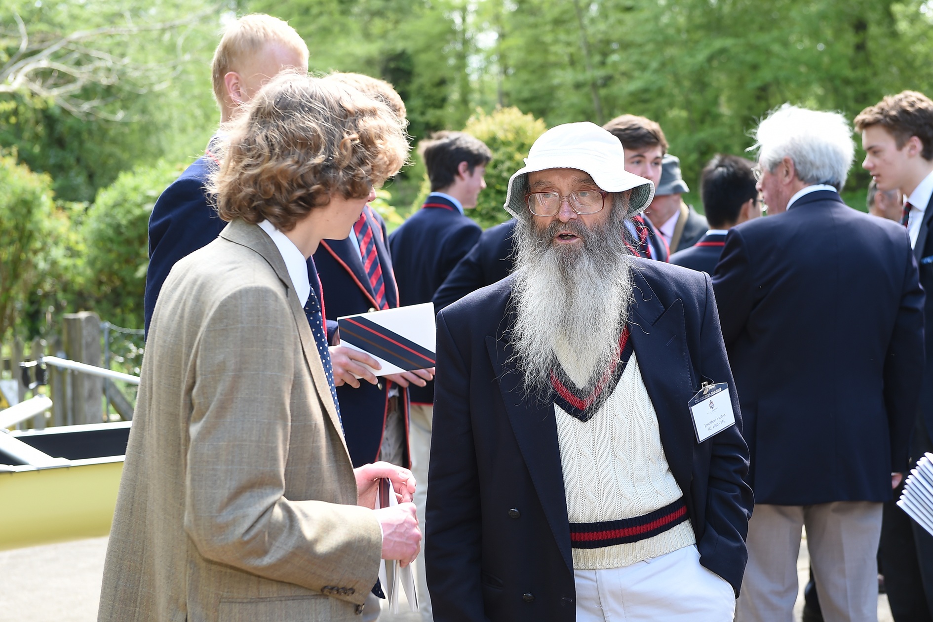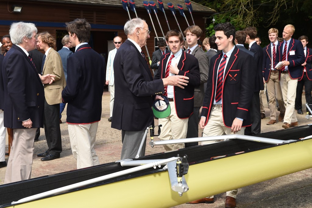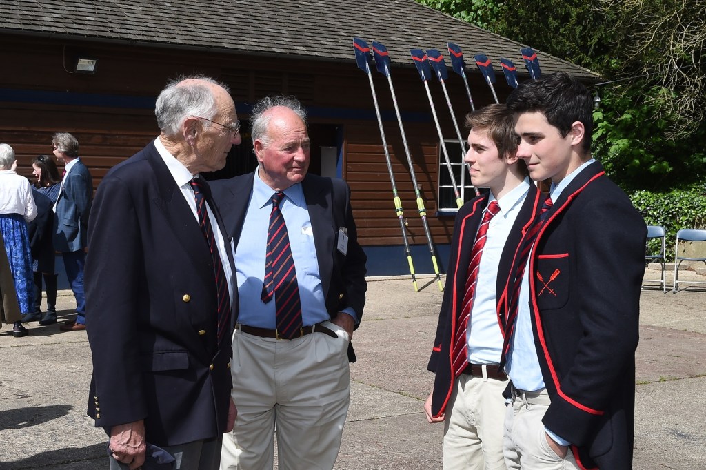 After lunch we proceeded to Boat Club where we were received by members of three of the current School rowing squads and their coaches. The respect and admiration between the two groups was mutual – the tallest in the party, with a fine physique for rowing, was the current President of Boat Club, Jonathan Johansen, and the enthusiasm and devotion and will to win in the current squad was striking. The Boat House appeared superficially unchanged, but all those colourful, sleek and shining shells amazed the old guard; no heavy tub fours or beamy second-hand clinker skiffs to be seen. It’s all quad sculls and whiffs for the Under 15s these days. And the dreaded rowing machines for torture – very professional. The squad was in especially good spirits having just had a successful weekend at Wallingford Regatta on the Dorney Rowing Lake.