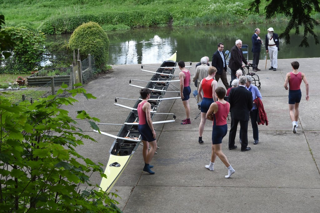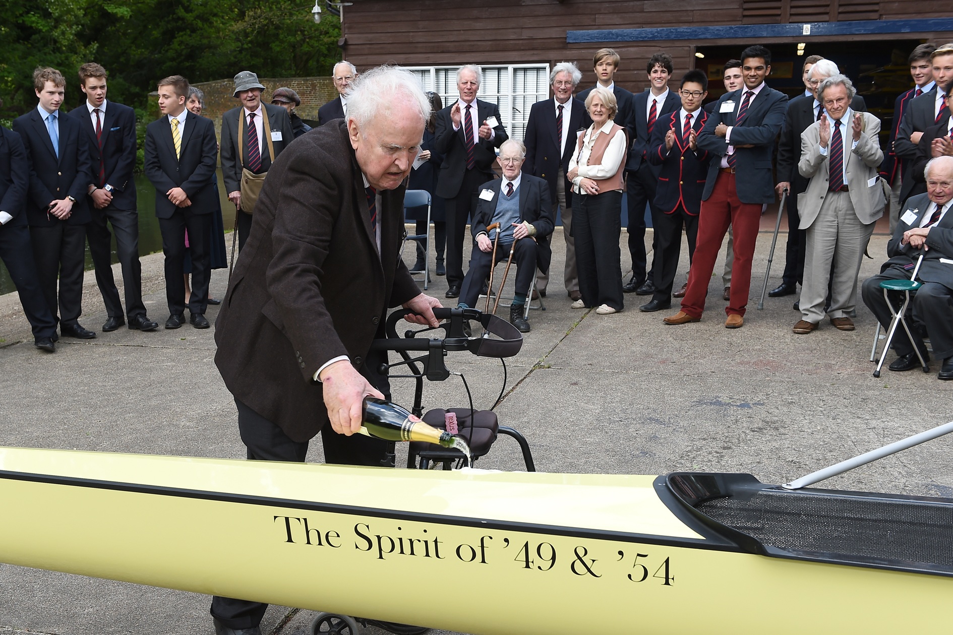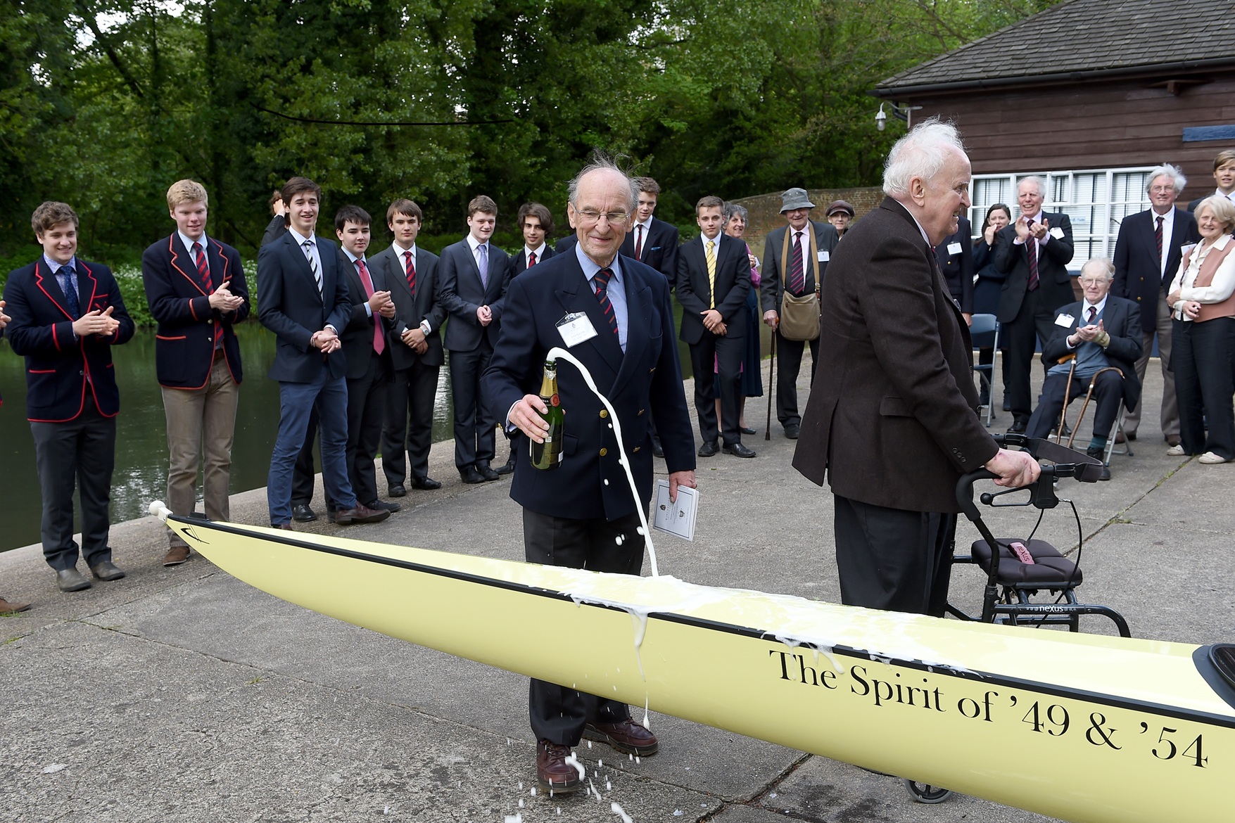 That led fittingly to the naming ceremony of the new School eight, gleaming on its trestles on the hard, and proudly bearing the name Spriit of ’49 & ’54. Champagne was duly poured over the bows by Presidents Breyfogle (’49) and Sutcliffe (’54) – without any unseemly shaking and squirting, thus leaving some for a quiet tipple afterwards.